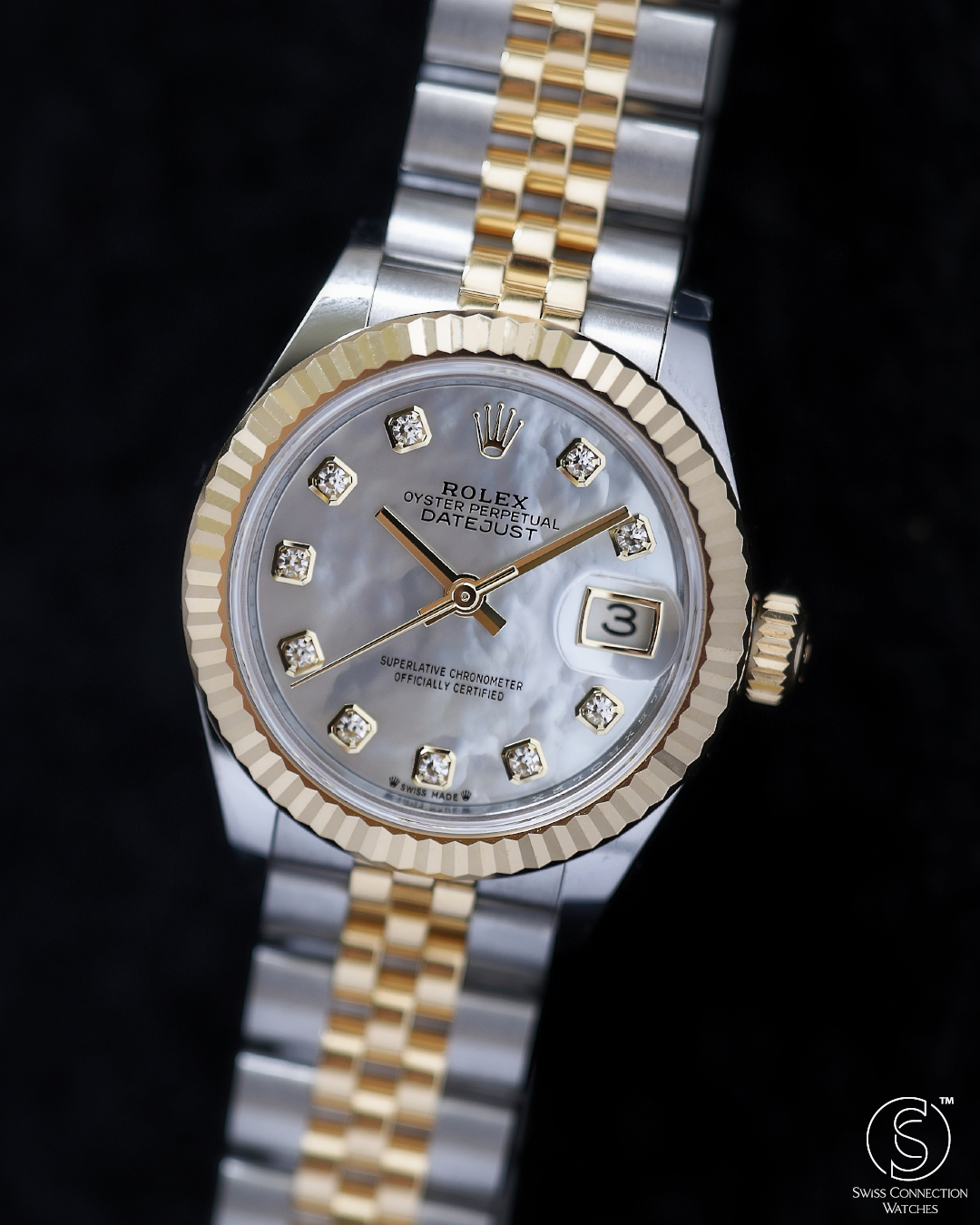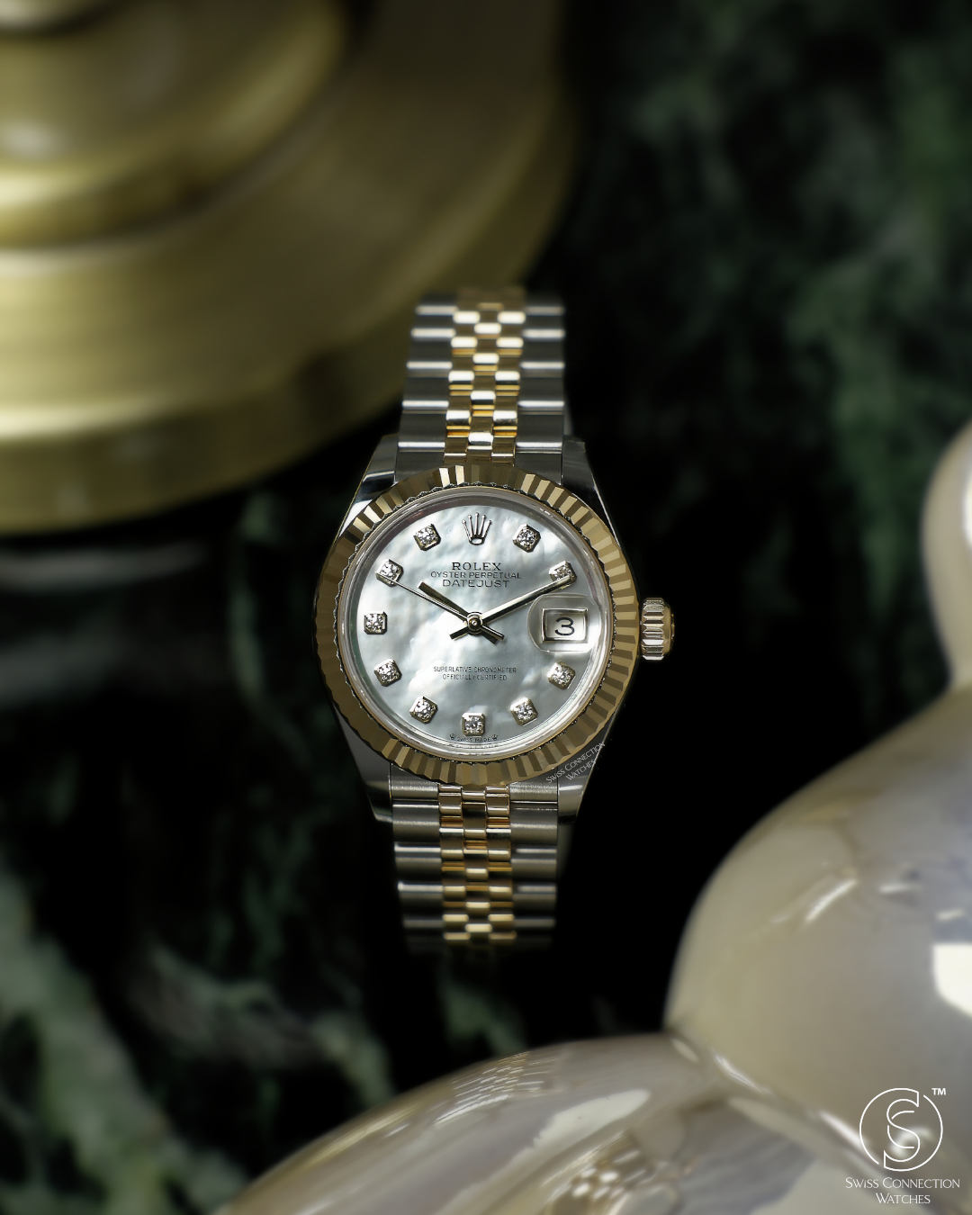 Powering this exquisite timepiece is Rolex's latest in-house automatic movement, ensuring superior precision, durability, and reliability. This movement is certified as a Superlative Chronometer, guaranteeing outstanding performance. With a robust 100-meter water resistance, the Datejust 28 in White Mother of Pearl with 10 Diamonds is more than just a beautiful accessory; it's a dependable and practical timepiece, perfectly balancing cherished tradition with a vibrant, modern spirit and a captivating sparkle.