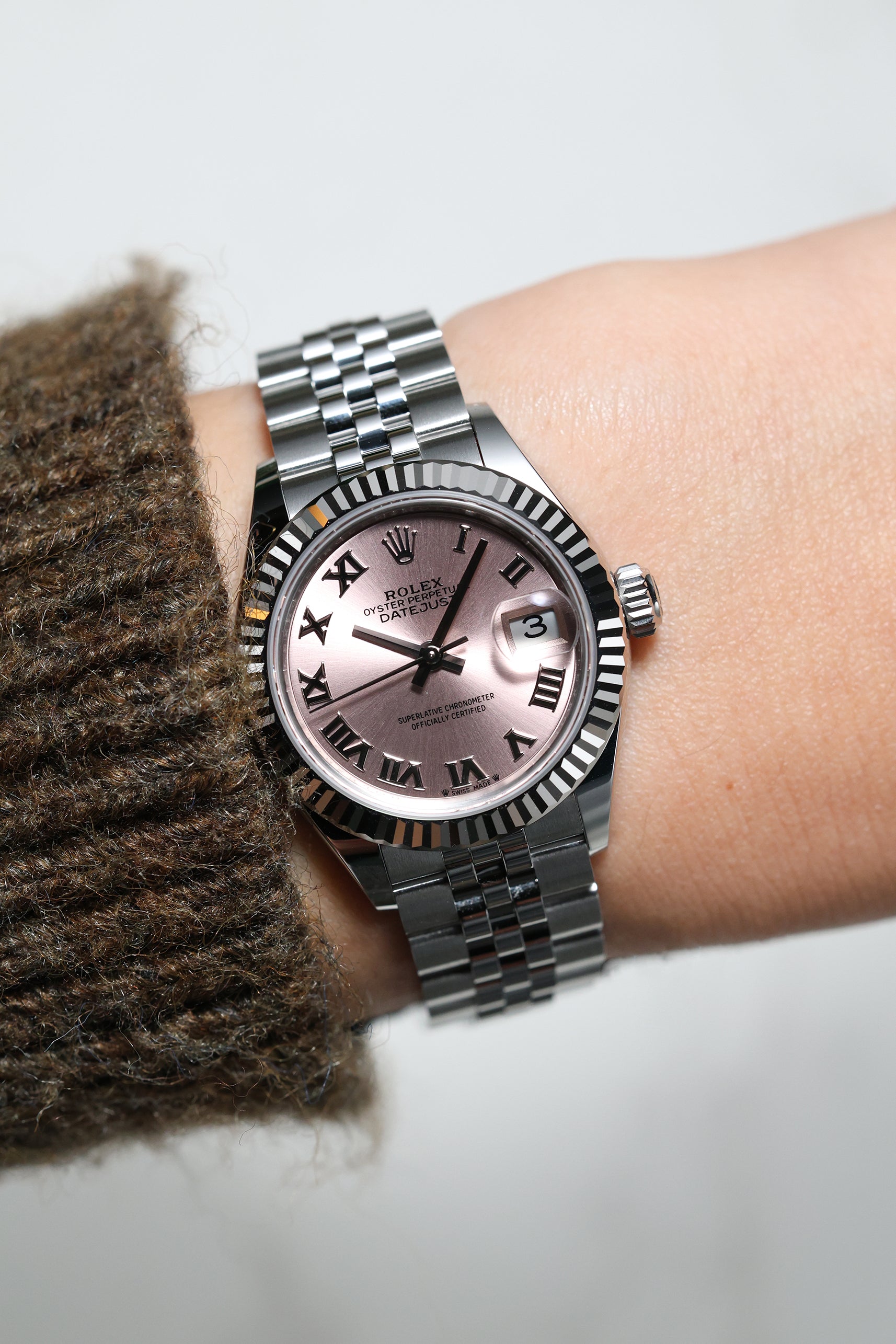 This specific Datejust 28 is a captivating display of vibrant color and refined luxury. The watch features a striking Pink dial with a beautiful sunray finish, which is elegantly adorned with classic Roman numerals. This clean, traditional dial layout provides exceptional clarity and a timeless aesthetic. The iconic 18k white gold fluted bezel brilliantly frames the dial, while the signature Cyclops lens magnifies the date, ensuring clear utility.