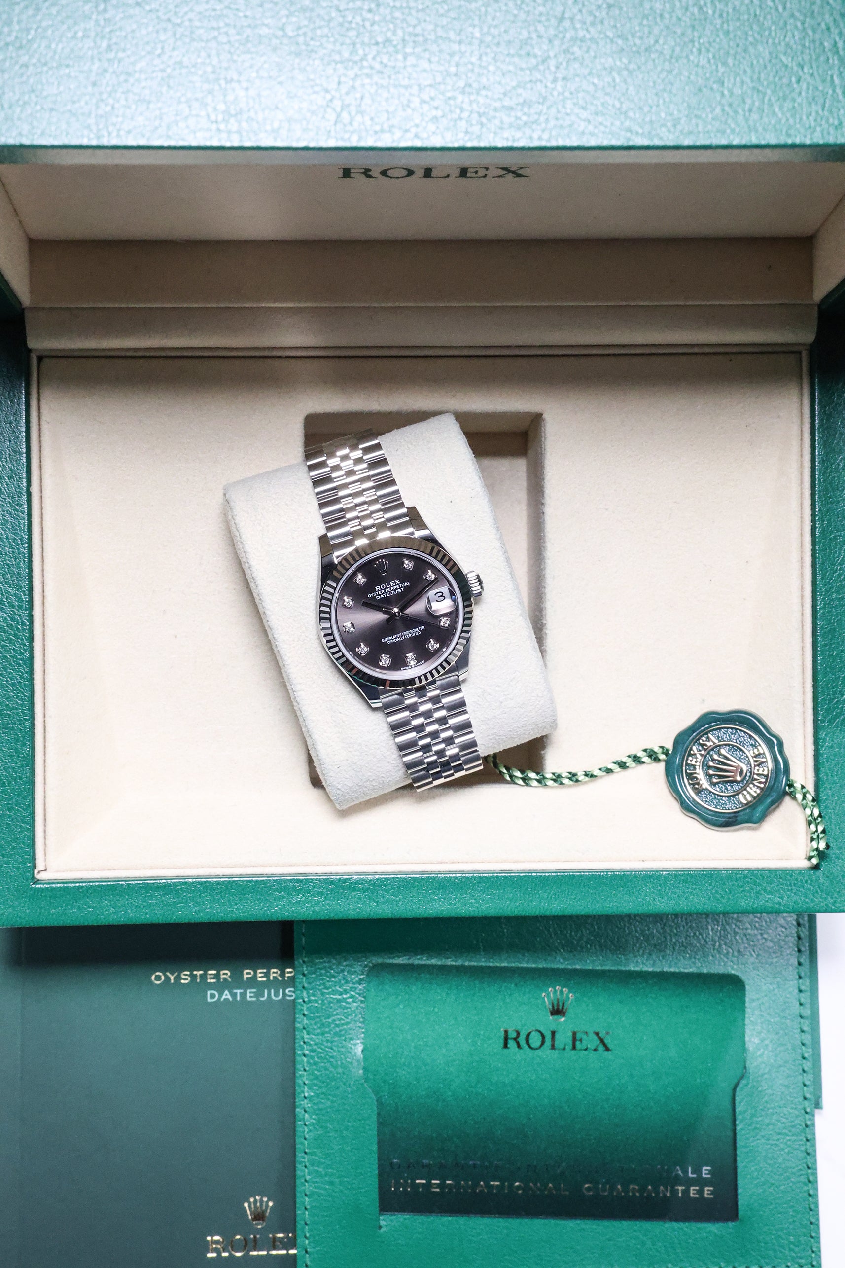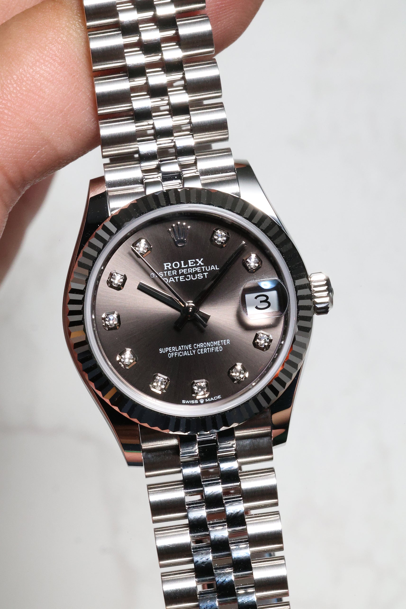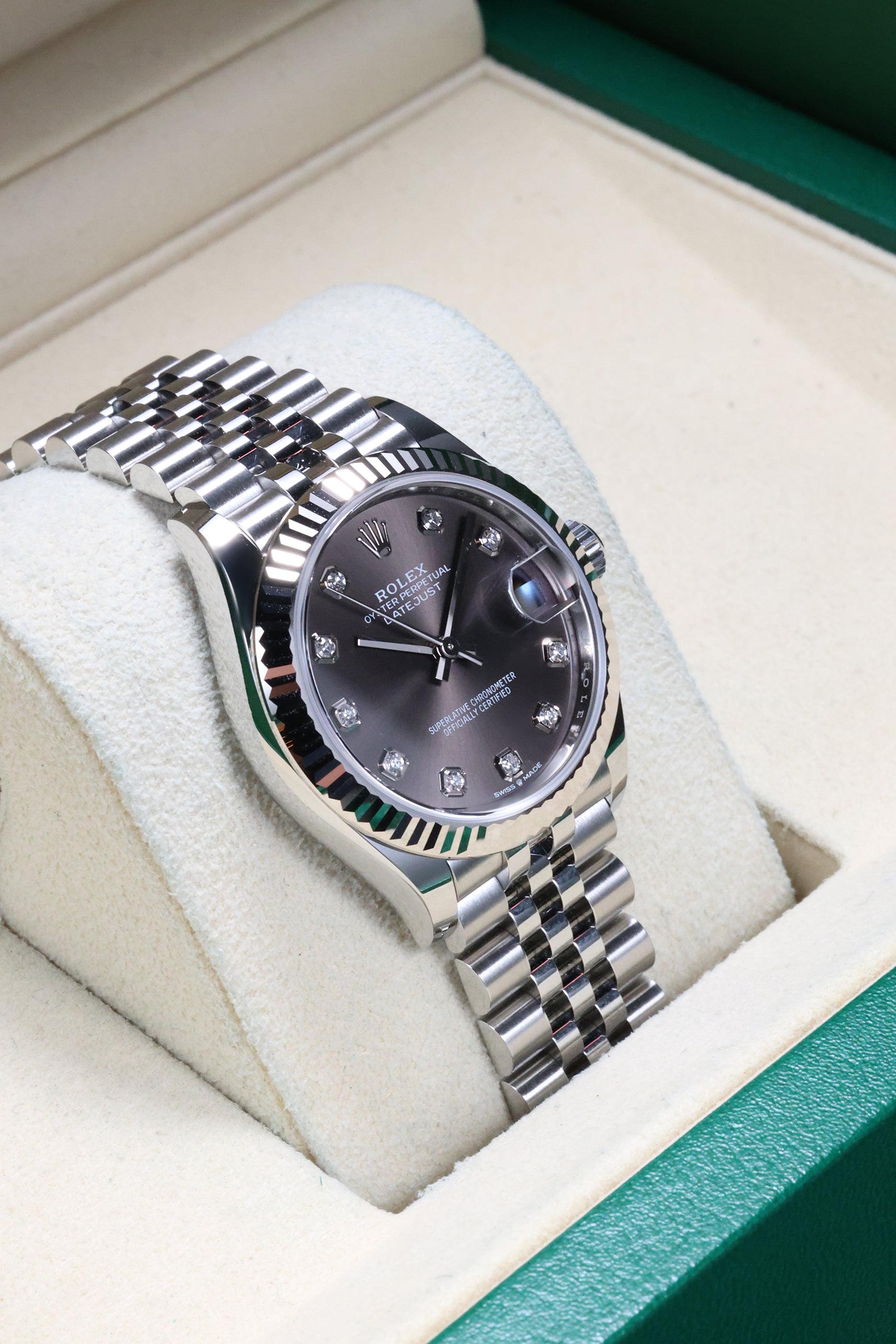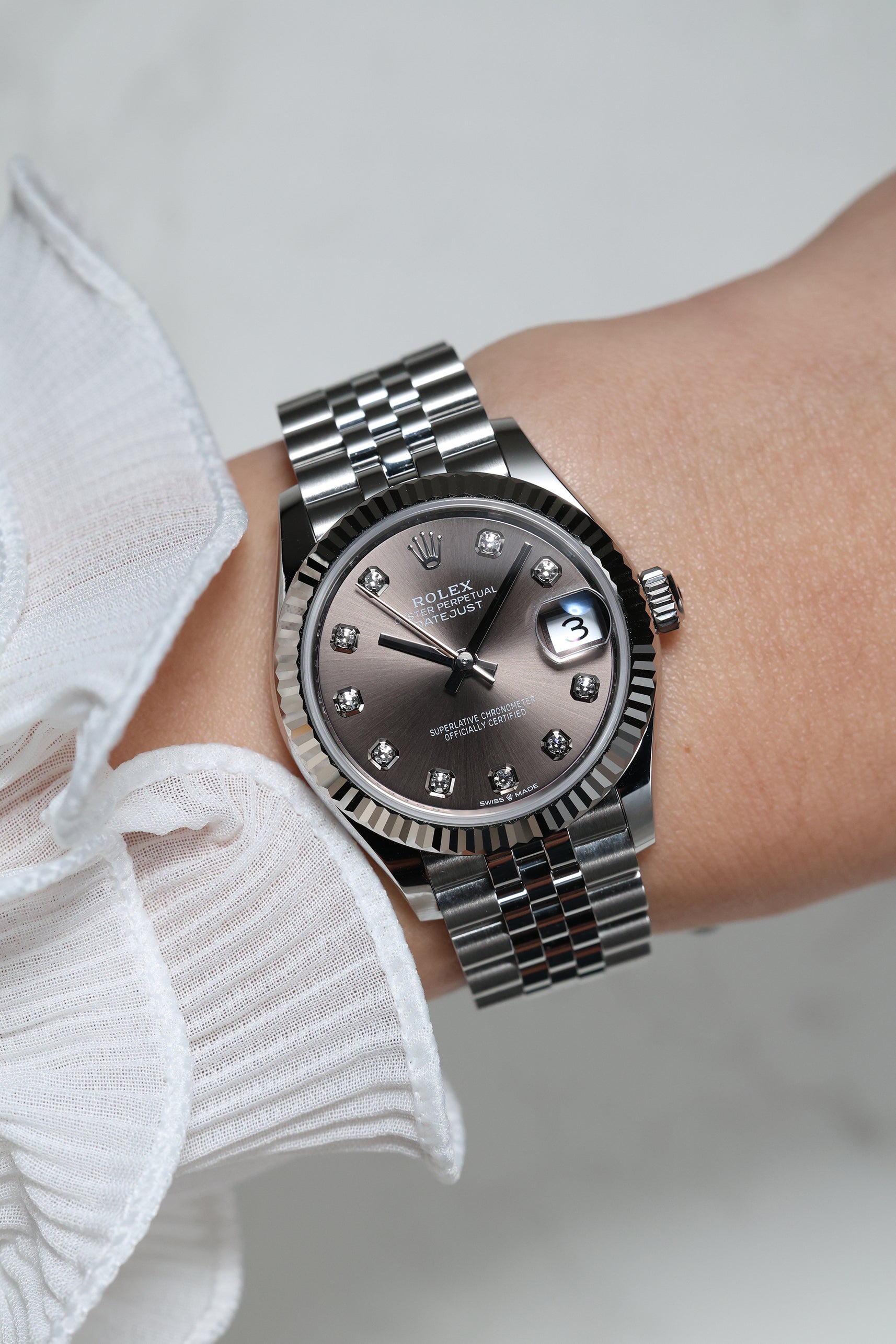 Powering this exquisite timepiece is Rolex's latest generation in-house automatic movement, ensuring superior precision, durability, and reliability. This movement is certified as a Superlative Chronometer, guaranteeing outstanding performance with an enhanced 55-hour power reserve. With a robust 100-meter water resistance, the Datejust 31 in Dark Grey with 10 Diamonds is more than just a beautiful accessory; it's a dependable and practical timepiece, perfectly balancing cherished tradition with a subtle, contemporary sparkle.
