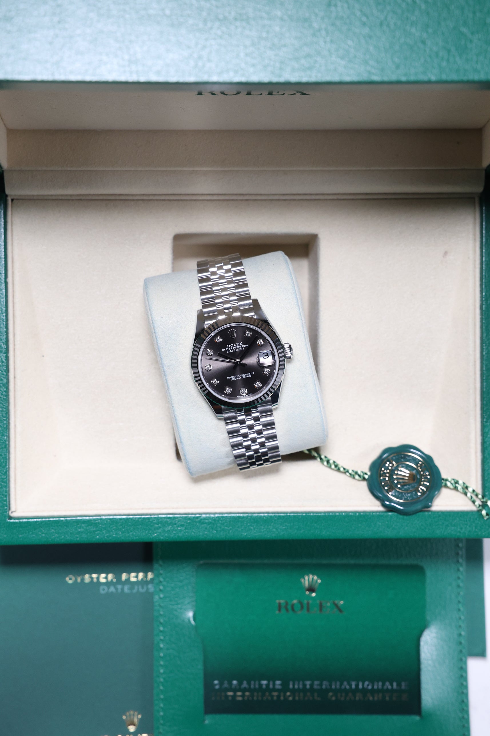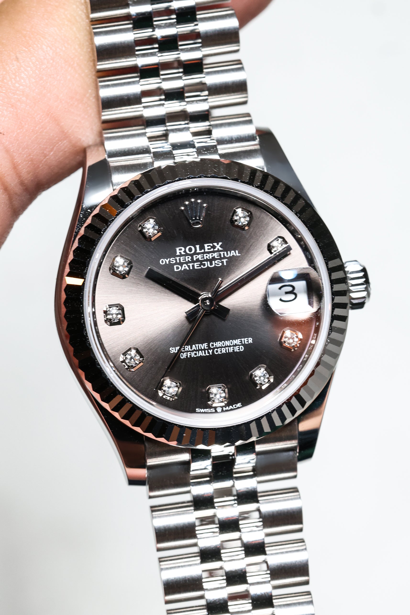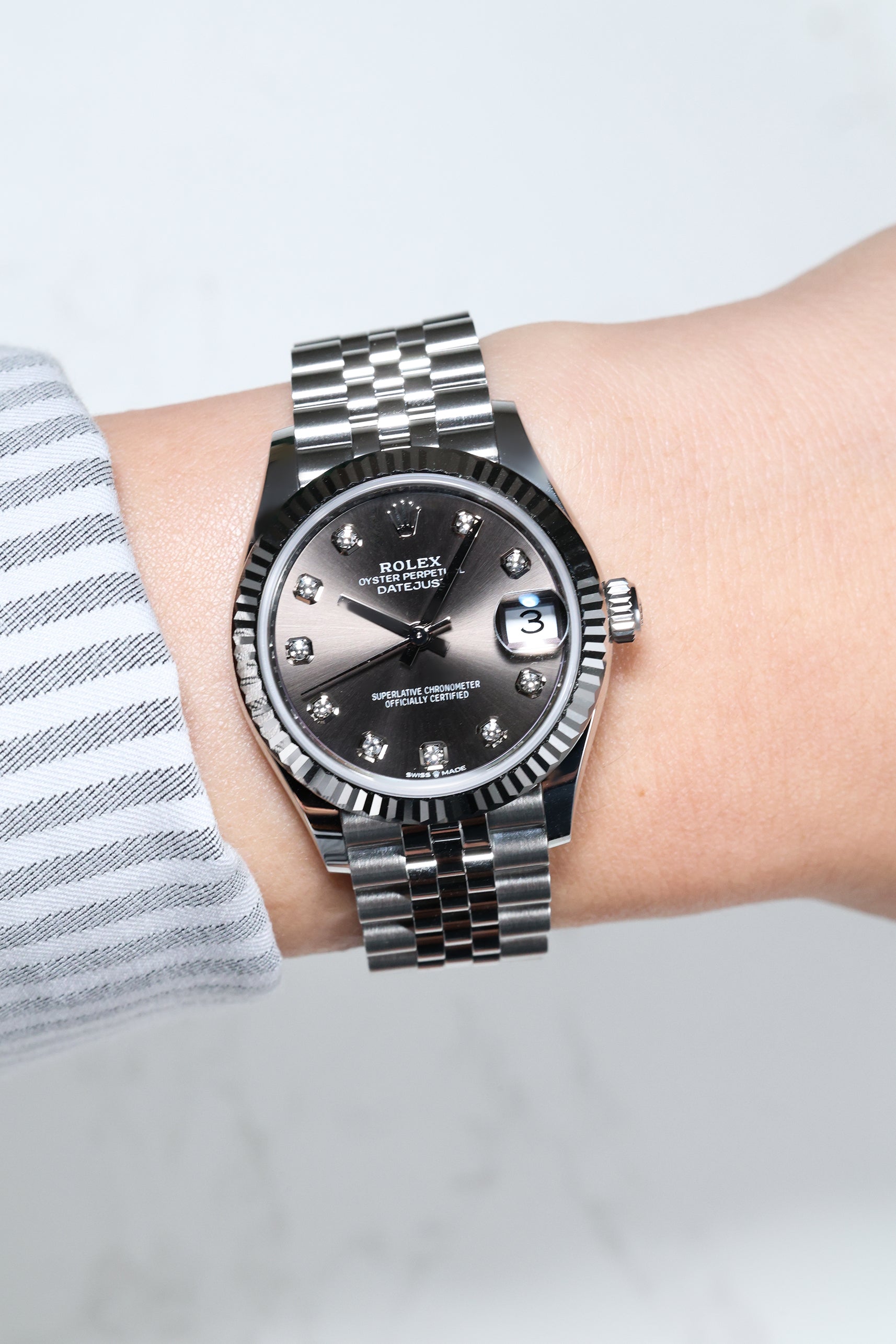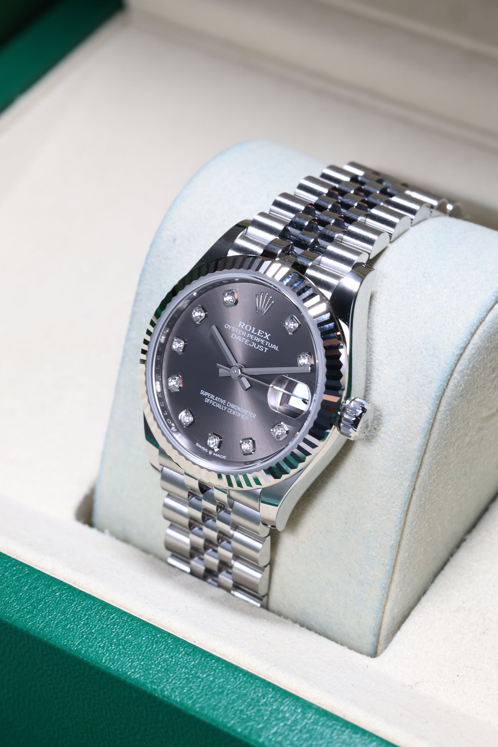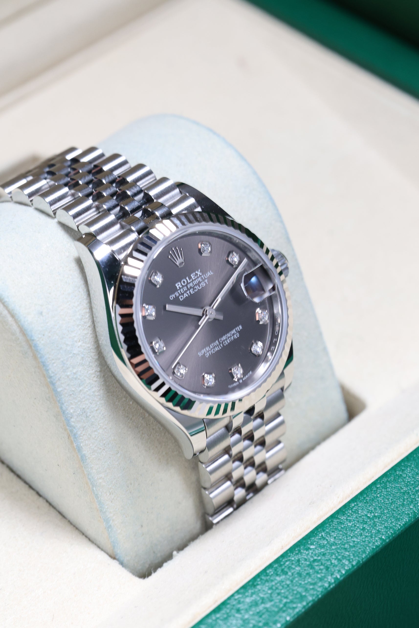 Powering this exquisite timepiece is Rolex's latest generation in-house automatic movement, ensuring superior precision, durability, and reliability. This movement is certified as a Superlative Chronometer, guaranteeing outstanding performance with an enhanced 55-hour power reserve. With a robust 100-meter water resistance, the Datejust 31 in Dark Grey with 10 Diamonds is more than just a beautiful accessory; it's a dependable and practical timepiece, perfectly balancing cherished tradition with a subtle, contemporary sparkle.