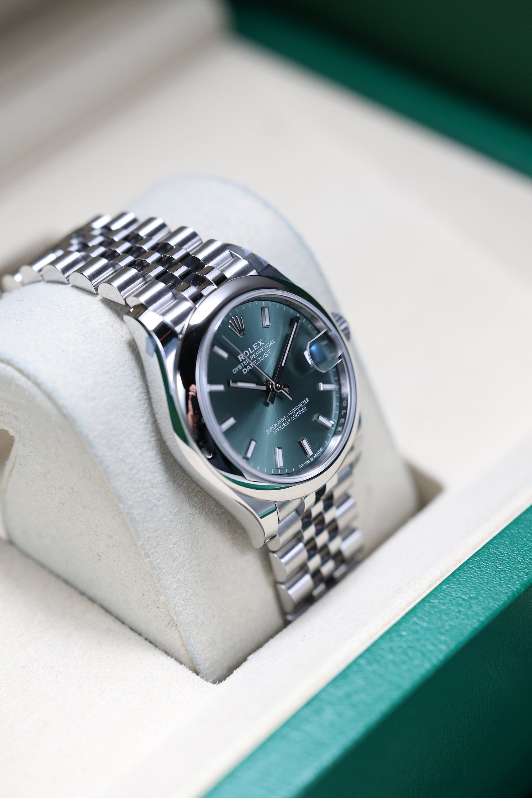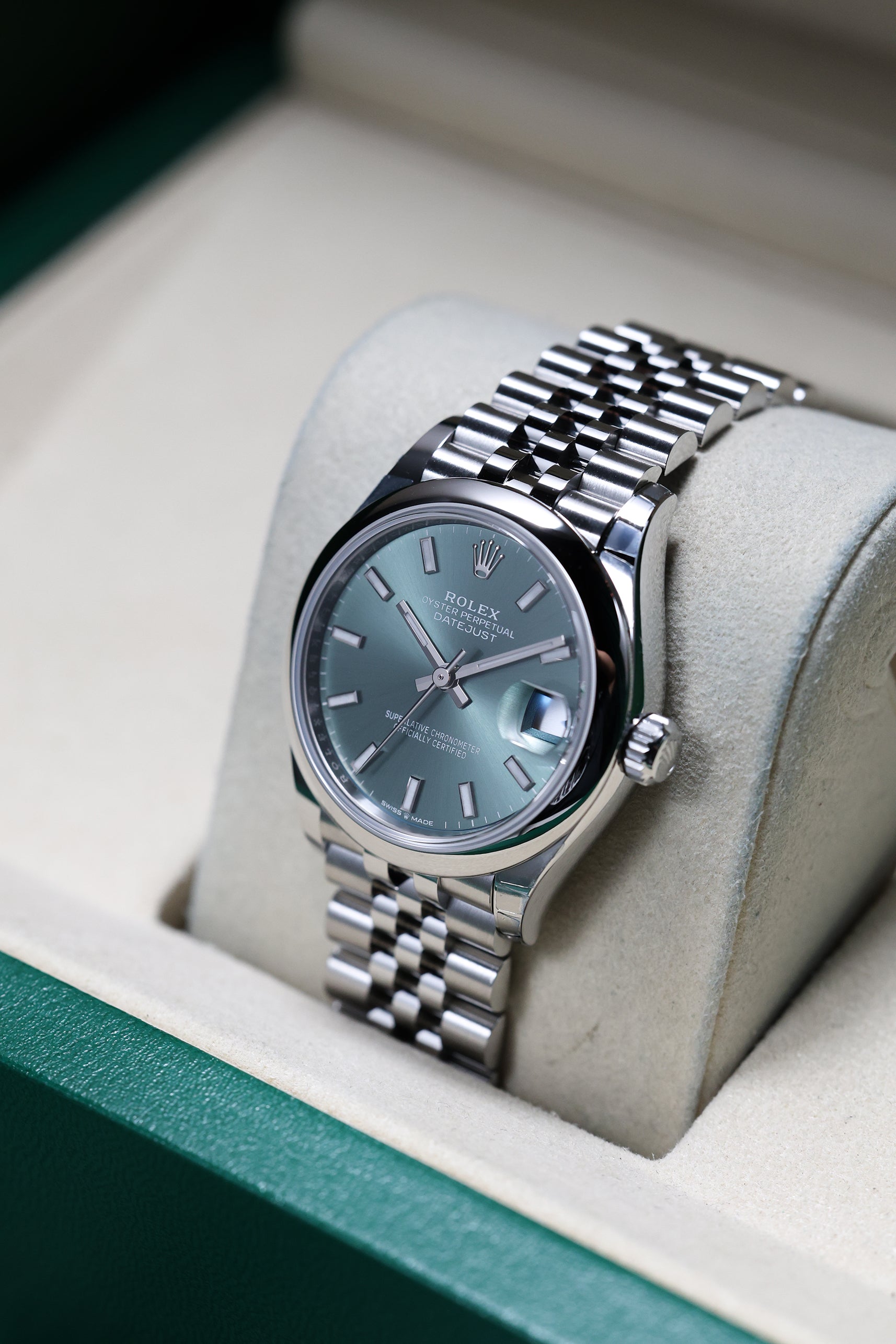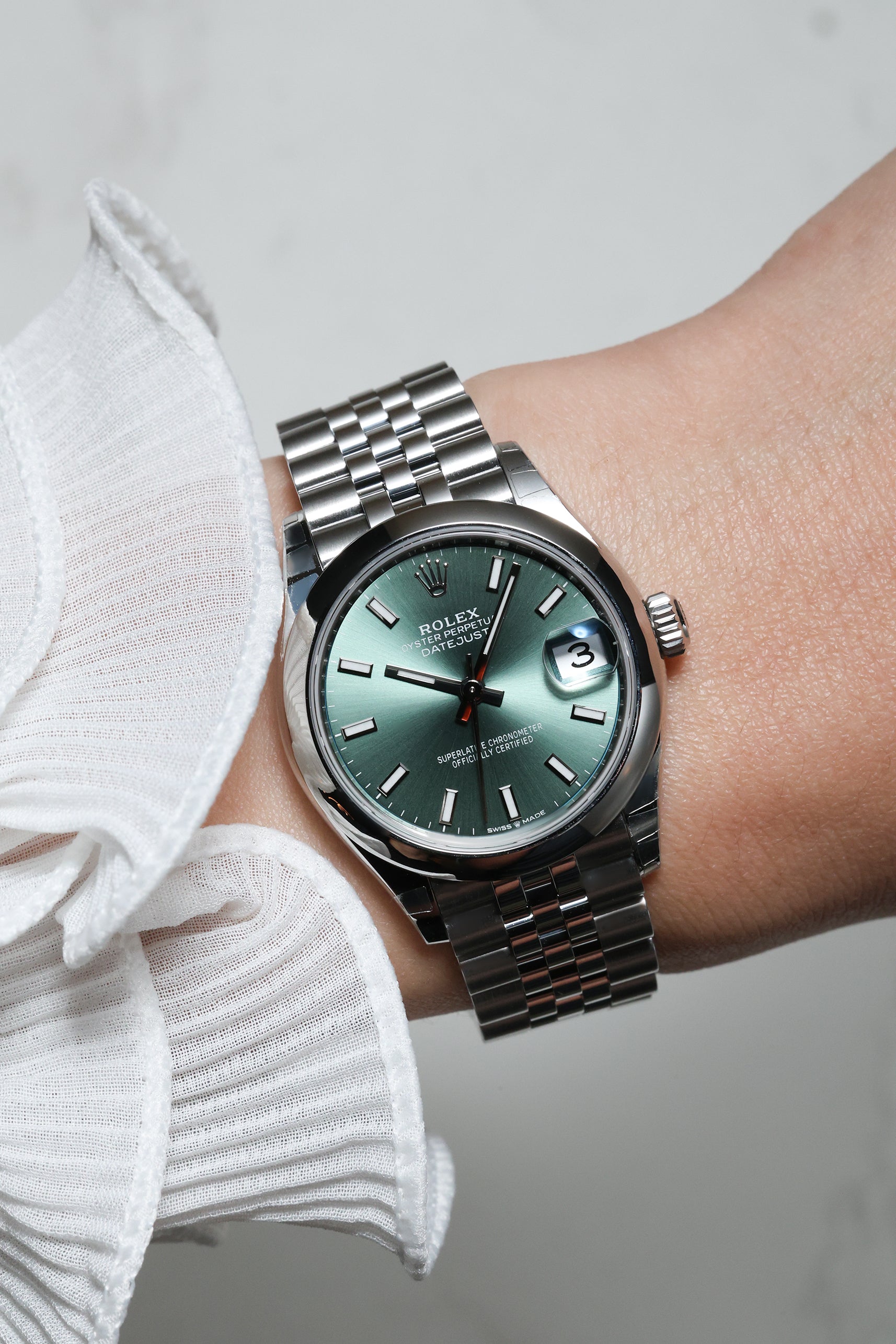 This specific Datejust 31 captivates with its refreshing Mint Green dial. This subtle yet distinctive hue is a contemporary favorite, lending a sense of understated luxury and natural beauty to the classic design. The dial features elegant baton hour markers and polished hands, ensuring excellent legibility and a clean aesthetic, while the iconic domed (smooth) bezel frames the face.