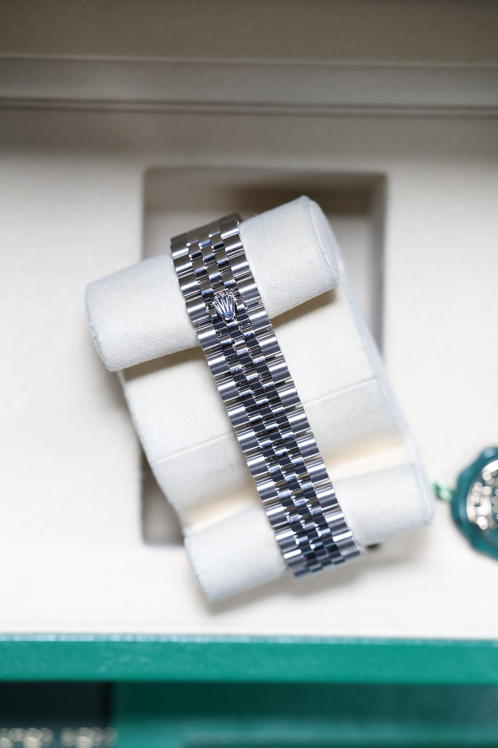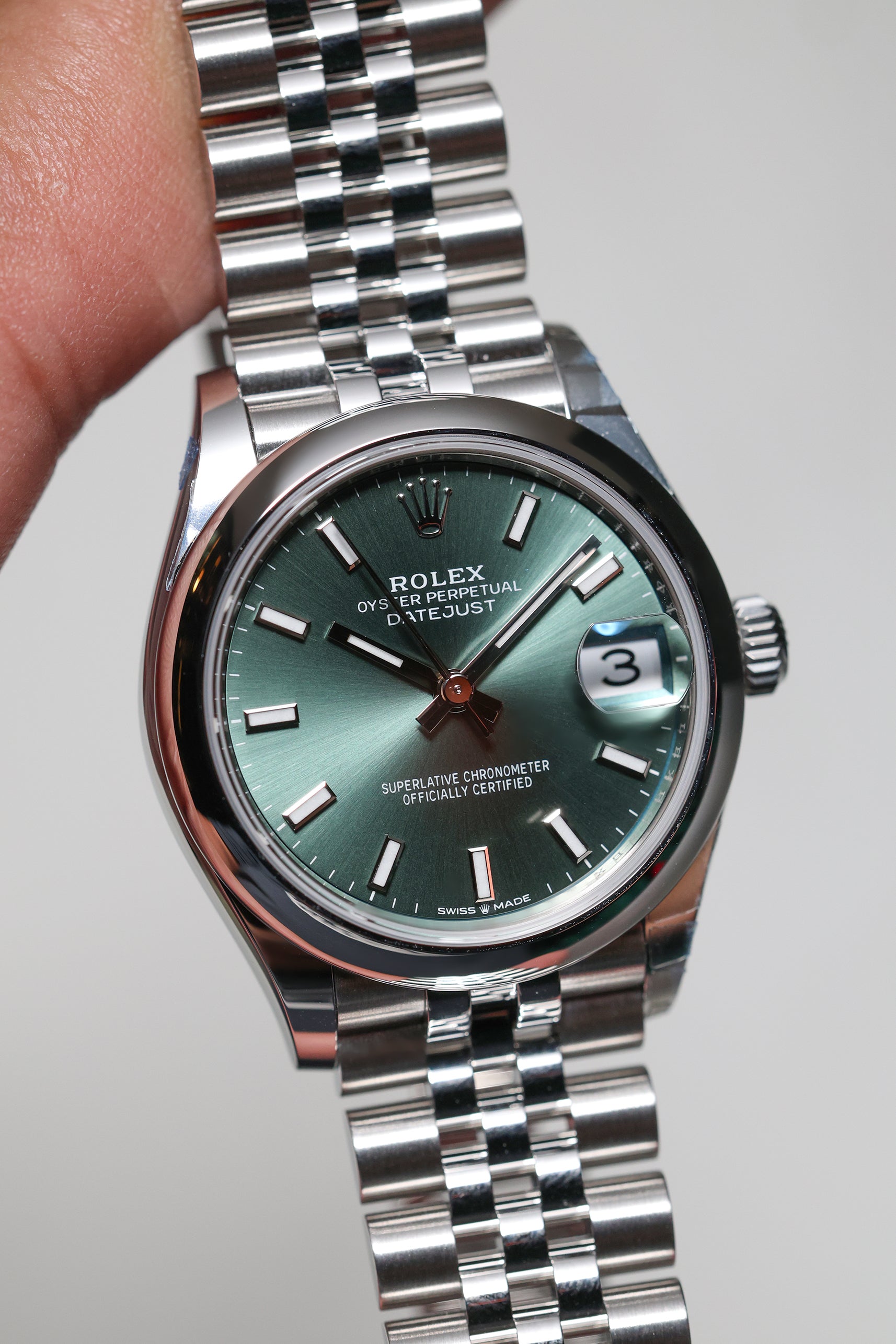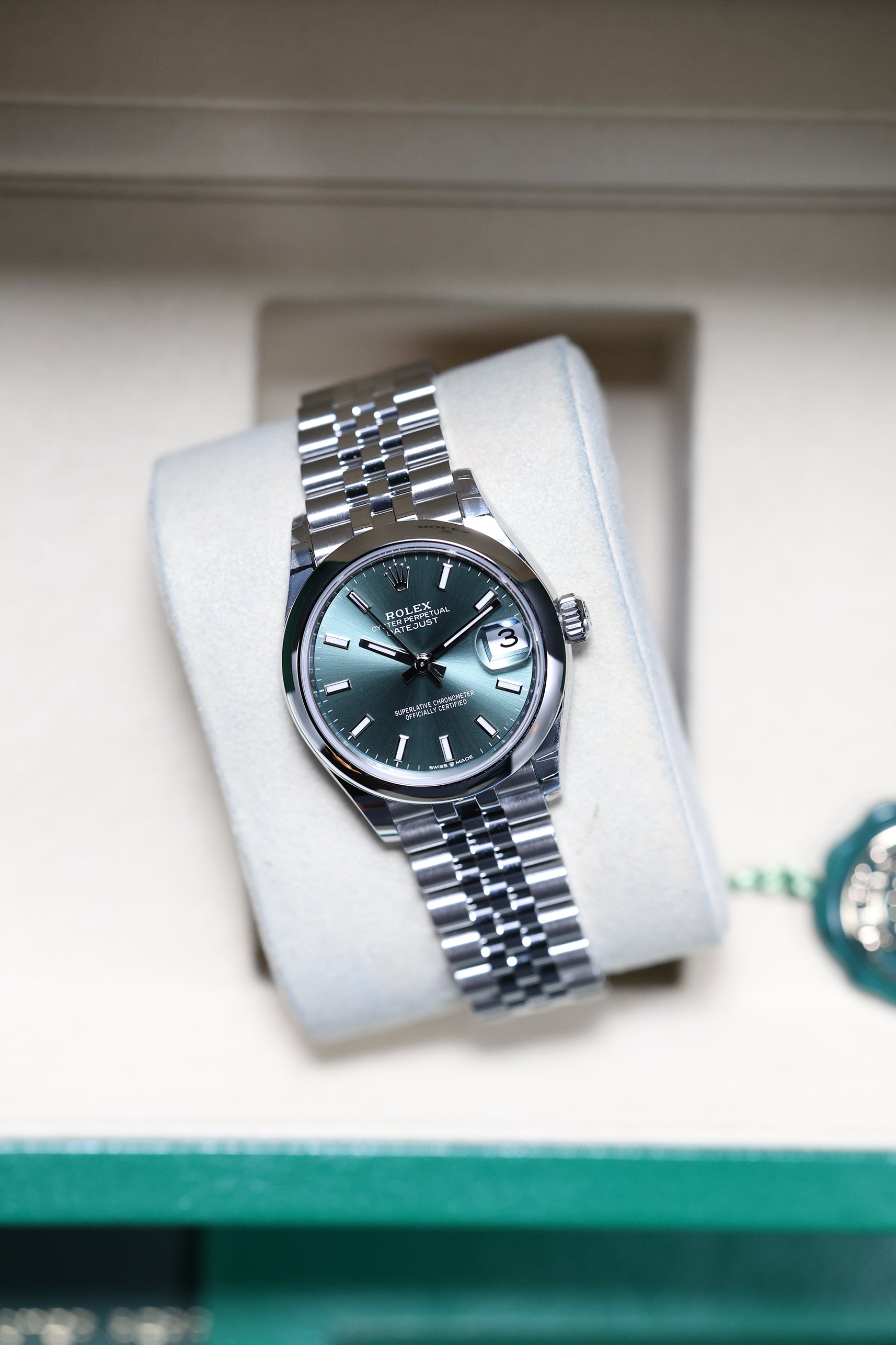 This specific Datejust 31 captivates with its refreshing Mint Green dial. This subtle yet distinctive hue is a contemporary favorite, lending a sense of understated luxury and natural beauty to the classic design. The dial features elegant baton hour markers and polished hands, ensuring excellent legibility and a clean aesthetic, while the iconic domed (smooth) bezel frames the face.