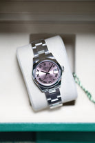 This specific Datejust 31 captivates with its charming Pink dial, which provides a delicate yet distinct presence. The dial is elegantly accented by classic Roman numerals, offering a refined, traditional aesthetic that enhances legibility. The signature domed (smooth) bezel, polished to a brilliant shine, frames the dial, while the iconic Cyclops lens magnifies the date, a hallmark of Rolex's commitment to both clarity and utility.