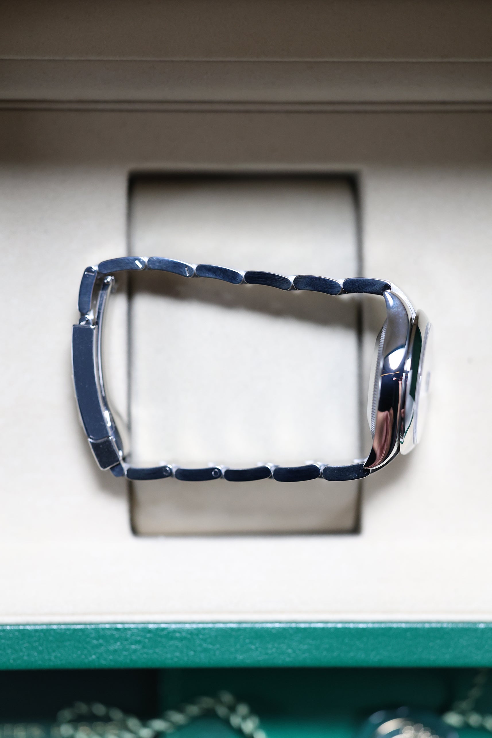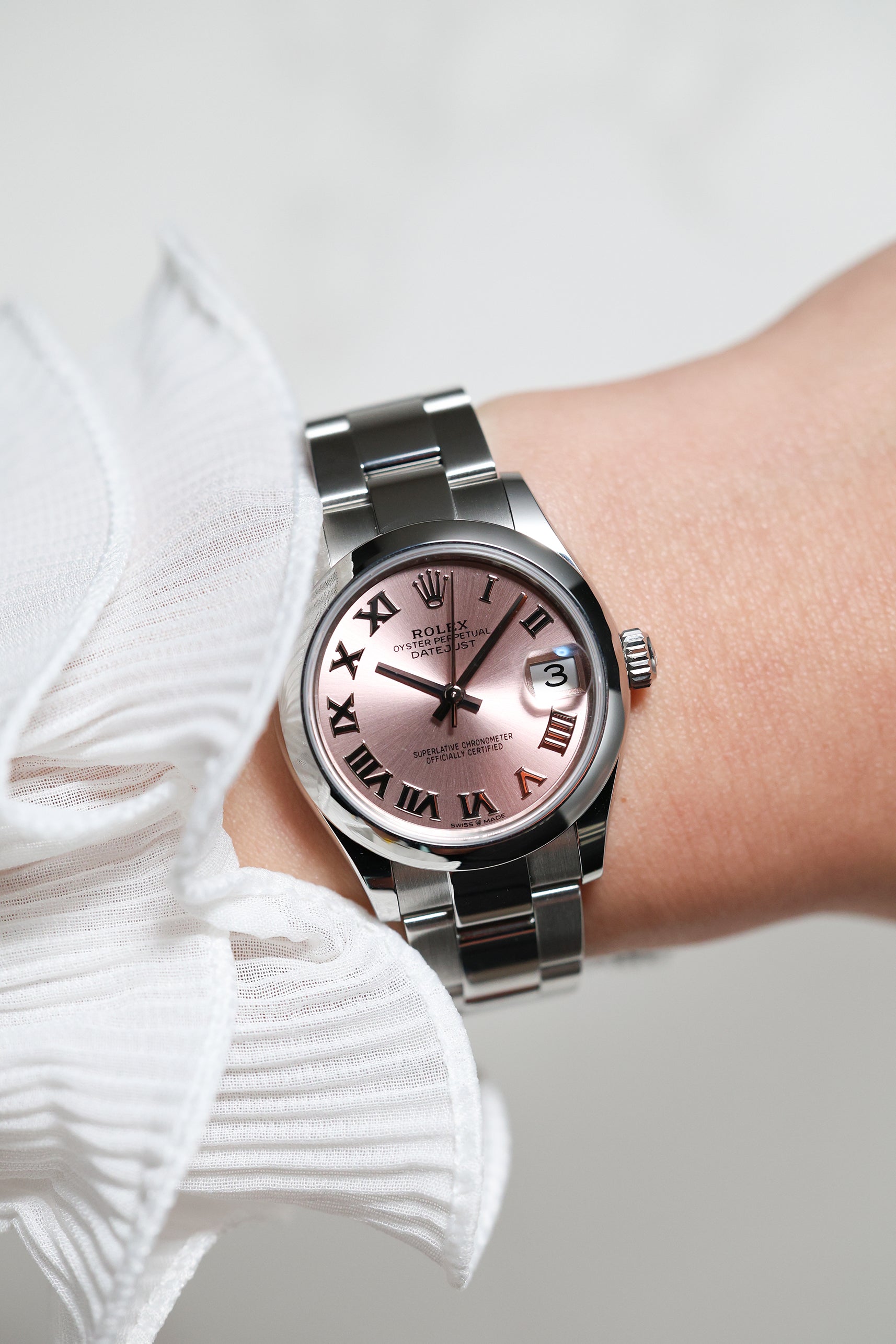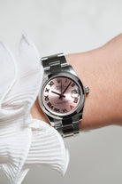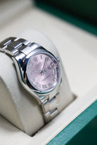 Perfectly sized for a graceful and balanced presence, the 31mm Oystersteel case is paired with the robust, three-link Oyster bracelet. Known for its durability and strong, sporty profile, the Oyster bracelet provides exceptional comfort and a clean, understated look. This combination of the smooth bezel and Oyster bracelet offers a versatile, contemporary aesthetic suitable for elegant daily wear.