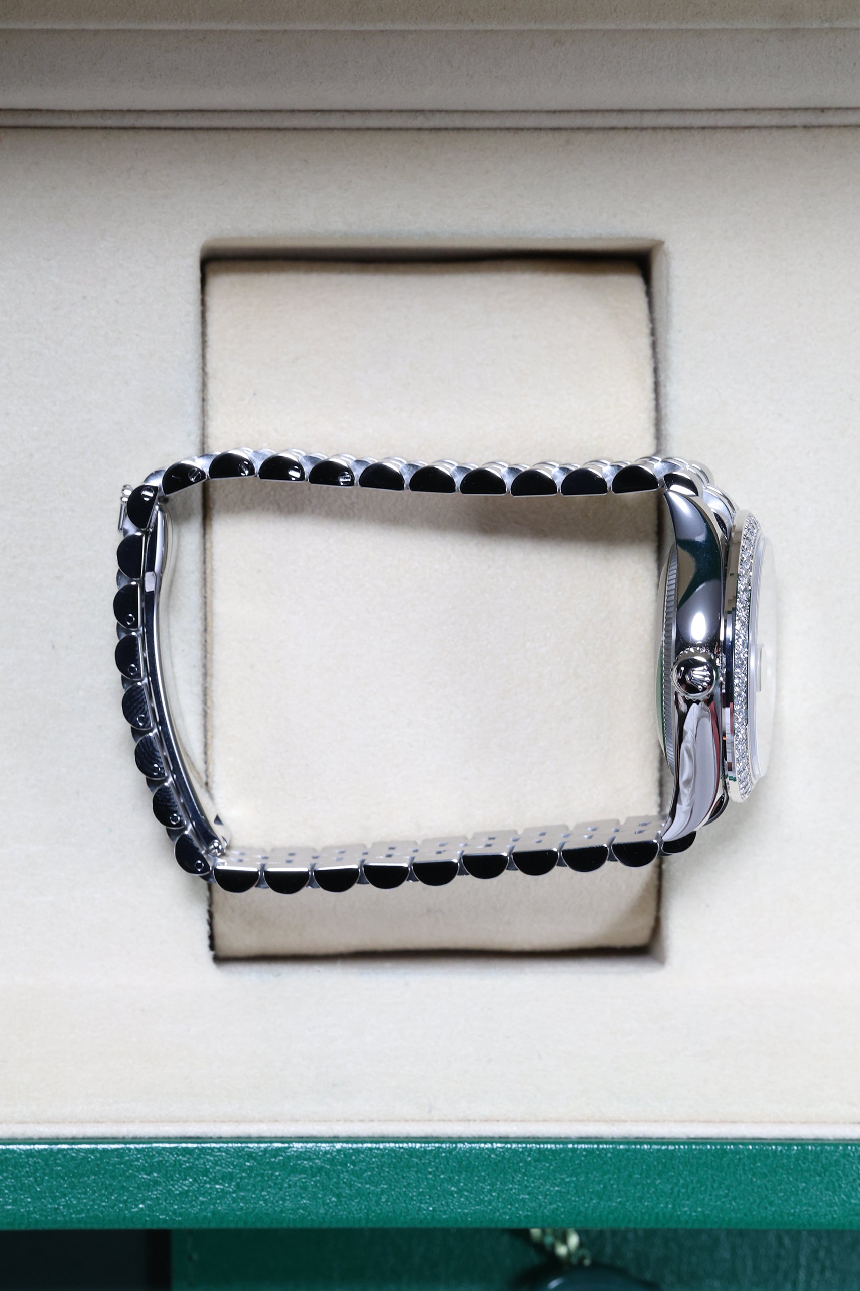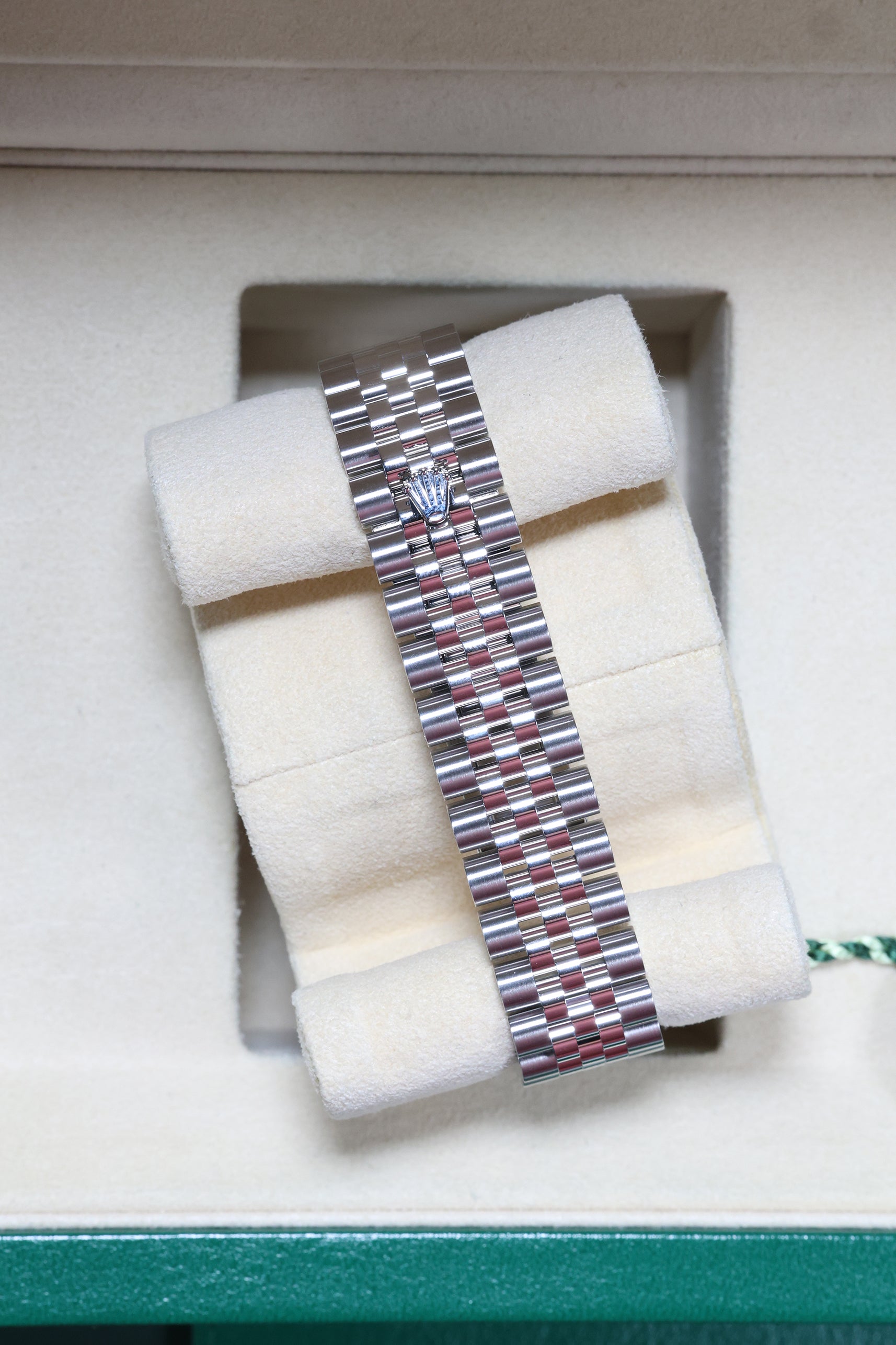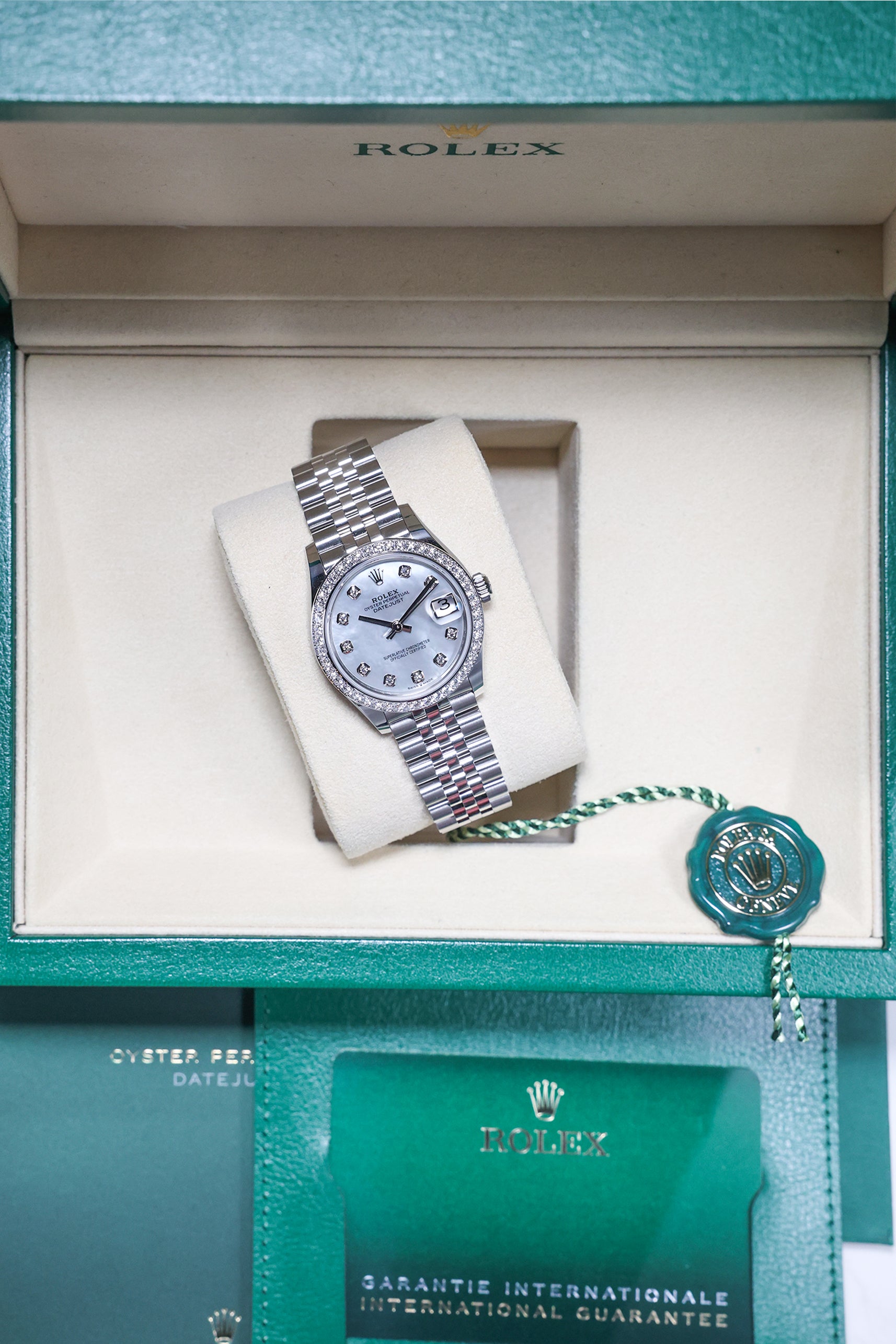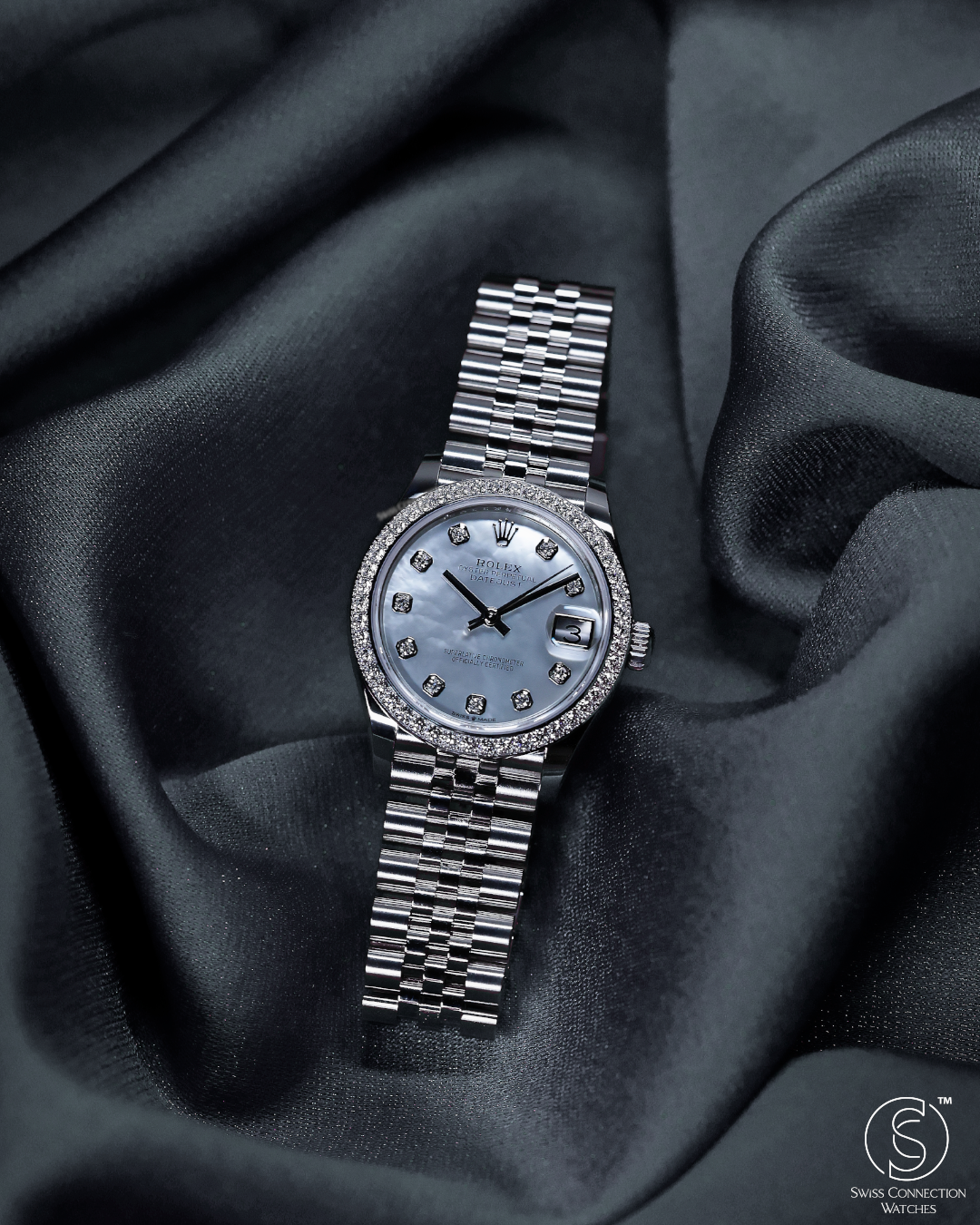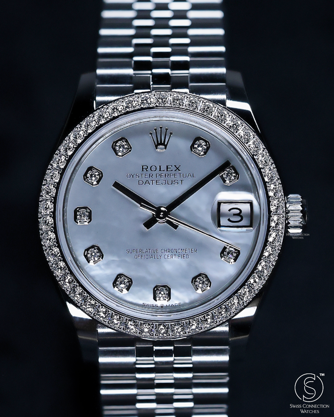 The 31mm case provides an ideal balance of refined presence and graceful wearability, making it a versatile choice for any occasion. The watch is presented on the elegant Jubilee bracelet, a hallmark of Rolex luxury. Renowned for its intricate five-piece link construction, the Jubilee offers exceptional comfort and a refined aesthetic, seamlessly complementing the diamond-set bezel and dial for subtle grandeur.