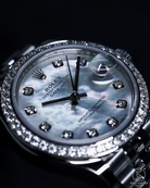 The centerpiece is the captivating White Mother of Pearl dial, which is unique by nature. Its iridescent beauty constantly shifts, revealing subtle, ethereal hues and depths. This natural marvel is complemented by 10 brilliant-cut diamond hour markers, adding a captivating sparkle to the dial. Crucially, this reference is defined by its stunning bezel fully set with brilliant-cut diamonds (RBR), dramatically enhancing the watch's overall brilliance and prestige.