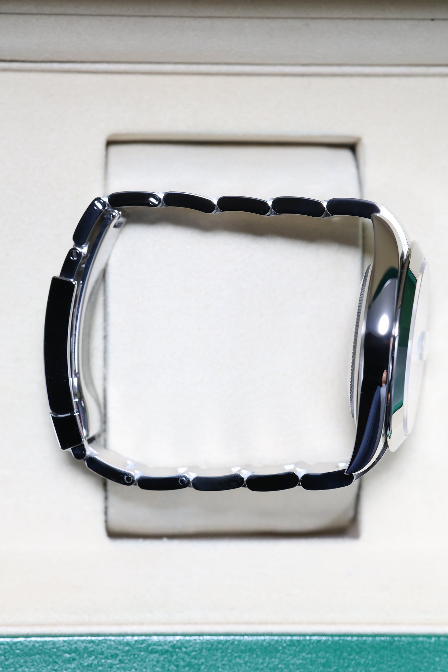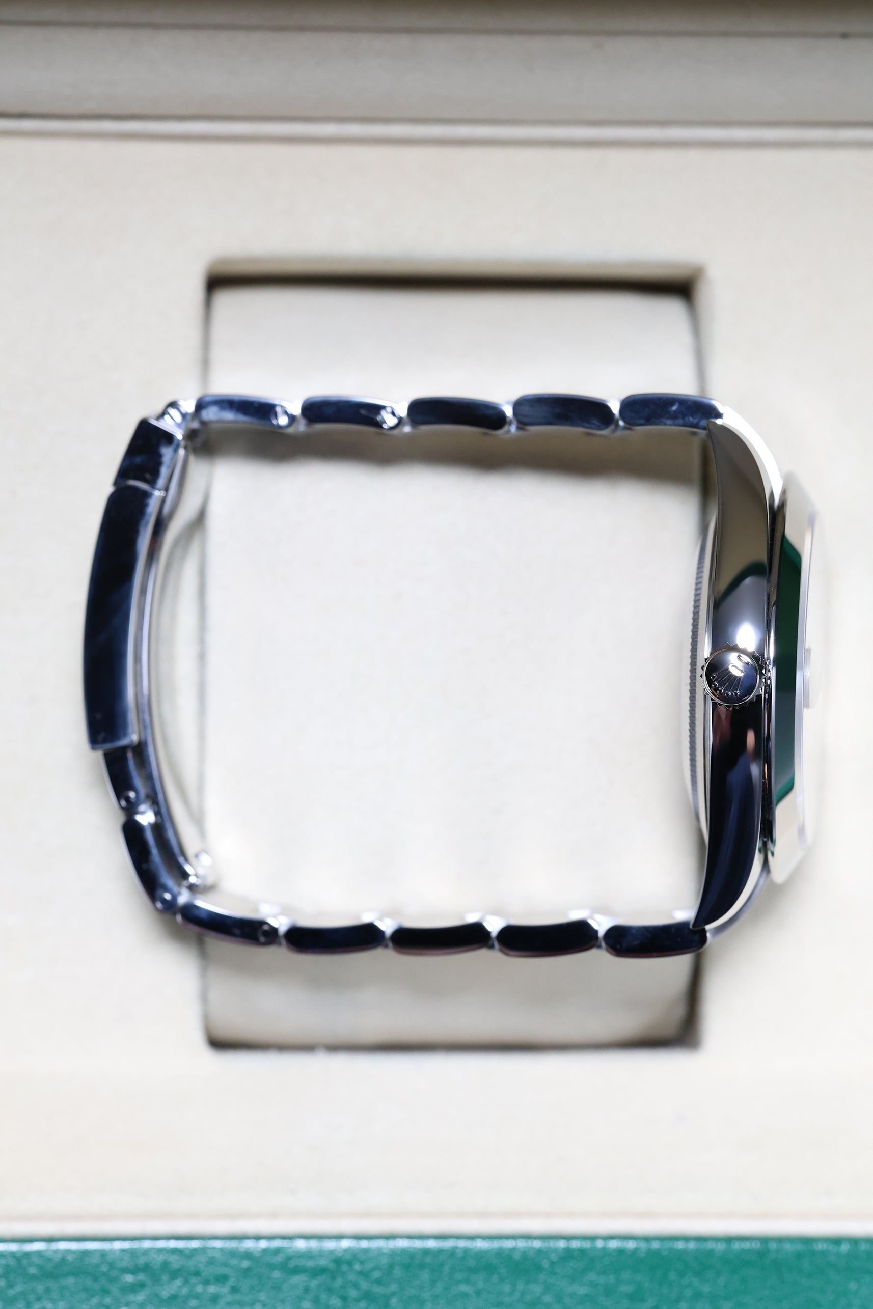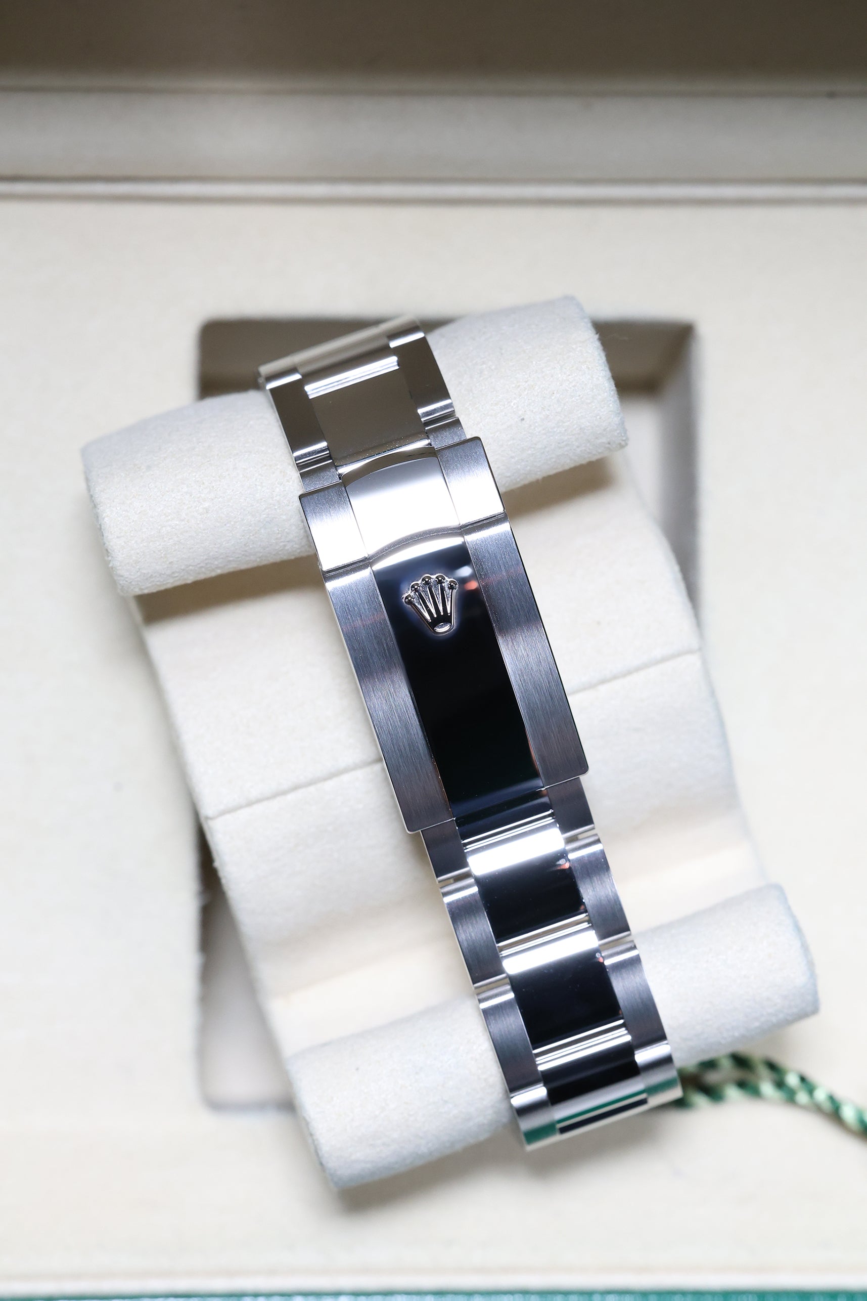 Complementing its robust design, this Datejust 41mm is fitted with the sporty yet refined Oyster bracelet. Known for its three-piece links, the Oyster bracelet provides a strong, comfortable fit with a sleek profile, making it perfectly suited for both formal occasions and active daily wear. This combination of the smooth bezel and Oyster bracelet offers a contemporary and understated look, appealing to those who prefer a clean, modern aesthetic with a distinctive splash of color.