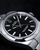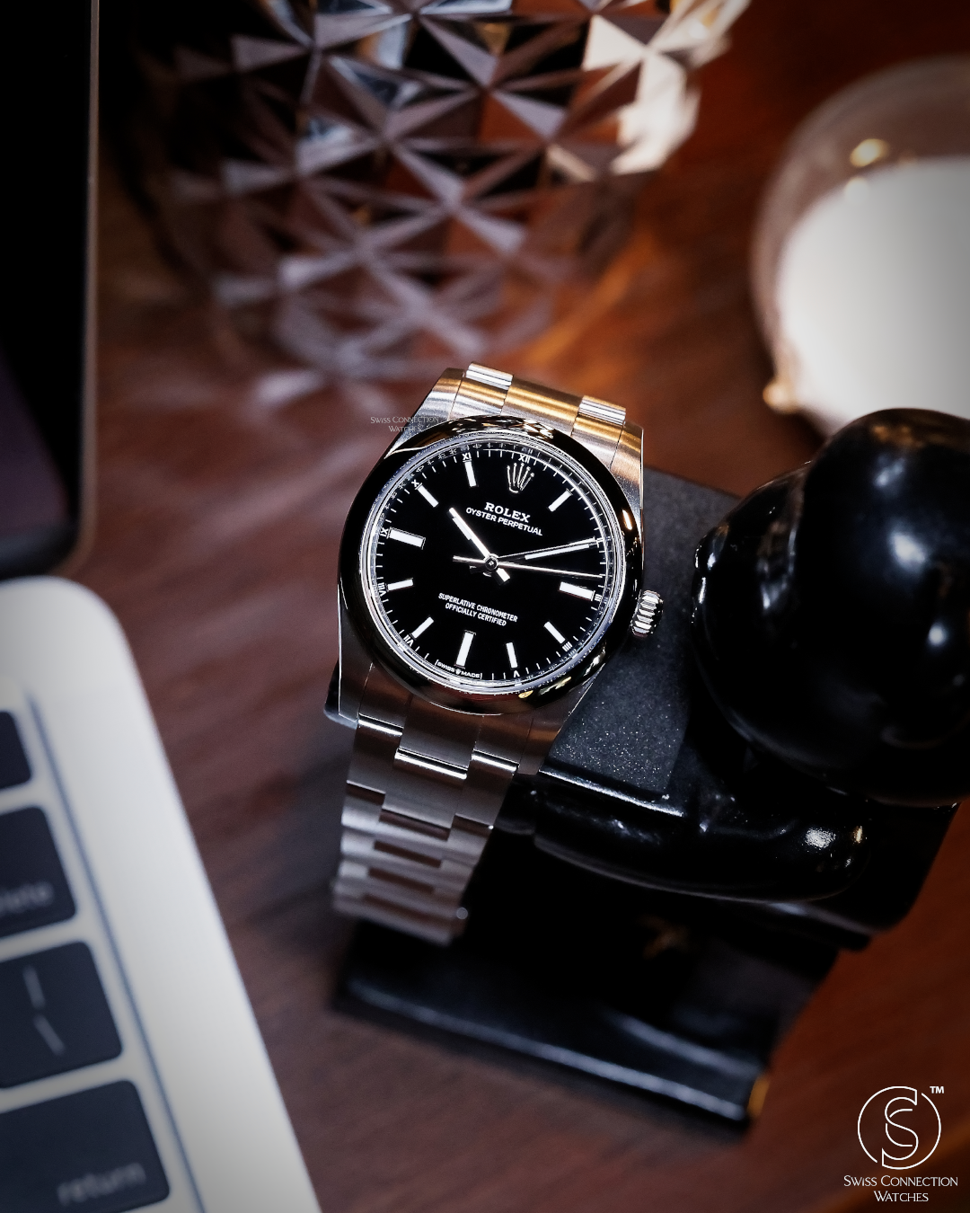 The watch is paired seamlessly with the iconic three-link Oyster bracelet, which provides a comfortable and secure fit for daily wear while maintaining an effortlessly refined aesthetic. The Rolex Oyster Perpetual 34mm with its gloss black dial offers a perfect fusion of heritage and minimalist modern style, making it a highly desirable timepiece for those seeking a watch that is both a symbol of enduring quality and a reflection of sophisticated, understated taste.