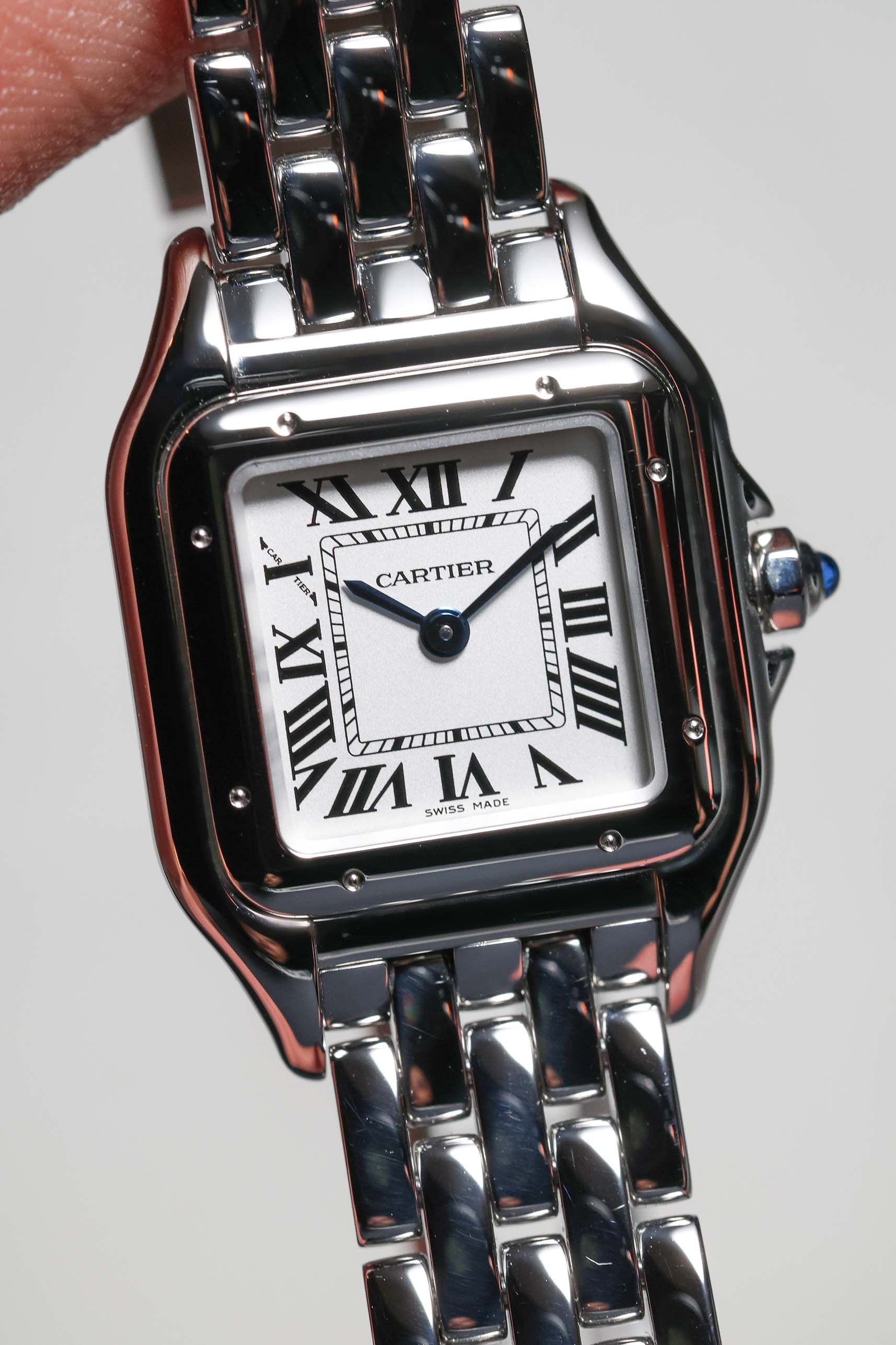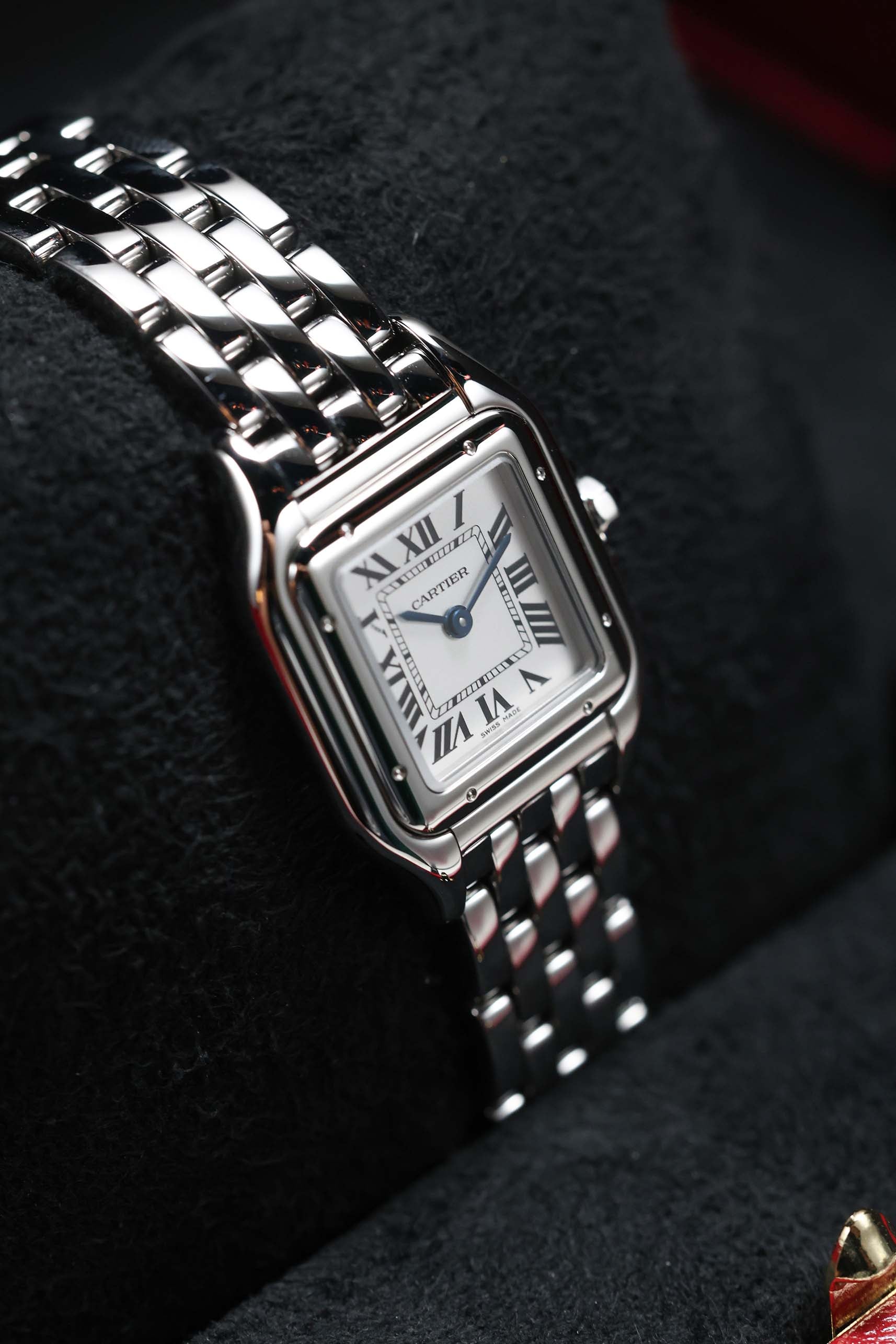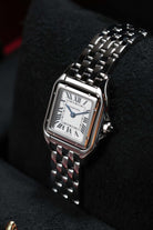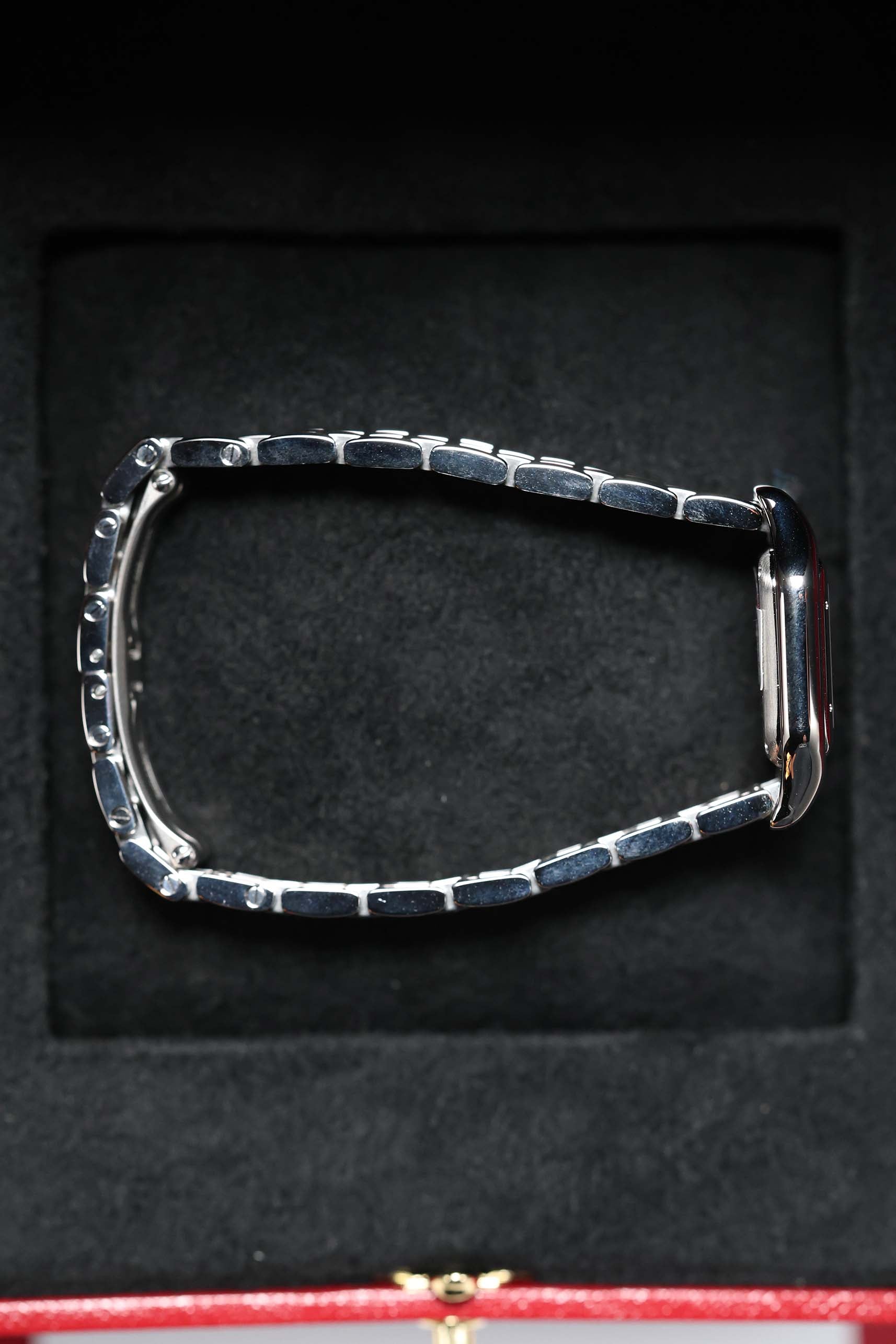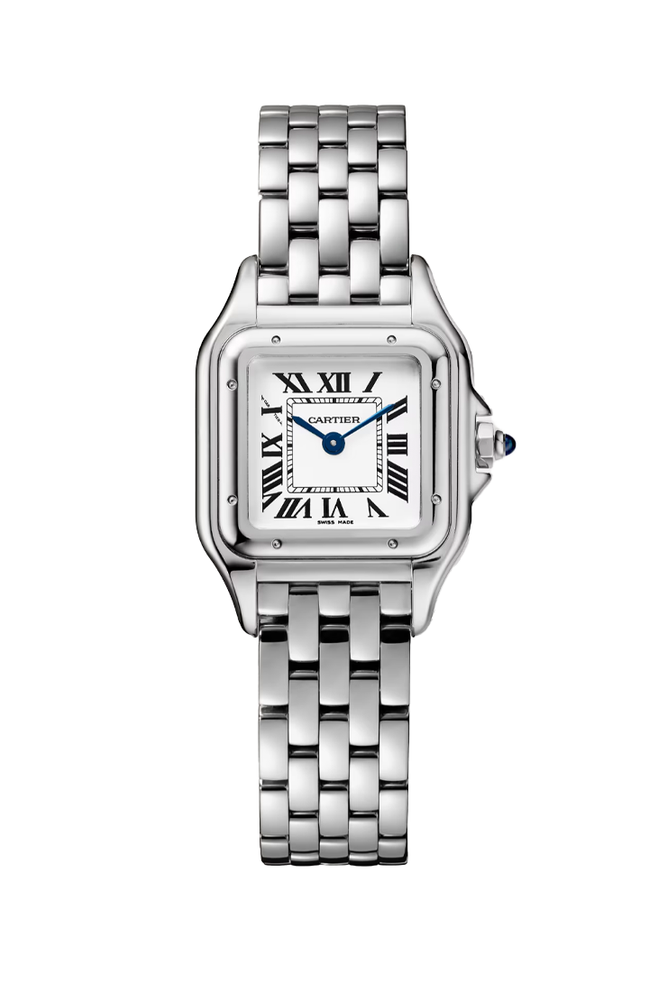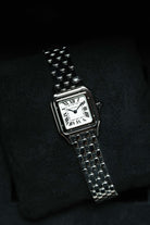 The 23mm x 30mm stainless steel case is a study in soft geometry. While rectangular in its foundation, the case features rounded corners and integrated lugs that flow uninterrupted into the bracelet. A hallmark of the Panthère’s design is the exposed screws on the bezel, a detail that adds a subtle, modern edge to its otherwise feminine silhouette. The case is exceptionally slim, allowing it to sit flush against the skin and slide effortlessly under any cuff, reinforcing its identity as a discreet yet powerful statement of luxury.