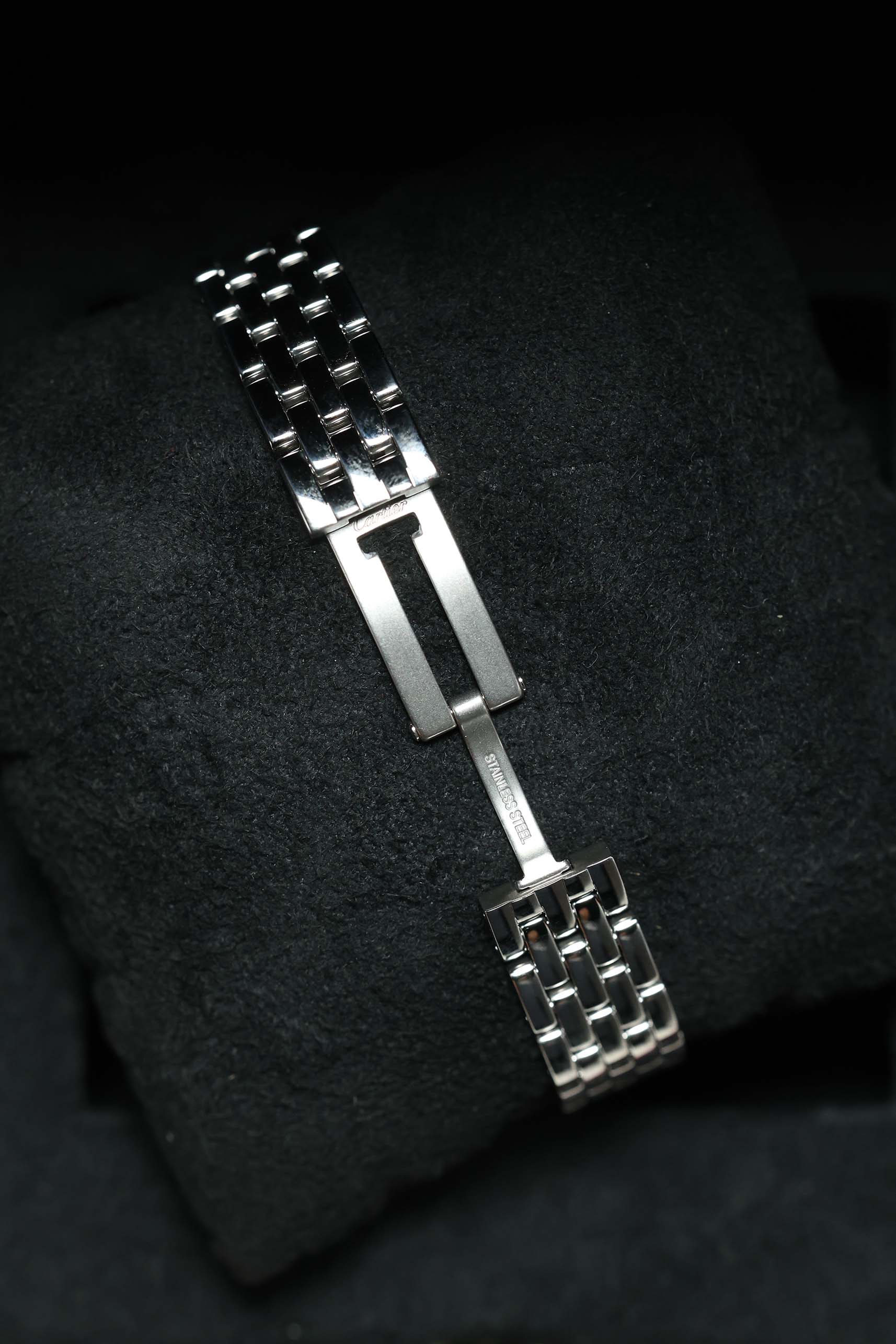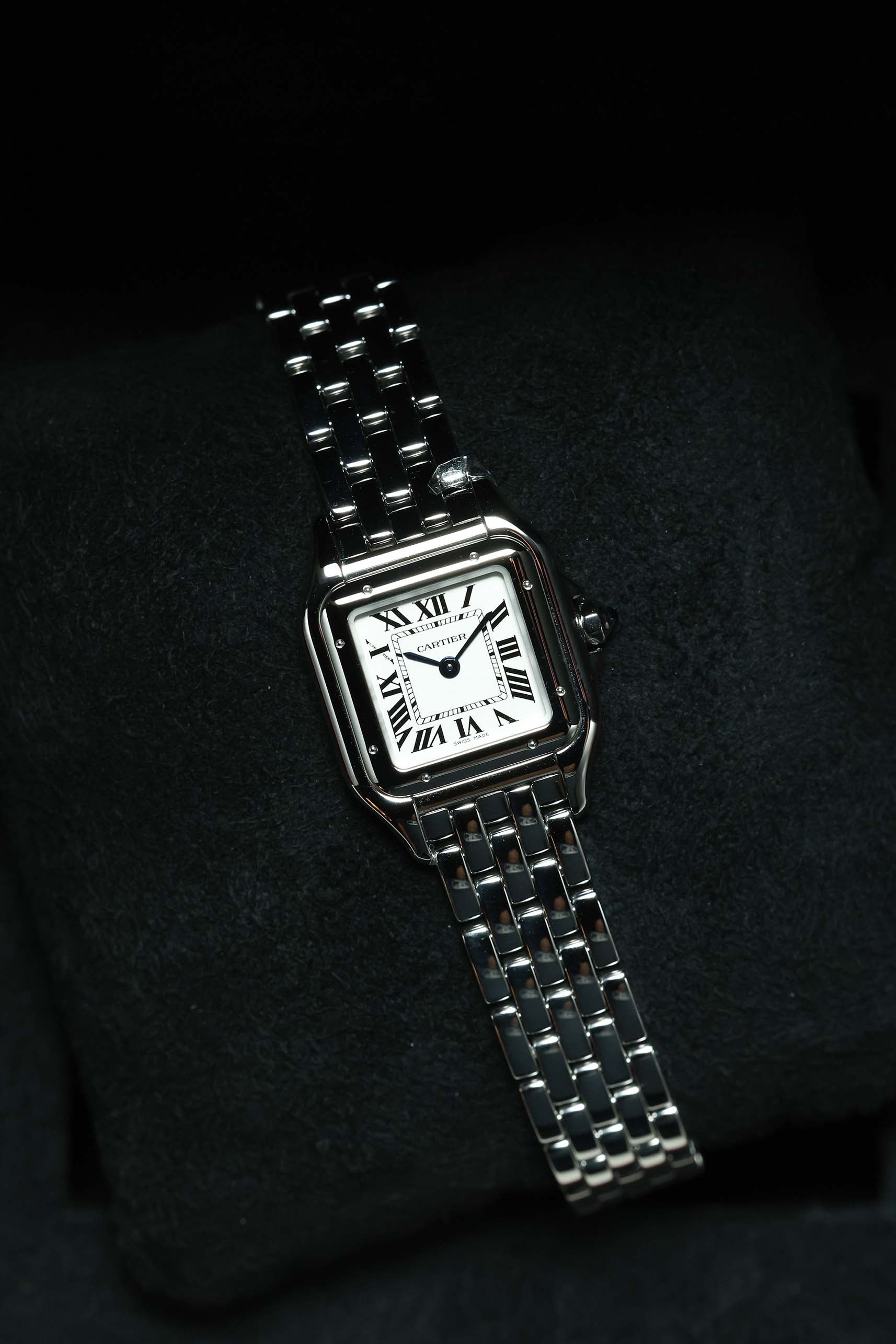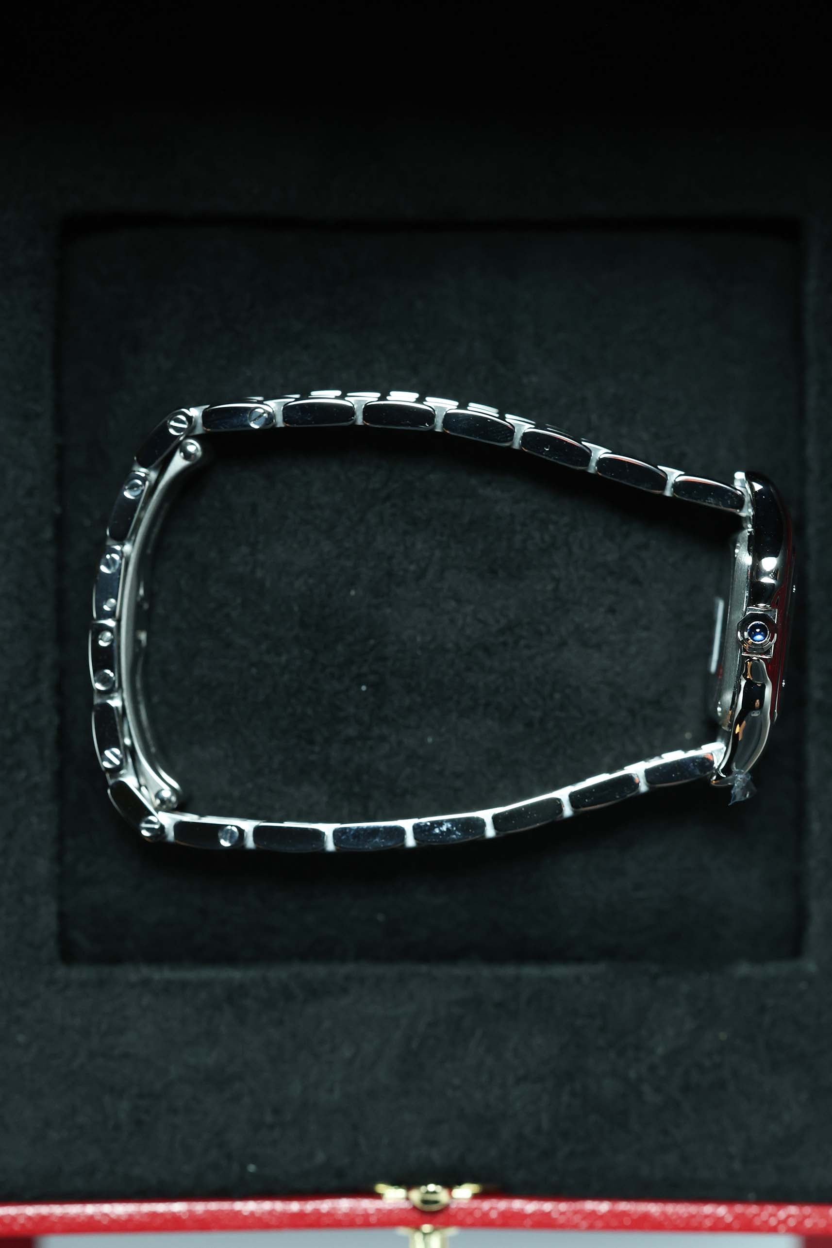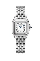 The 23mm x 30mm stainless steel case is a study in soft geometry. While rectangular in its foundation, the case features rounded corners and integrated lugs that flow uninterrupted into the bracelet. A hallmark of the Panthère’s design is the exposed screws on the bezel, a detail that adds a subtle, modern edge to its otherwise feminine silhouette. The case is exceptionally slim, allowing it to sit flush against the skin and slide effortlessly under any cuff, reinforcing its identity as a discreet yet powerful statement of luxury.