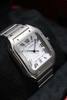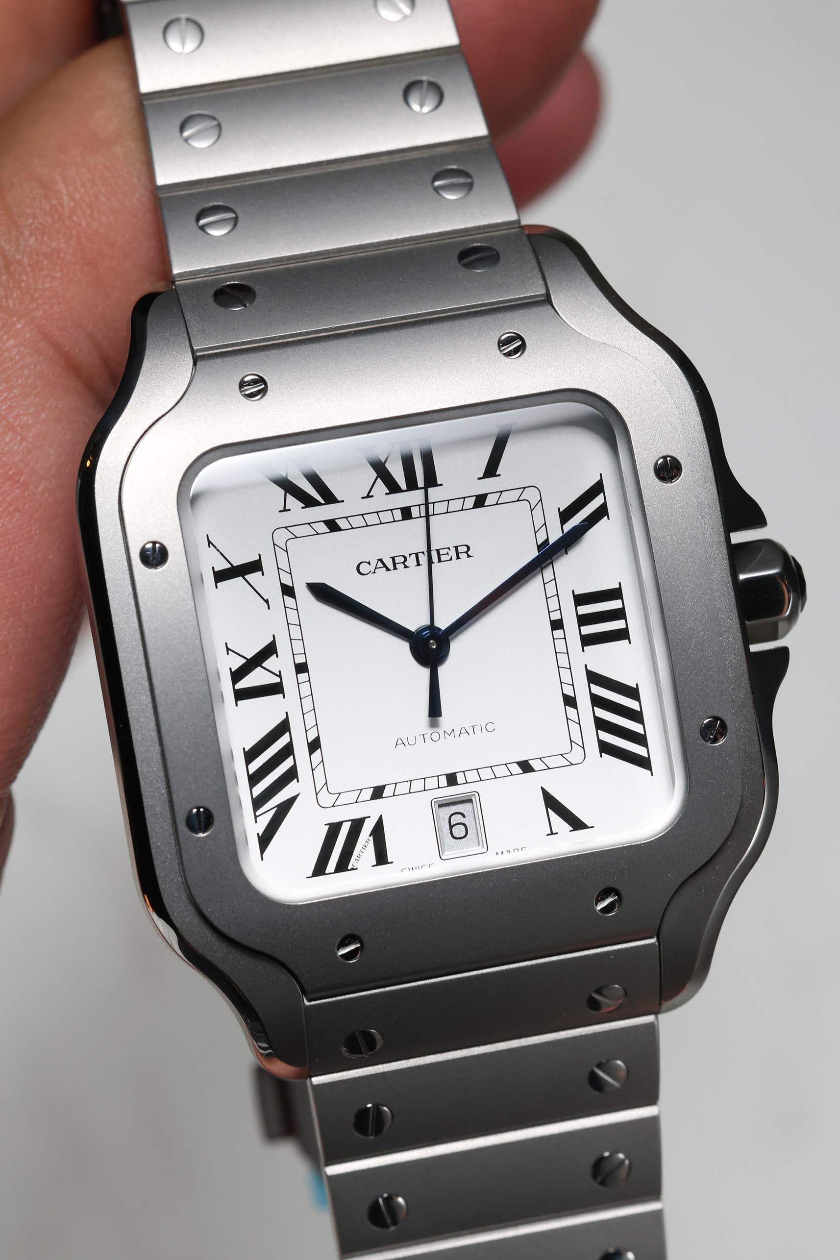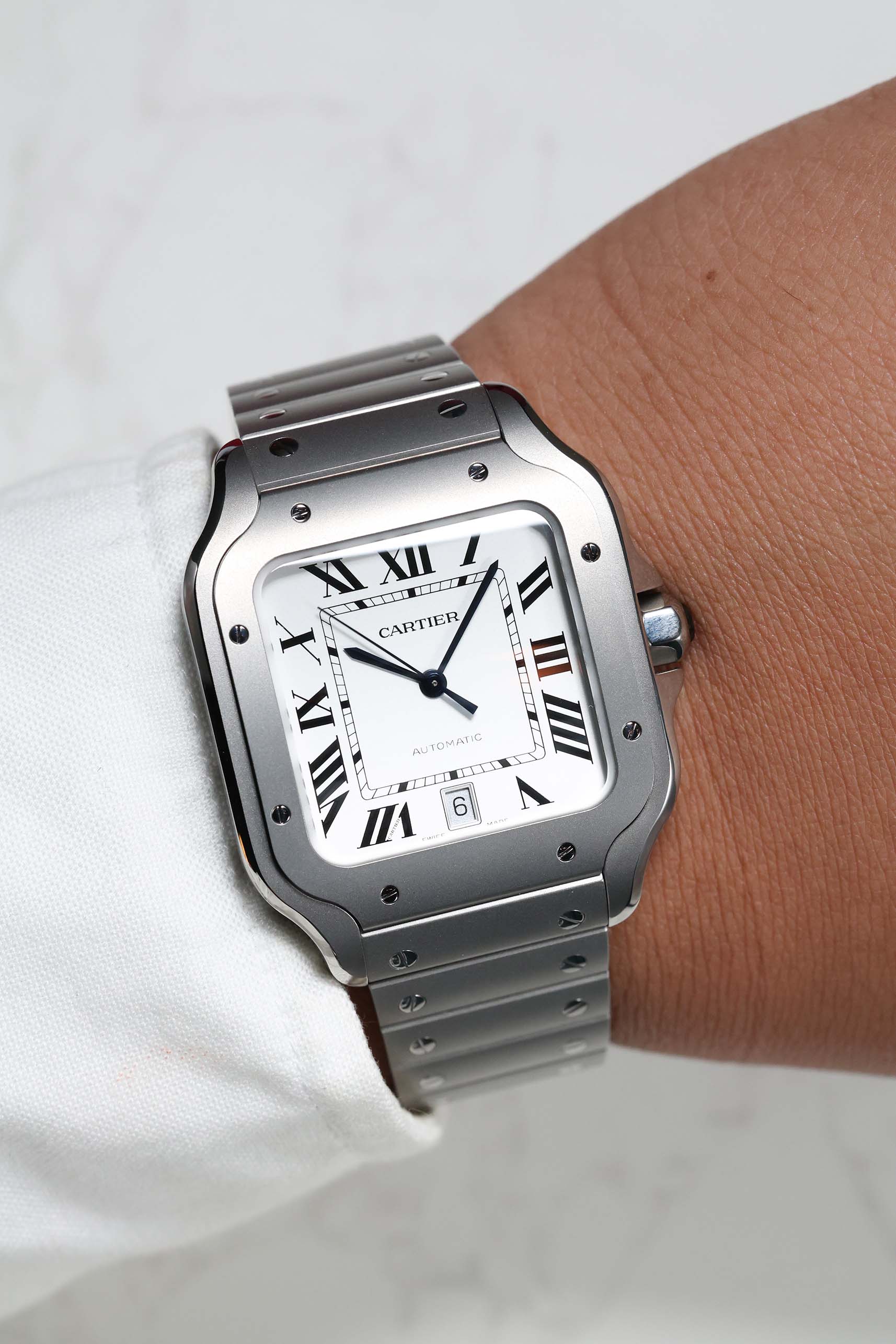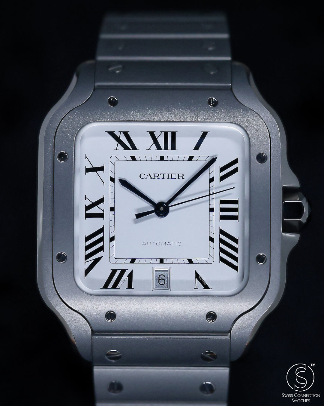 The dial is the classic white lacquer Roman numeral dial, maintaining the full heritage identity. The iconic black Roman numerals and elegant blued-steel sword hands provide exceptional legibility and timeless Cartier finesse, while the subtle date window at 6 o’clock adds practical balance.