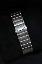 The watch is crafted entirely from lightweight matte titanium, giving the classic 39.8mm (Large) case a distinctly modern, utilitarian presence that is both comfortable on the wrist and incredibly scratch-resistant. The signature square silhouette retains its softly rounded edges, but the use of titanium—including the exposed bezel screws—transforms the watch’s look from polished luxury to architectural tool watch. The overall grey monotone imparts a sophisticated, technical feel.