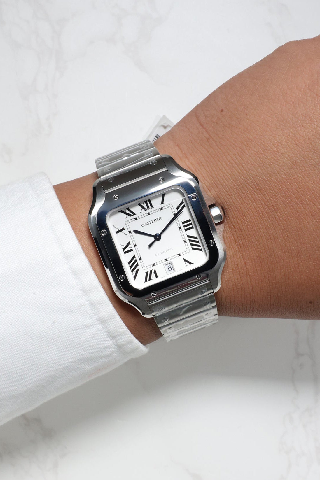 The stainless steel case retains the signature square silhouette with softly rounded edges, giving the watch a distinctive profile that’s both modern and timeless. Its polished bezel is punctuated by exposed screws — an industrial design flourish that has become one of the Santos' most recognisable hallmarks. Framing a silvered opaline dial, the Roman numerals and blued-steel hands are rendered with classical Cartier finesse, while the subtle date window at 6 o’clock adds discreet practicality.