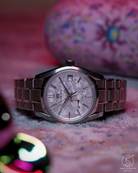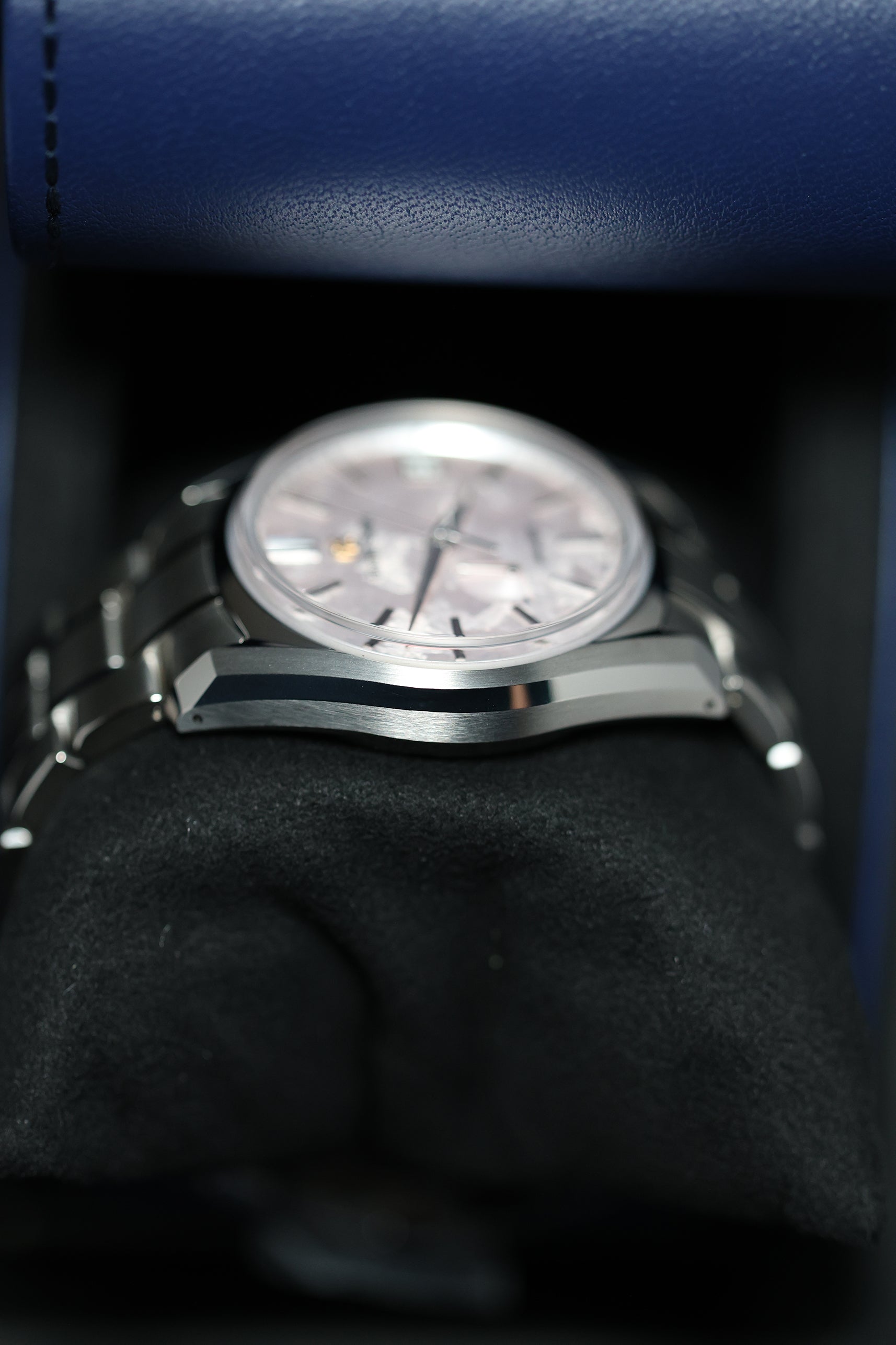 At the heart of its beauty is the pinkish dial, inspired by cherry blossoms scattered on a still pond. Softly textured and subtly nuanced, the dial shifts elegantly in different lighting—from a silvery hue with a hint of warmth to a distinct, petal-like pink. The famous razor-sharp hands and indices provide superb contrast and precision, while the power reserve indicator and date window integrate seamlessly into the serene composition.