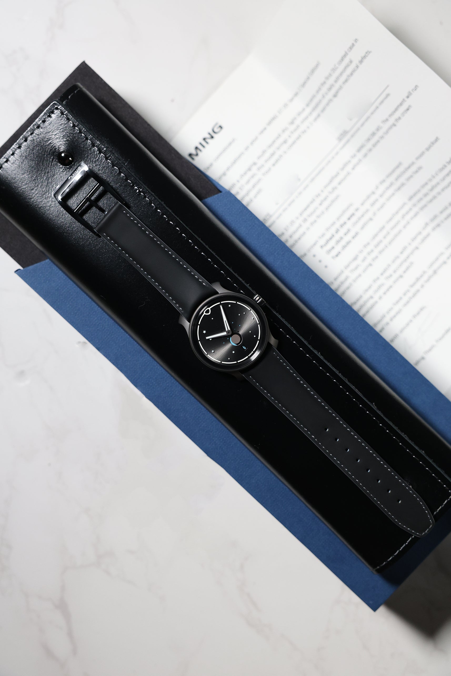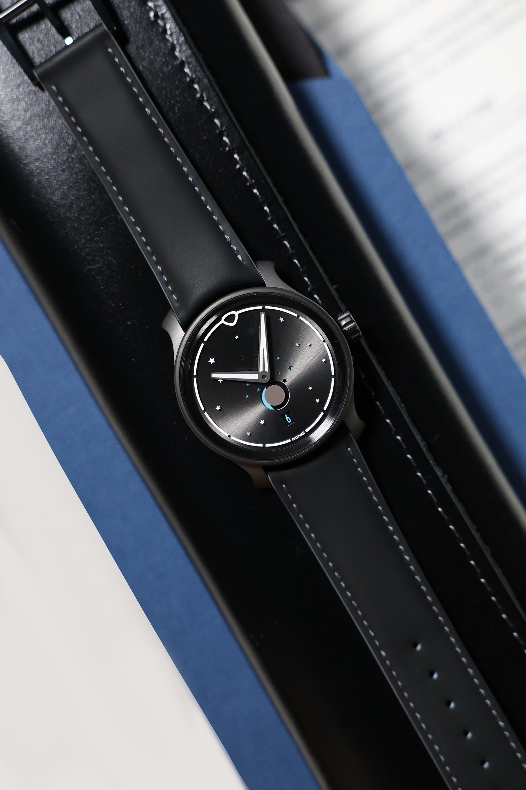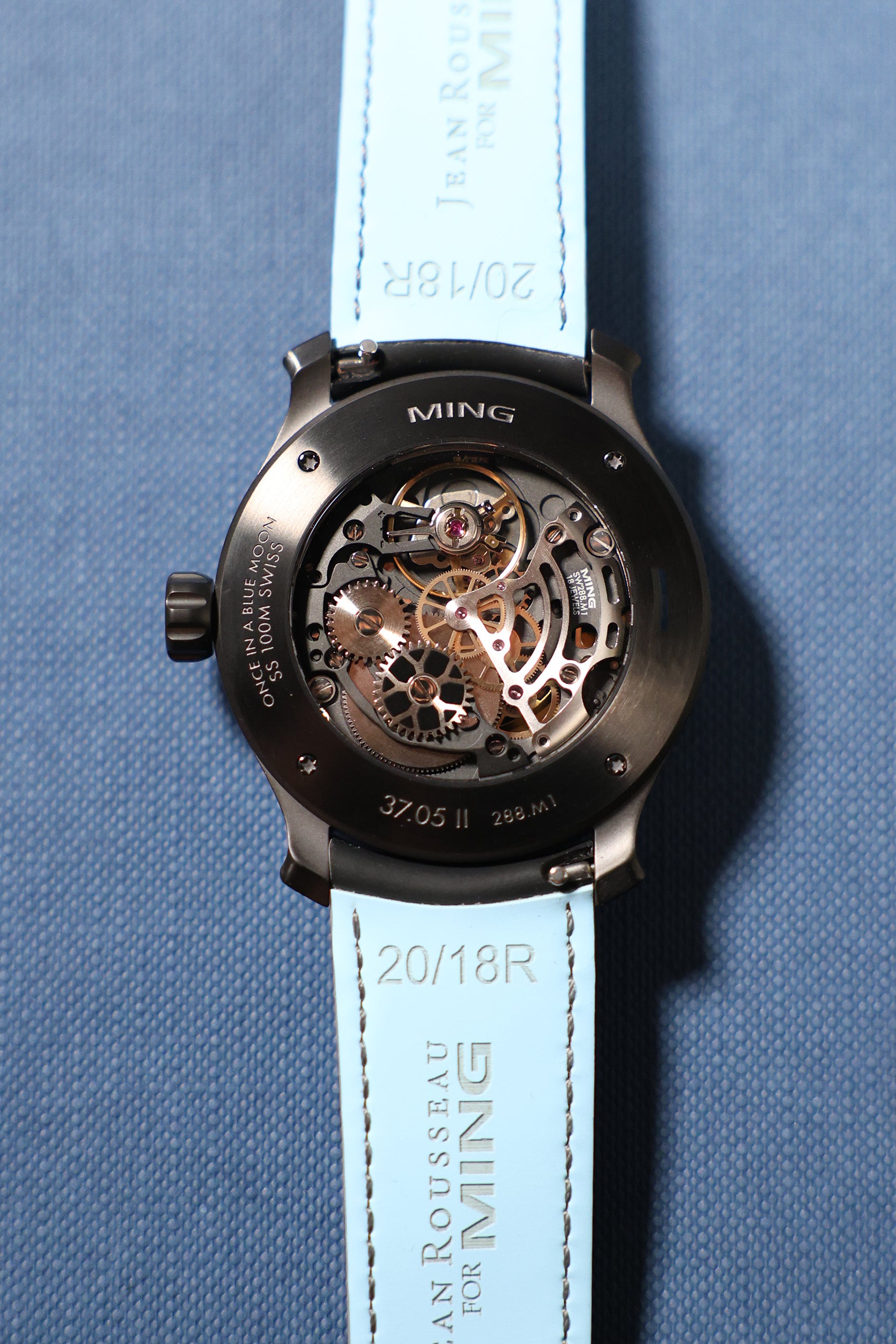 Powering the watch is the manual-winding Sellita SW288.M1, modified by Ming to feature a central moonphase—a rare and technically impressive configuration. The movement is visible through a sapphire exhibition caseback, showcasing anthracite bridges and refined finishing techniques such as perlage, which are perfectly aligned with the watch’s overall darkened aesthetic. With a 38-hour power reserve, it balances visual refinement with dependable performance.