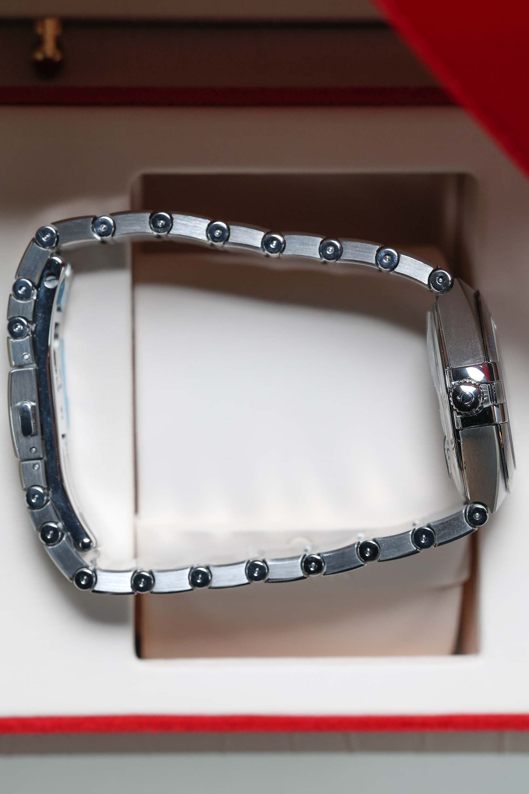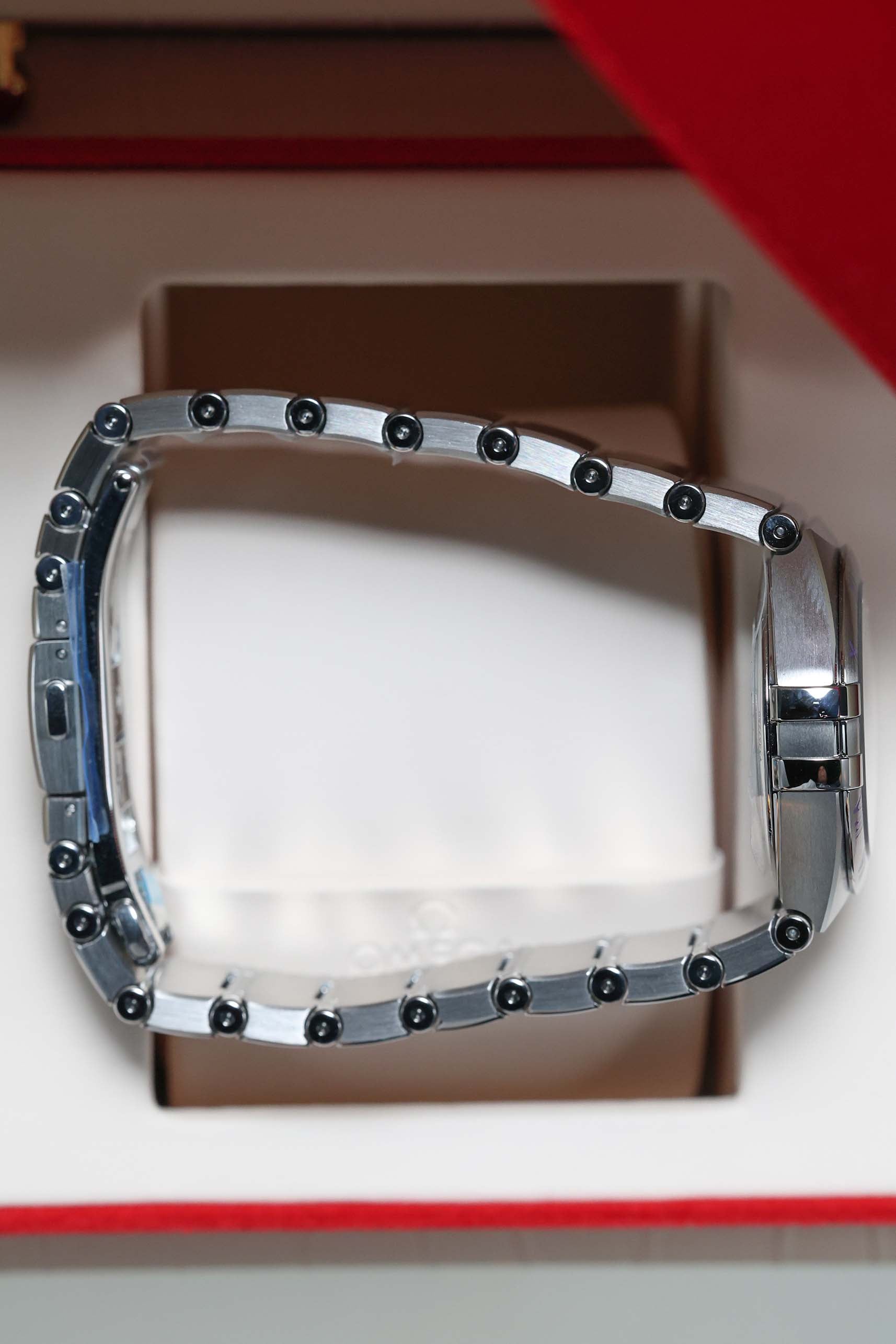 The 28mm stainless steel case is a masterclass in ergonomic design, featuring the famous polished claws at 3 and 9 o'clock that merge seamlessly into the bezel. These claws, originally designed to hold the sapphire crystal and gasket in place for water resistance, have become the definitive hallmark of the Constellation's identity. The watch is integrated with the signature Constellation bracelet, known for its horizontal "mono-rang" links and brushed finish, providing a jewelry-like drape on the wrist and exceptional daily comfort.