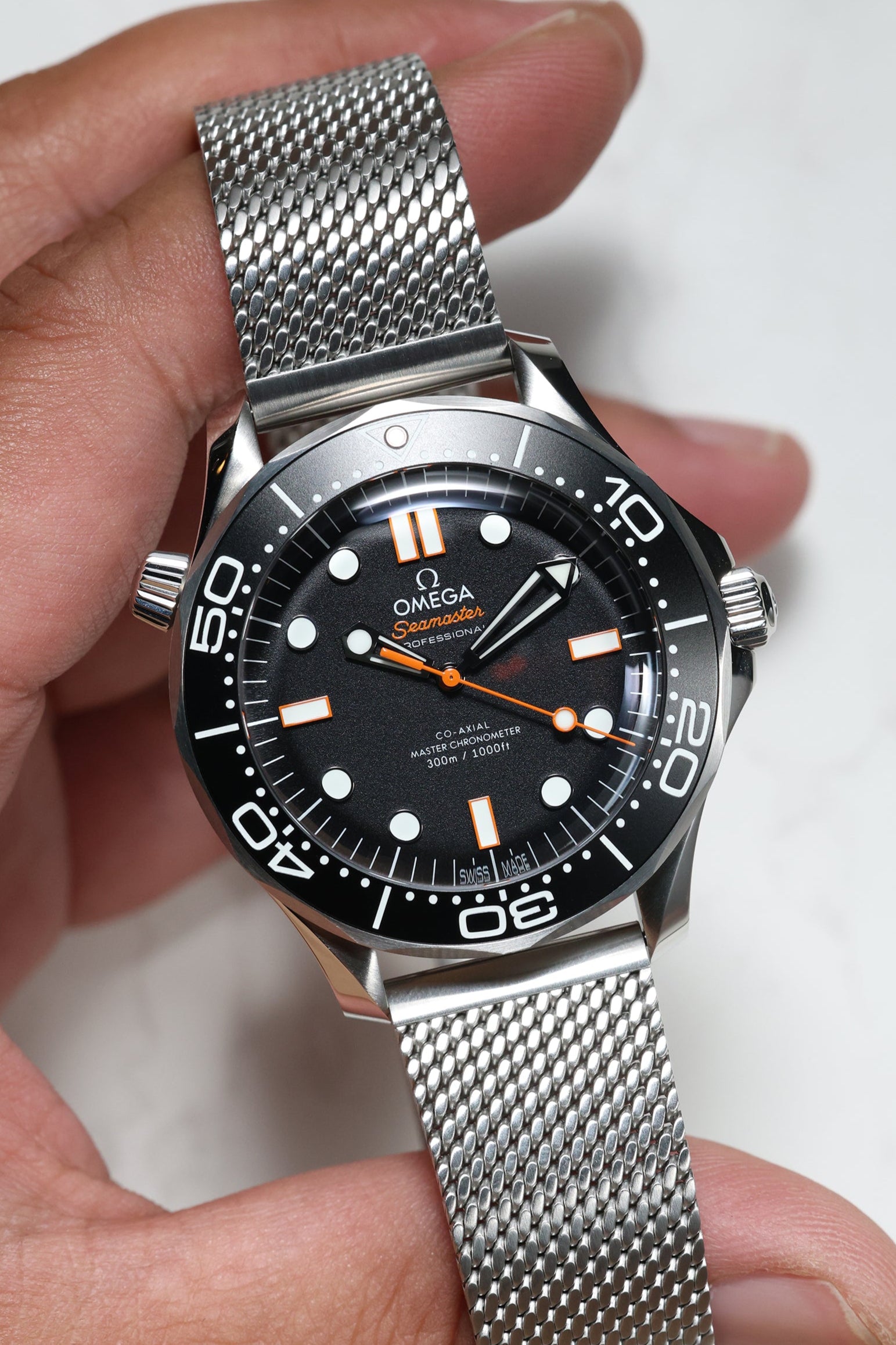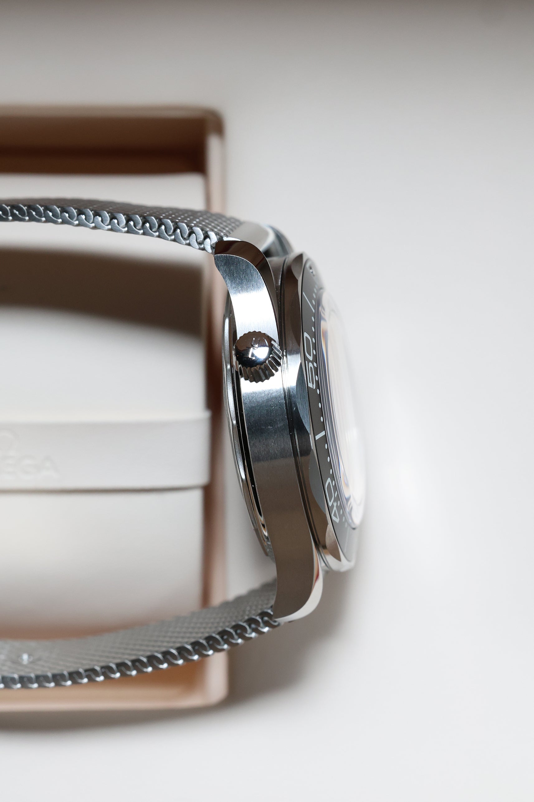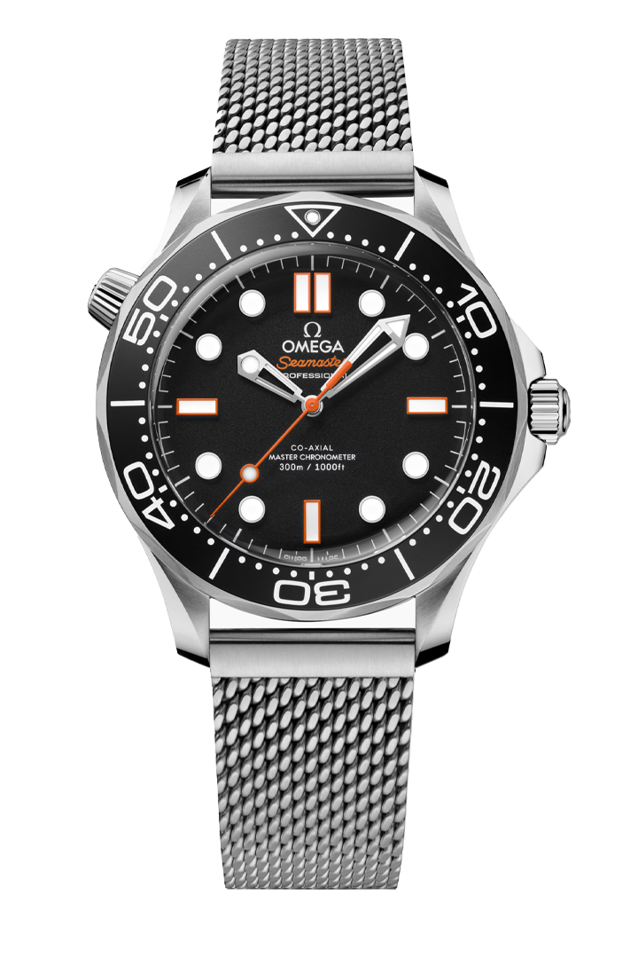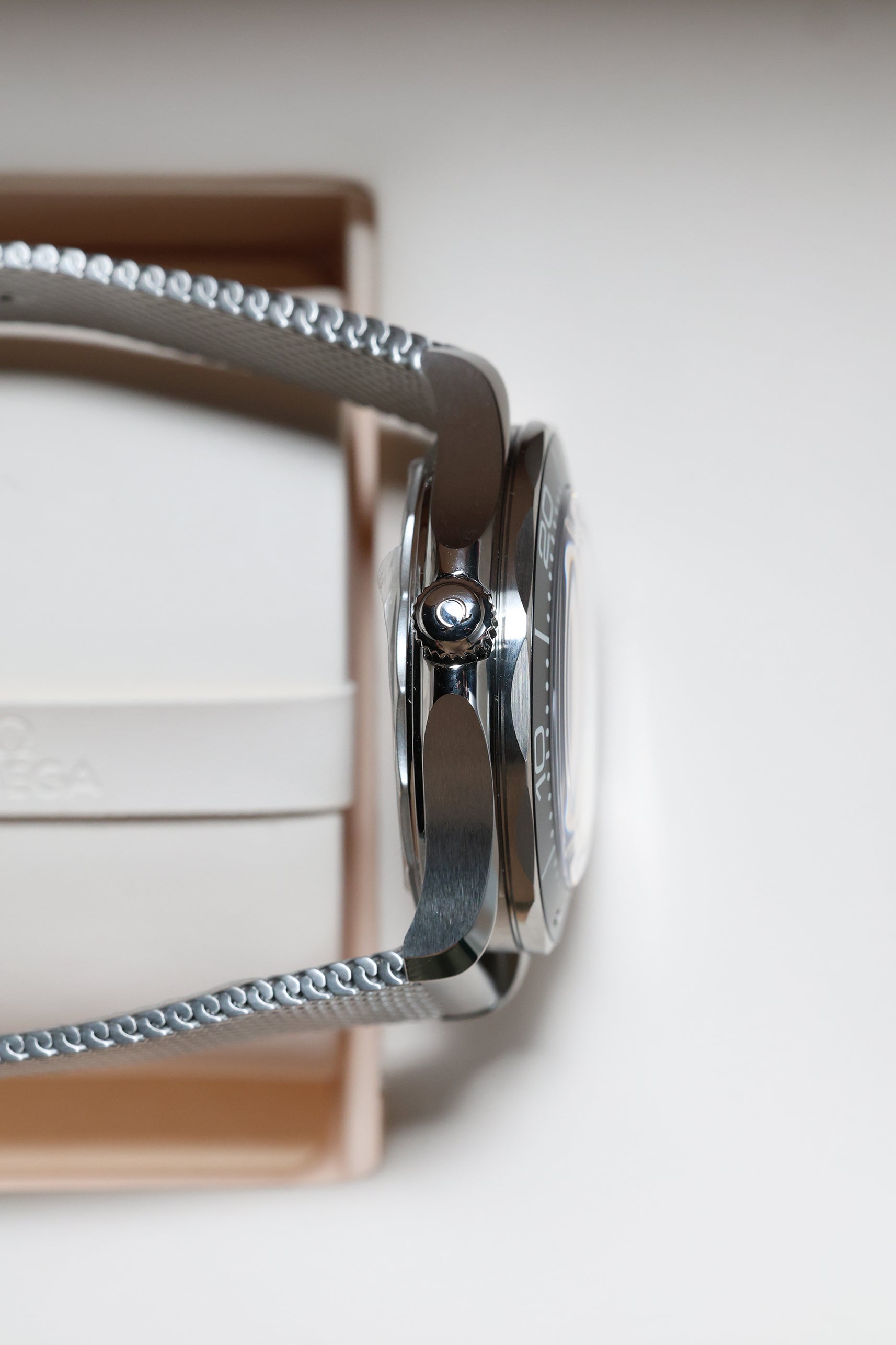 The watch is presented on a sophisticated stainless steel mesh-style bracelet. This unique Milanese-style design provides an exceptionally fluid and comfortable drape on the wrist, adding a touch of vintage elegance while maintaining its robust, tool-watch capability. With its clean, symmetrical dial and bold color accents, the Seamaster Diver 300M delivers versatility with an unmistakably modern Omega flair, making it a compelling choice for both seasoned collectors and those seeking their quintessential luxury diver.