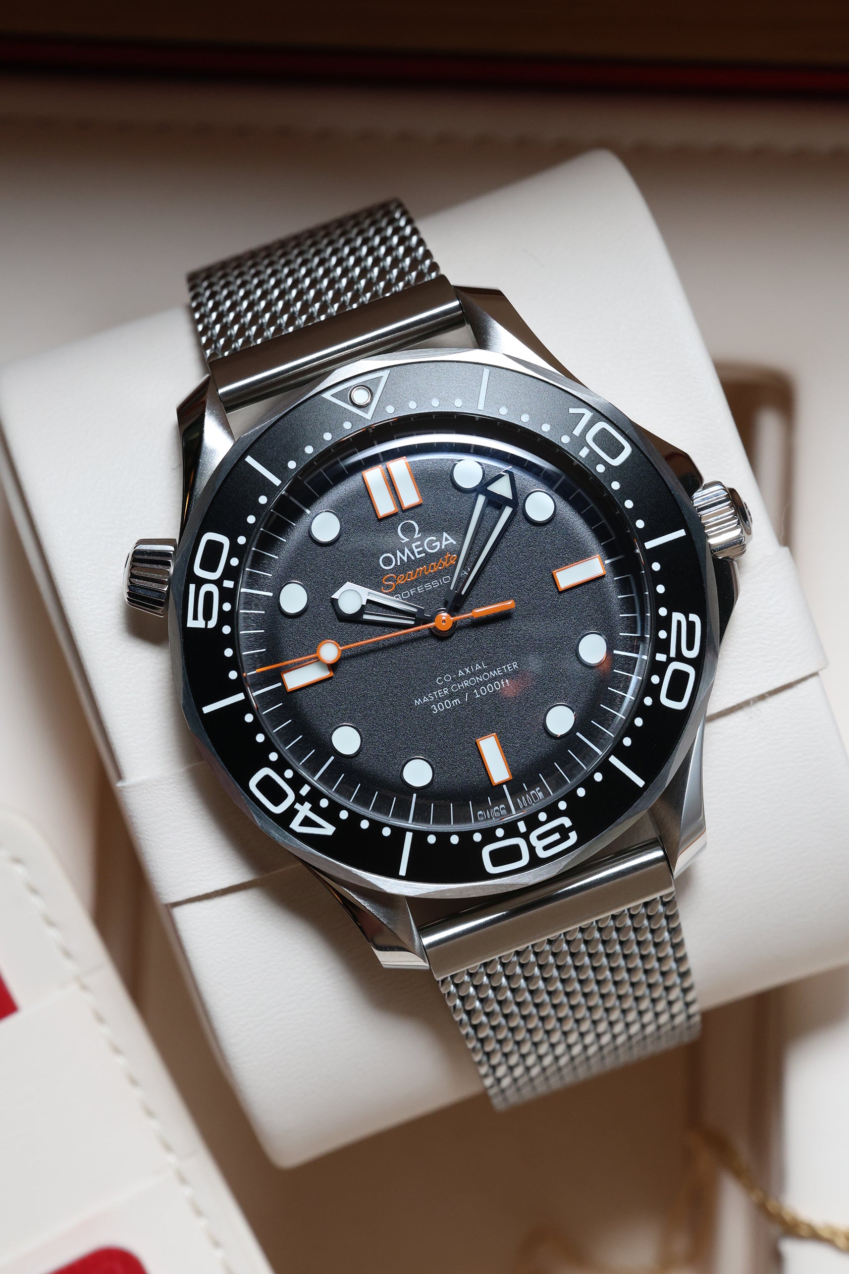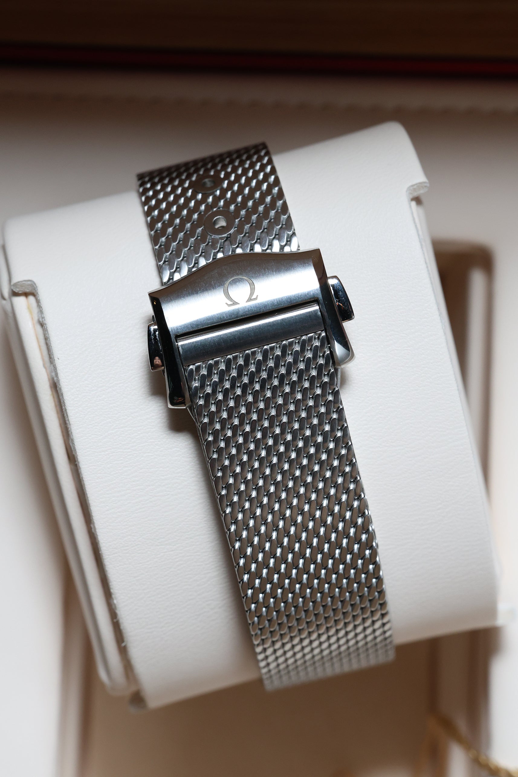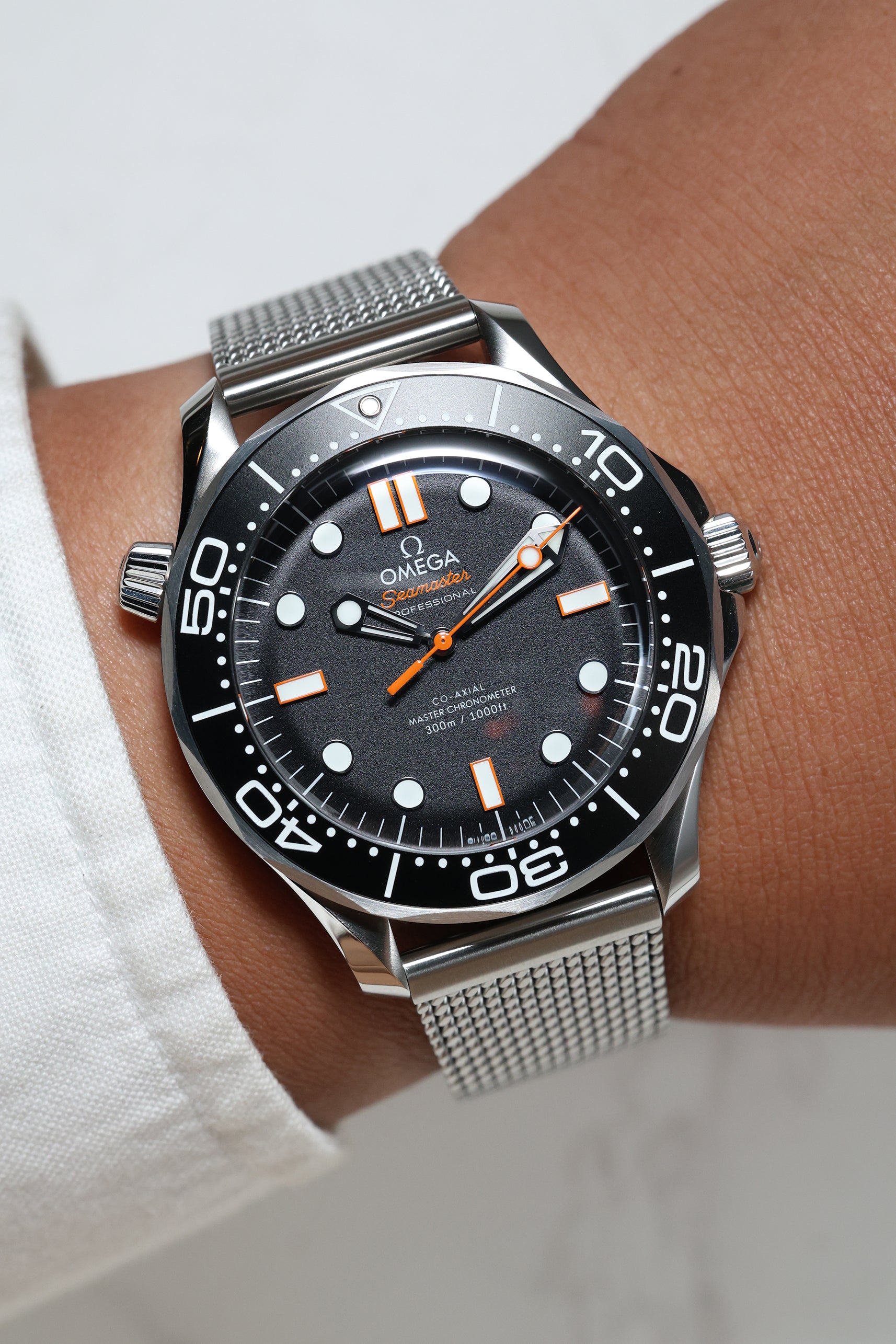 The watch is presented on a sophisticated stainless steel mesh-style bracelet. This unique Milanese-style design provides an exceptionally fluid and comfortable drape on the wrist, adding a touch of vintage elegance while maintaining its robust, tool-watch capability. With its clean, symmetrical dial and bold color accents, the Seamaster Diver 300M delivers versatility with an unmistakably modern Omega flair, making it a compelling choice for both seasoned collectors and those seeking their quintessential luxury diver.