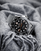 The watch's centerpiece is the striking matte black dial, which notably presents a no-date layout for a cleaner, more balanced appearance, and is intentionally crafted without the laser-engraved wave pattern of its contemporaries. This emphasizes a sleek, functional tool-watch aesthetic. The dial is highlighted by vintage-inspired color: it features orange markers at 12, 3, 6, and 9 o'clock, with a coordinating orange seconds hand. This adds a highly functional, colorful pop, which is framed by a black aluminum bezel with a crisp white diving scale.