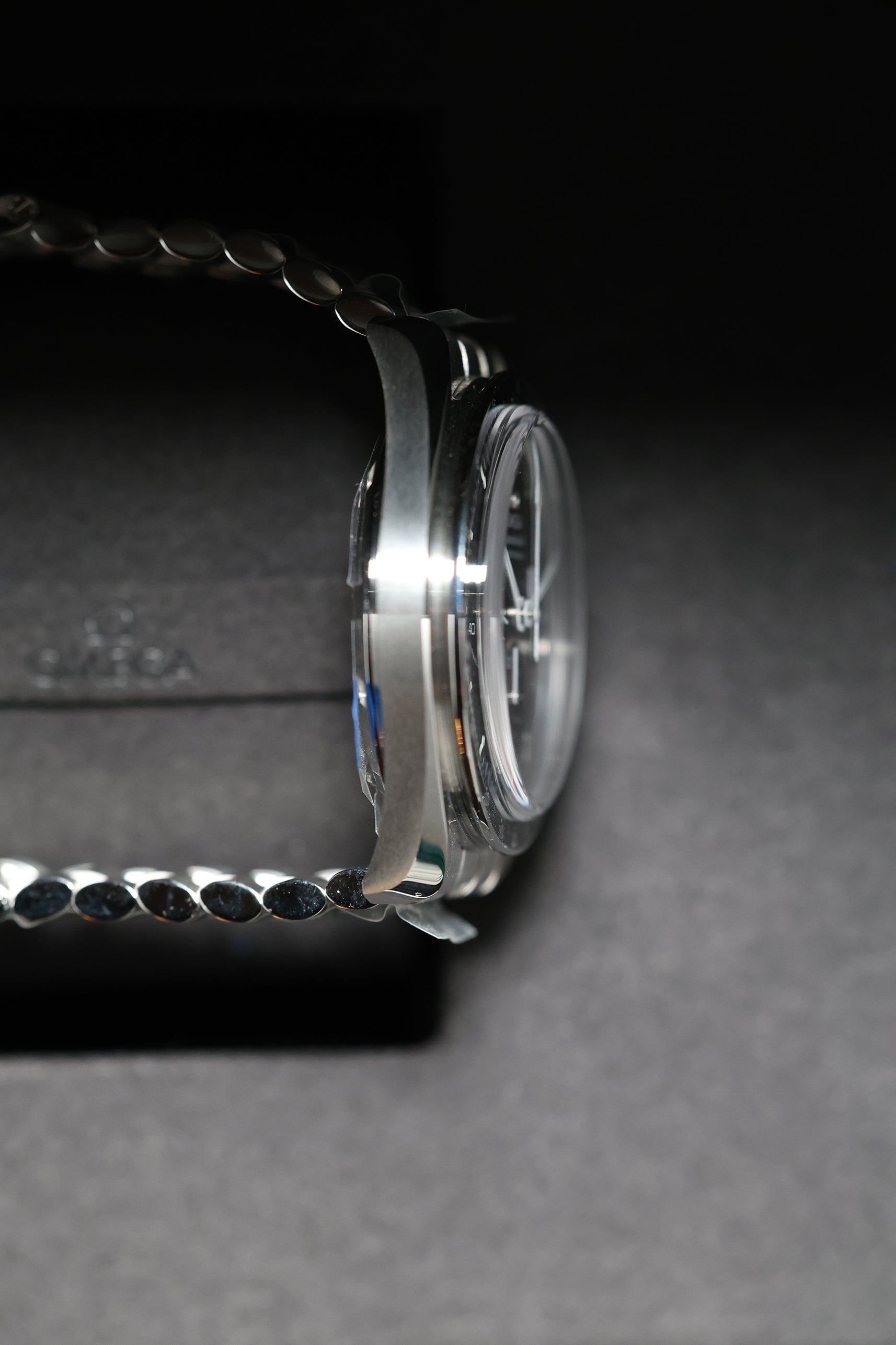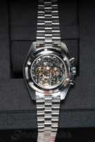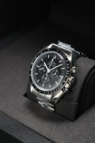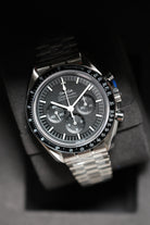The watch’s 42mm stainless steel case faithfully adheres to the classic Moonwatch proportions, featuring Omega’s signature twisted lugs for a refined touch. A scratch-resistant sapphire crystal protects the iconic black step dial, which provides exceptional legibility with its contrasting white hour markers and hands. A black anodized aluminum tachymeter bezel, true to the "dot over 90" design, completes the iconic look, offering a bold and functional element for measuring speed. This model is paired with a robust brushed stainless steel bracelet, designed for optimal comfort and versatility across all occasions.