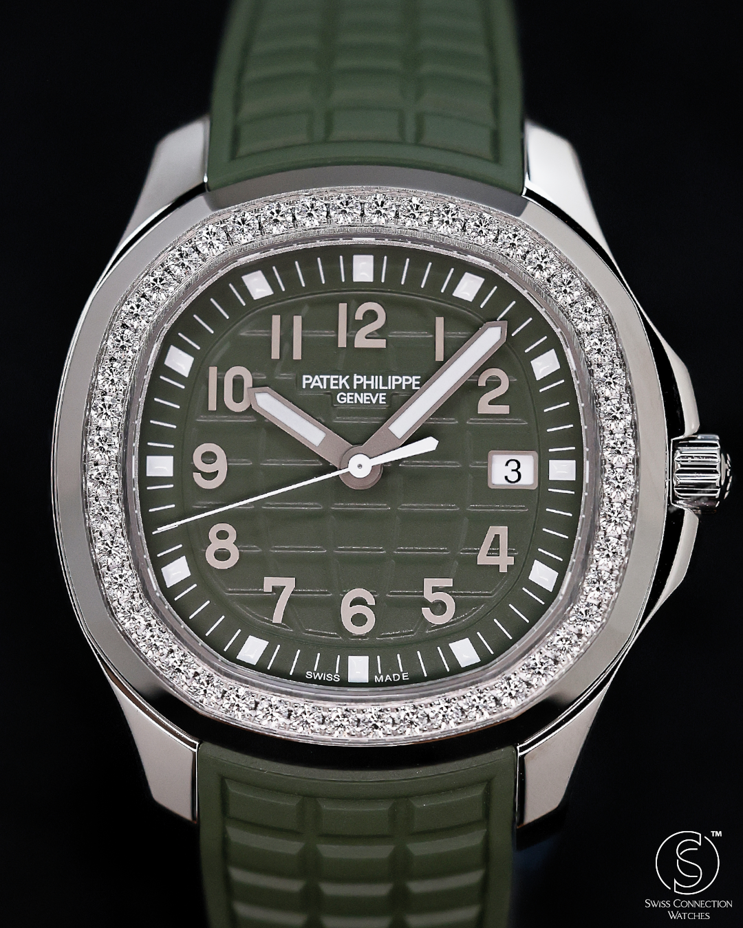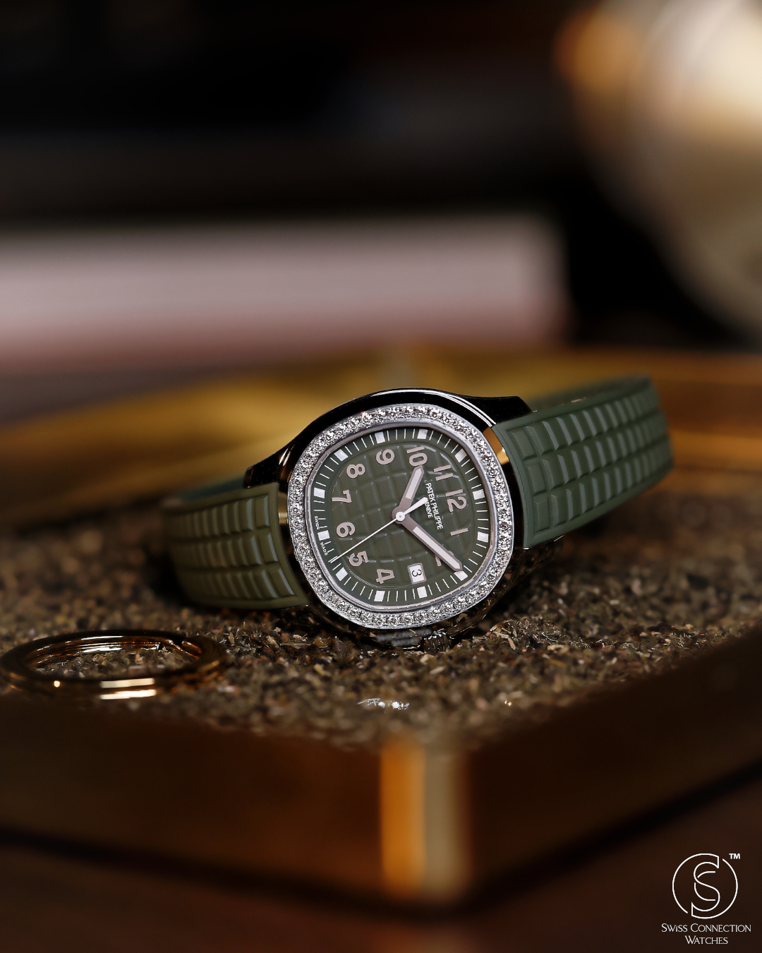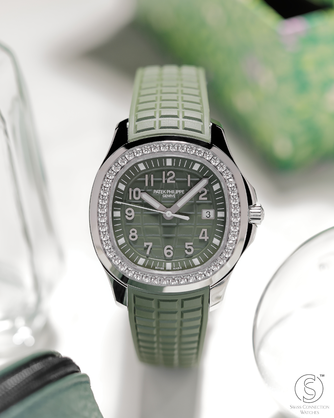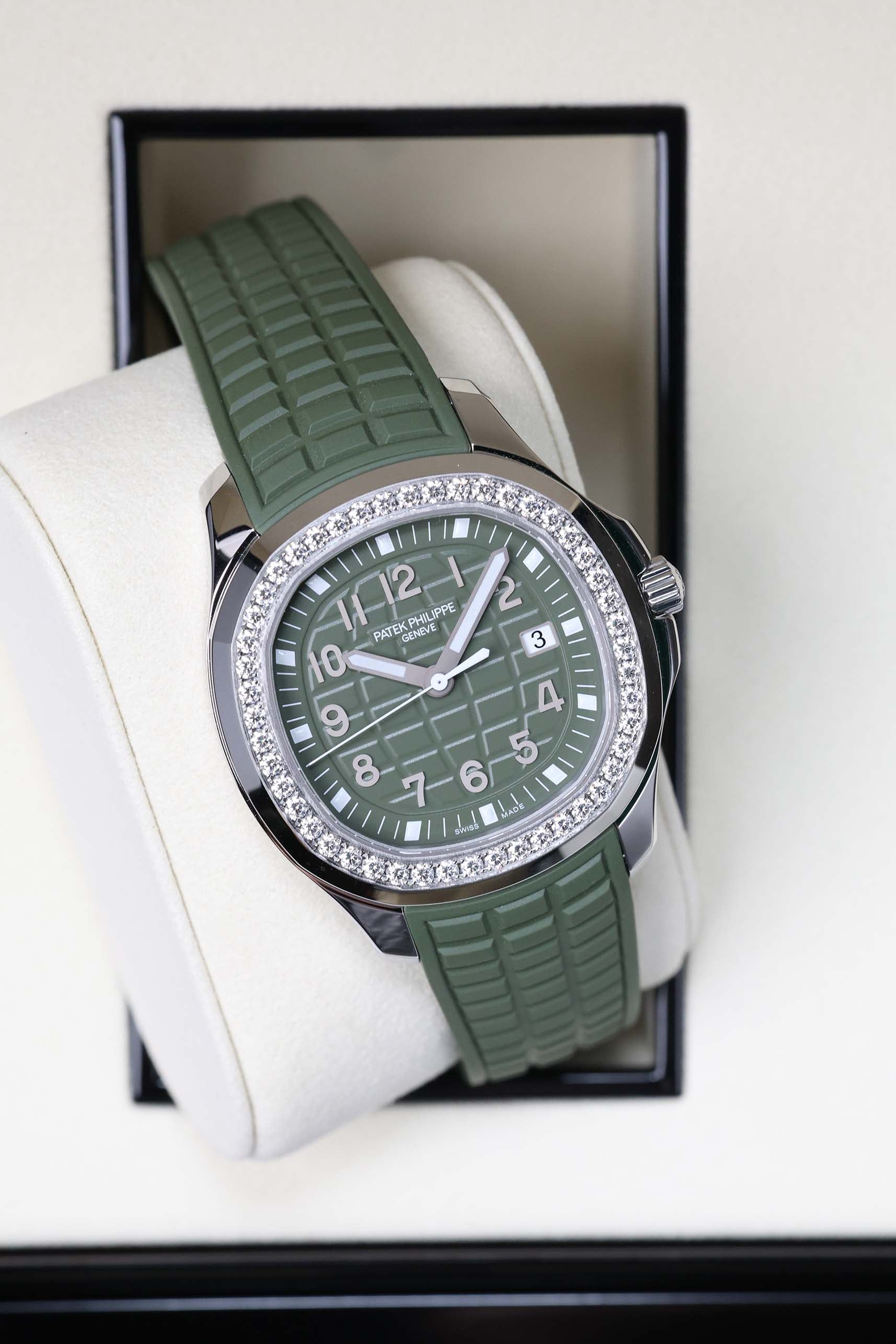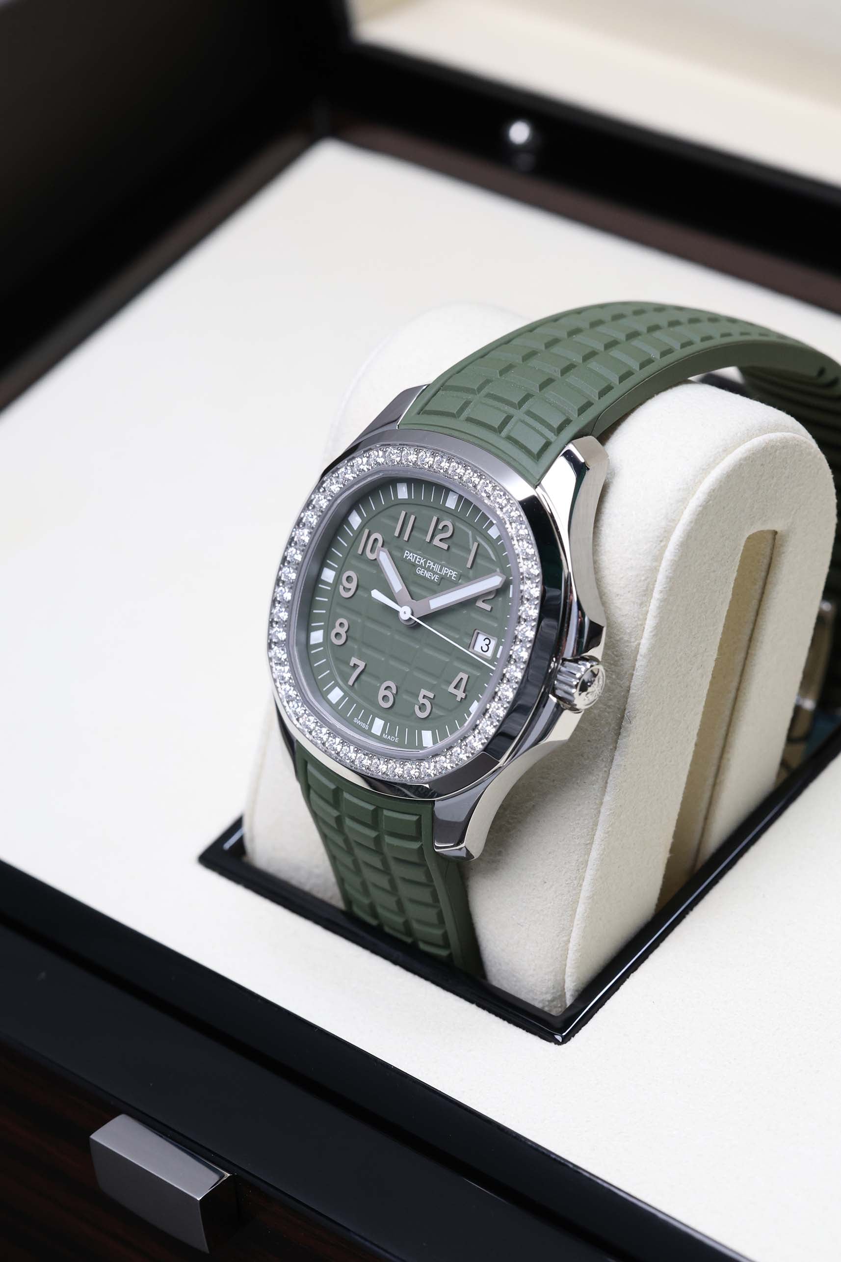 The Patek Philippe Aquanaut Luce reference 5267/200A-011 is the definitive "sport-chic" statement for the modern era. Originally launched in 2004 as a feminine counterpart to the masculine Aquanaut, the "Luce" (Italian for light) was designed to bring a radiant, gem-set energy to the collection’s rugged architecture. This specific iteration in Khaki Green—introduced in 2021—capitalizes on the "military-luxe" trend, offering a timepiece that is as comfortable in a boardroom as it is on a remote beach.