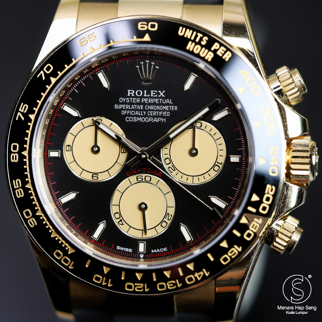 The Rolex Daytona reference 126518LN, representing the new generation of the iconic chronograph, is a masterclass in luxury watchmaking that blends bold aesthetics with high-performance functionality. Housed in a stunning 40mm 18k yellow gold case, it immediately commands attention. The polished gold offers a striking contrast to the fixed black Cerachrom bezel, which is engraved with the signature tachymeter scale, reinforcing the watch's deep racing heritage.