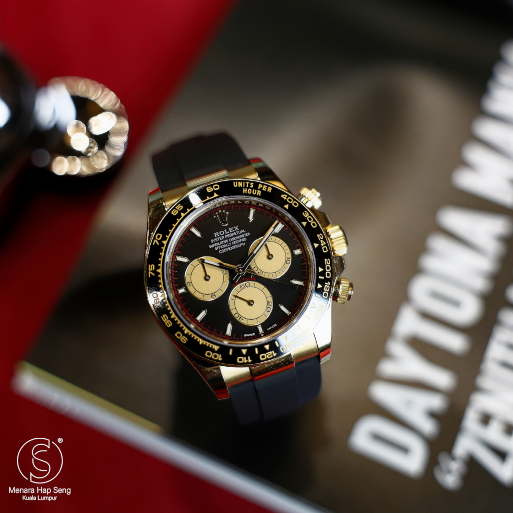 Completing this striking timepiece is the Oysterflex bracelet, a sophisticated alternative to traditional metal. Crafted from a high-performance elastomer over flexible metal blades, the Oysterflex offers the durability of a metal bracelet with the comfort and flexibility of rubber. This unique strap, paired with the bold yellow gold and the iconic Paul Newman-style dial, makes the Daytona 126518LN a highly desirable piece, perfectly fusing racing heritage, modern innovation, and high collectibility.