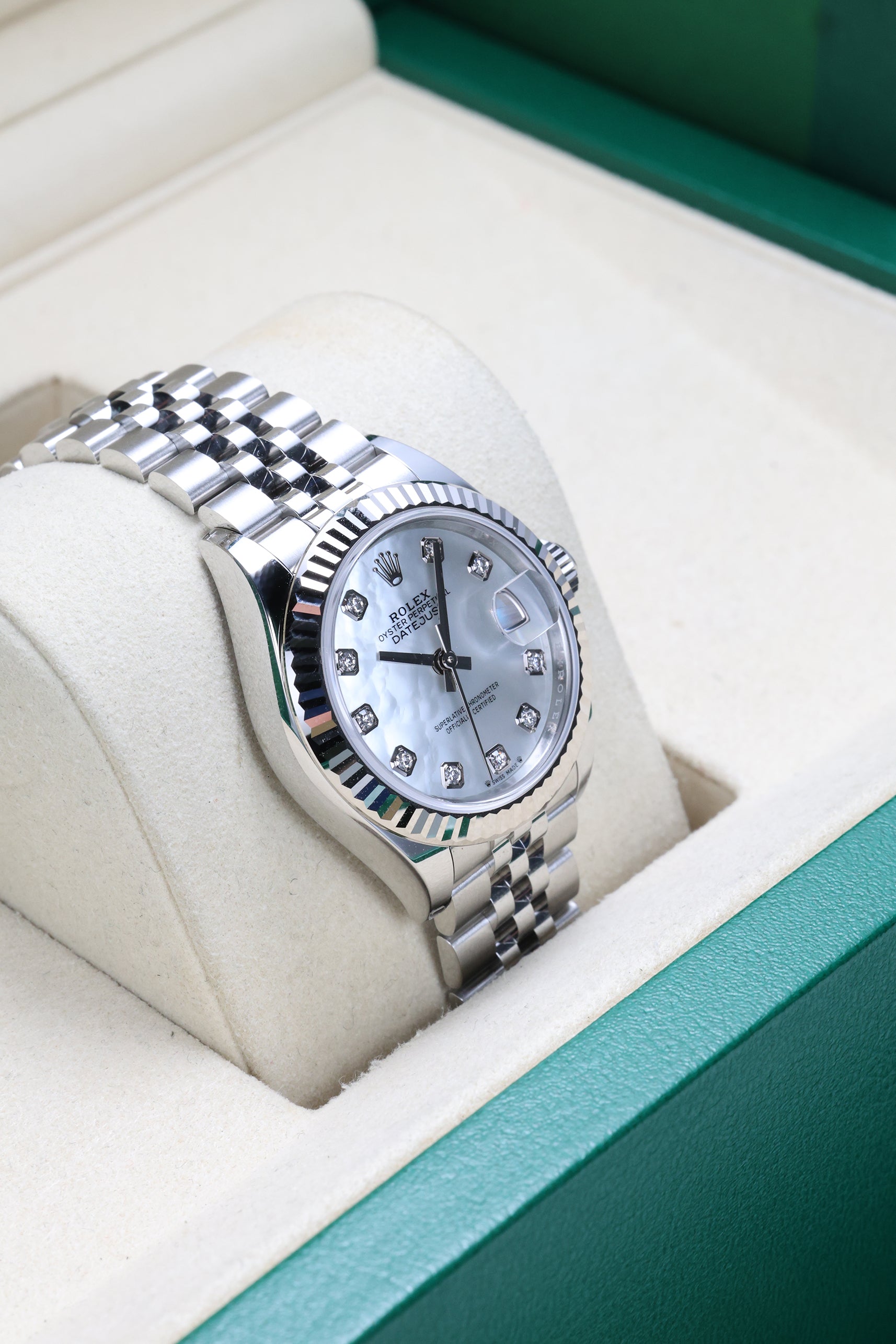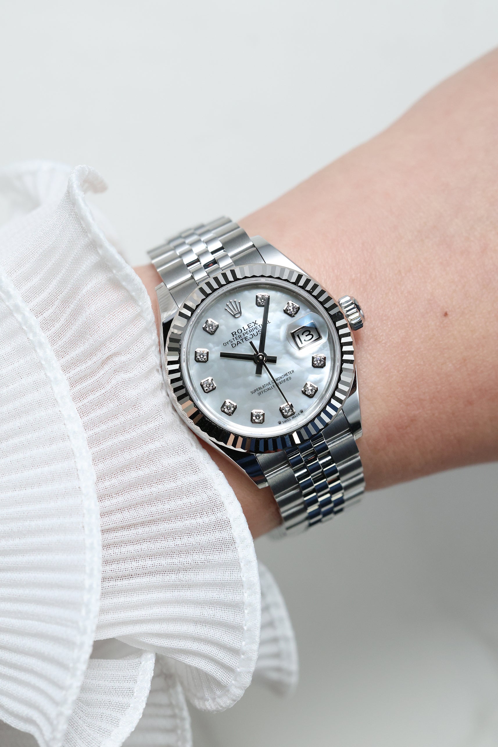 Powering this exquisite timepiece is Rolex's latest in-house automatic movement, ensuring superior precision, durability, and reliability. This movement is certified as a Superlative Chronometer, guaranteeing outstanding performance with an enhanced 55-hour power reserve. With a robust 100-meter water resistance, the Datejust 28 in White Mother of Pearl with 10 Diamonds is more than just a beautiful accessory; it's a dependable and practical timepiece, perfectly balancing cherished tradition with a vibrant, modern spirit and captivating sparkle.