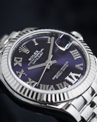 This specific Datejust 31 captivates with its rich aubergine (purple) dial, elegantly adorned with classic Roman numerals. What truly sets it apart is the exquisite detail of 11 brilliant-cut diamonds meticulously set within the Roman numeral VI, transforming this hour marker into a radiant highlight. The iconic fluted bezel, crafted from 18k white gold, frames the dial with brilliant precision, while the signature Cyclops lens magnifies the date, a hallmark of Rolex's commitment to both aesthetics and utility.