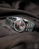 This Datejust 31 captivates with its brilliant 18k Everose gold fluted bezel and its rich Chocolate sunray dial. The dial is the watch's most captivating feature, designed with the unique 11 Diamond VI layout: eleven brilliant-cut diamonds set into the Roman numeral VI which sits prominently at the 6 o'clock position. This configuration balances the brilliance of the diamond sparkle with a classic, intentional design element. The iconic Cyclops lens magnifies the date, ensuring perfect readability and completing the elegant layout.