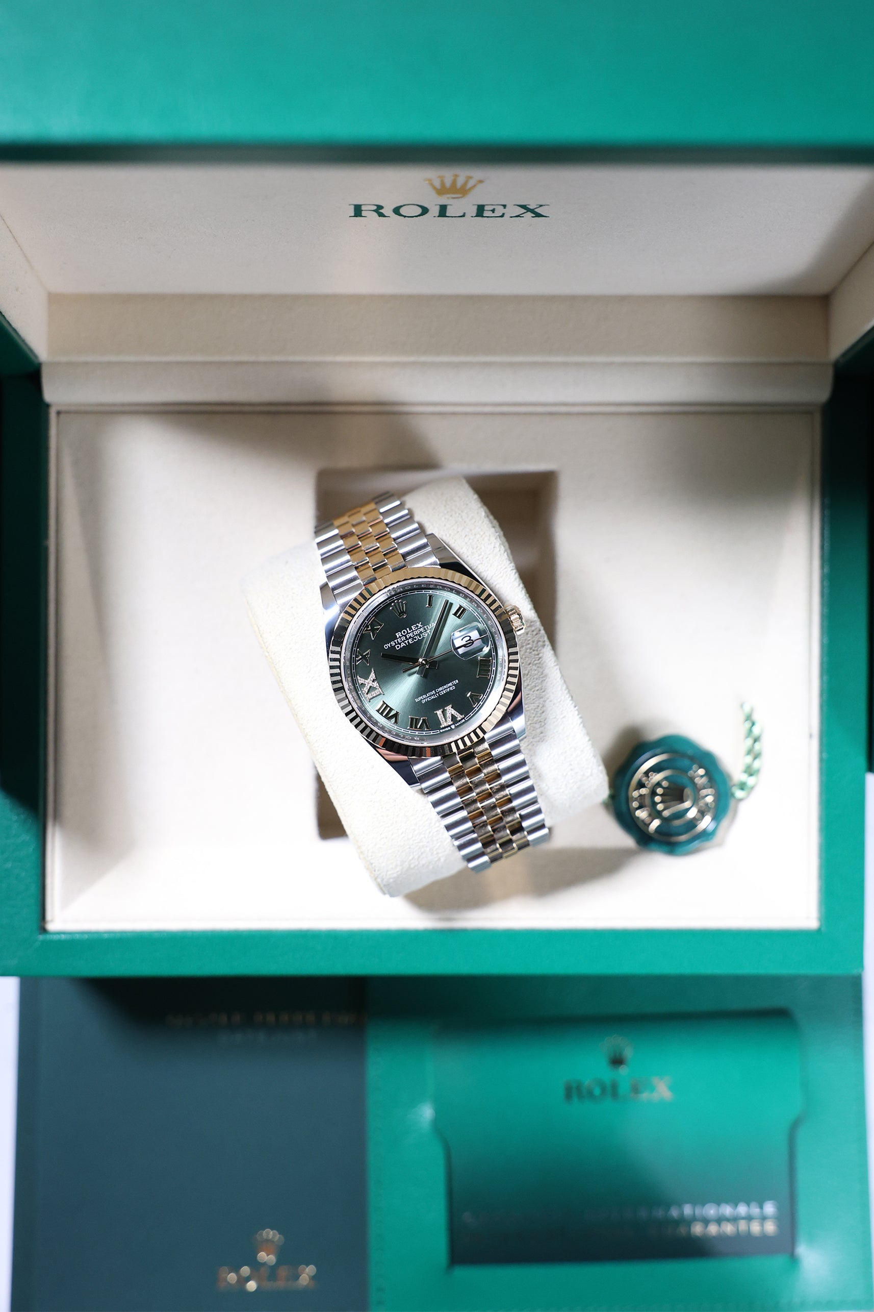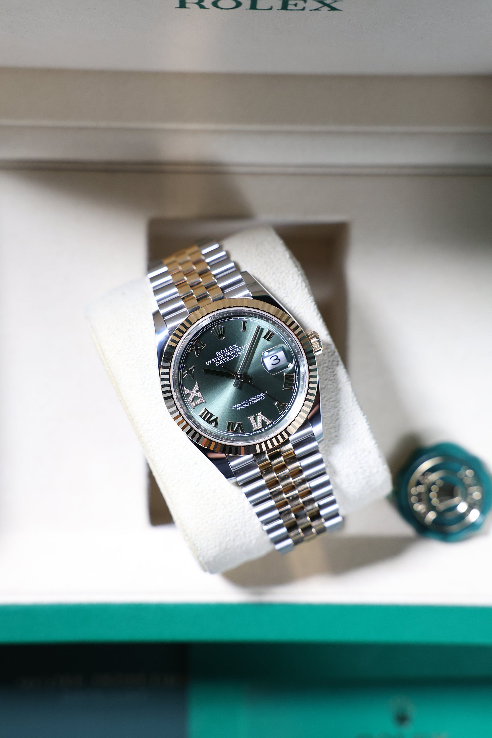 Powering this exquisite timepiece is Rolex's latest generation Calibre 3235, an in-house automatic movement boasting an impressive 70-hour power reserve. This mechanism ensures superior precision, durability, and reliability, all certified as a Superlative Chronometer. With a robust 100-meter water resistance, the Datejust 36 Olive Green with diamond-set Roman VI & IX is more than just a refined dress watch; it's a dependable and robust everyday companion, perfectly balancing cherished tradition with a touch of distinctive luxury and timeless elegance.