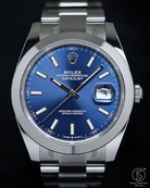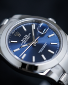 The watch's centerpiece is the captivating sunray blue dial, a popular and timeless choice. Its brilliant finish plays beautifully with light, shifting in tone and providing a dynamic visual experience on the wrist. The clean and crisp index hour markers offer superb legibility and contribute to the dial's minimalist aesthetic, ensuring the focus remains on its rich color. The iconic Cyclops lens magnifies the date, a hallmark of Rolex's commitment to both aesthetics and utility.
