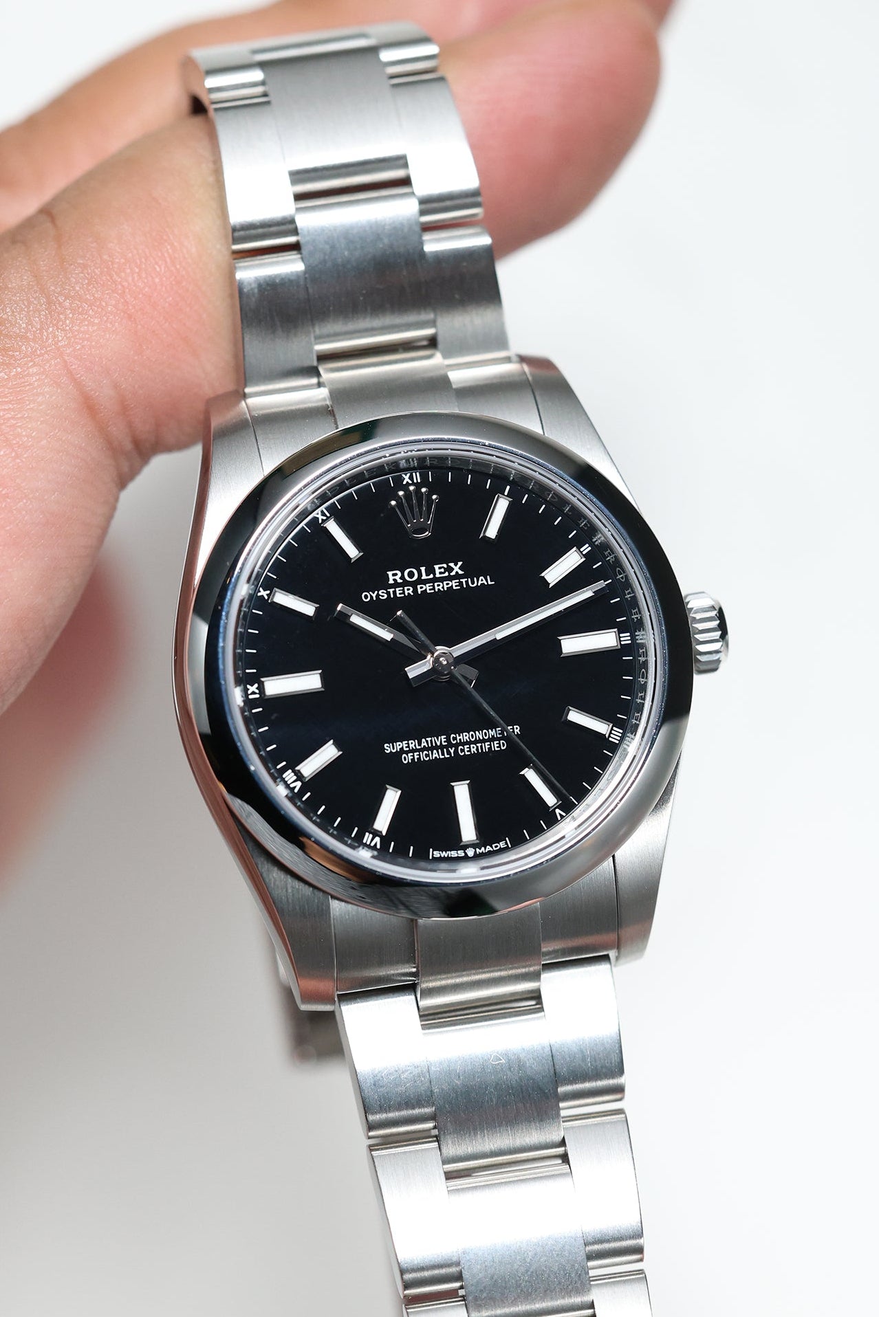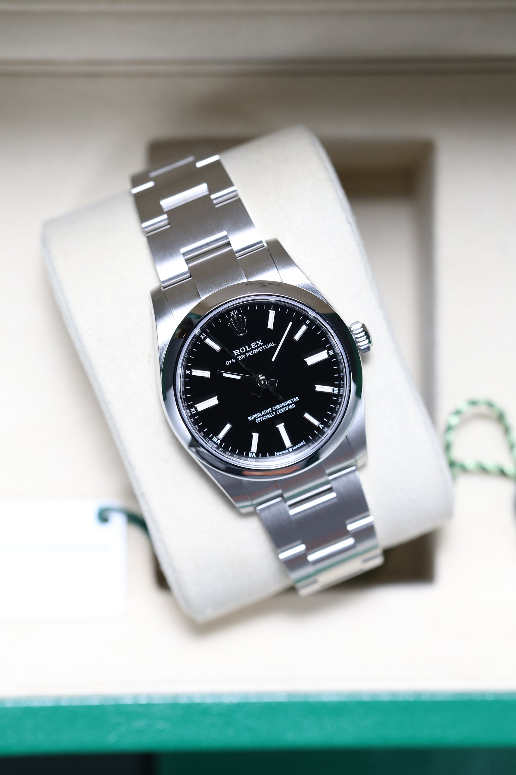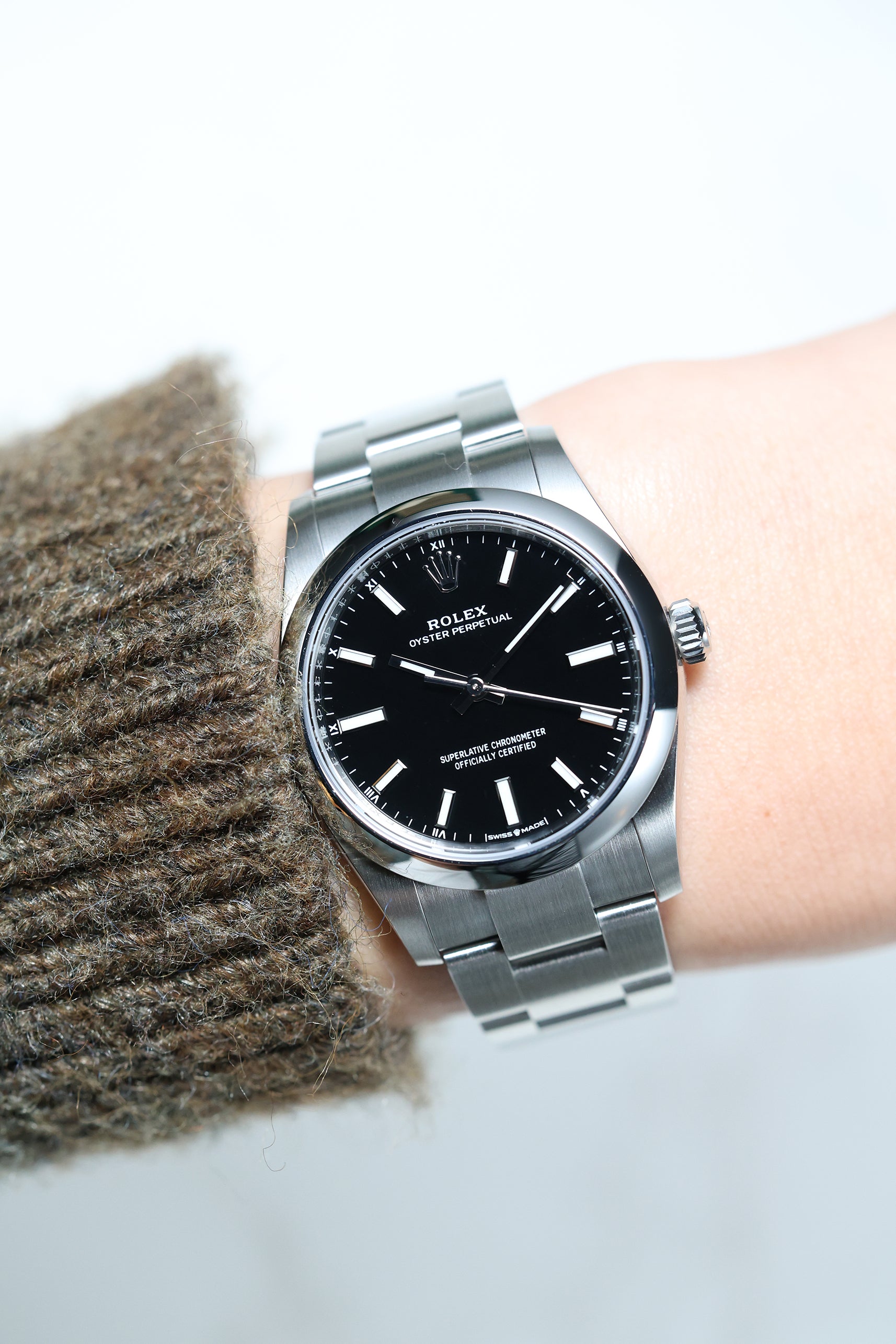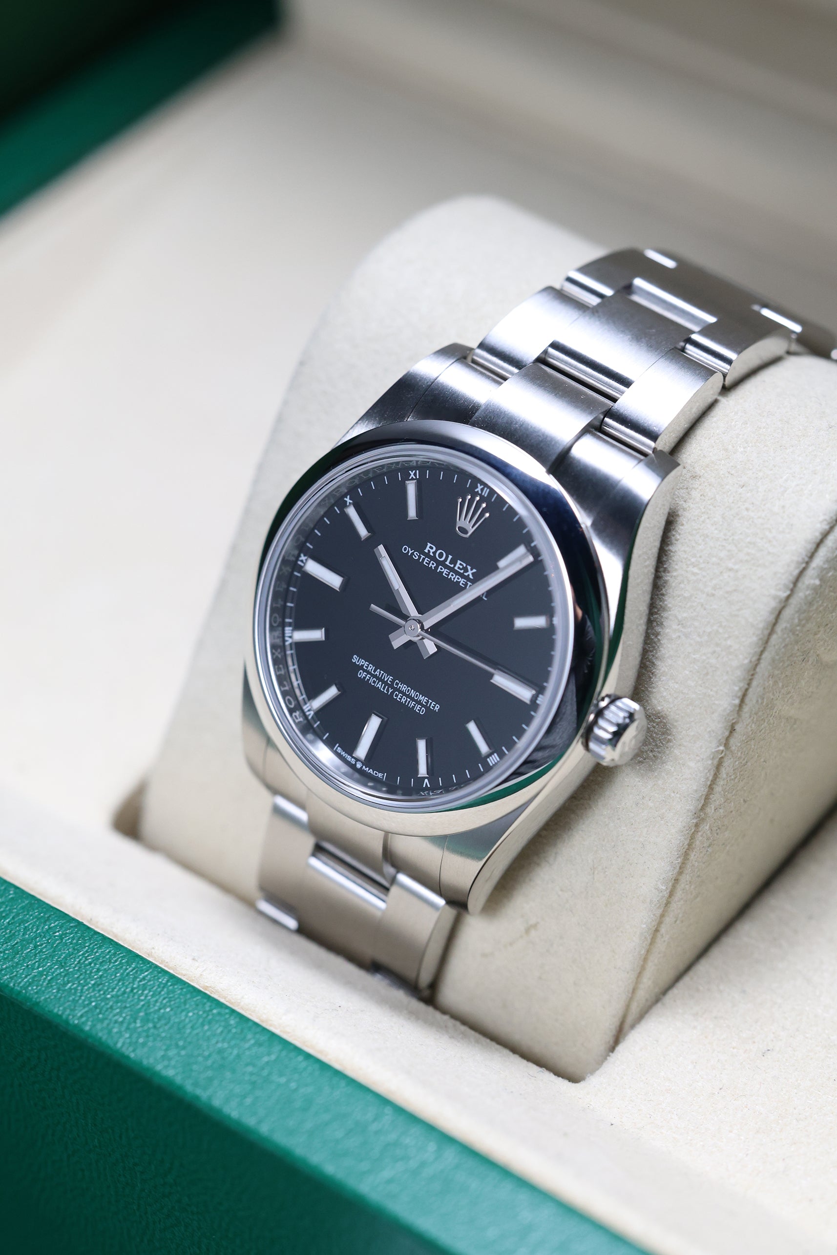 The watch is paired seamlessly with the iconic three-link Oyster bracelet, which provides a comfortable and secure fit for daily wear while maintaining an effortlessly refined aesthetic. The Rolex Oyster Perpetual 34mm with its gloss black dial offers a perfect fusion of heritage and minimalist modern style, making it a highly desirable timepiece for those seeking a watch that is both a symbol of enduring quality and a reflection of sophisticated, understated taste.