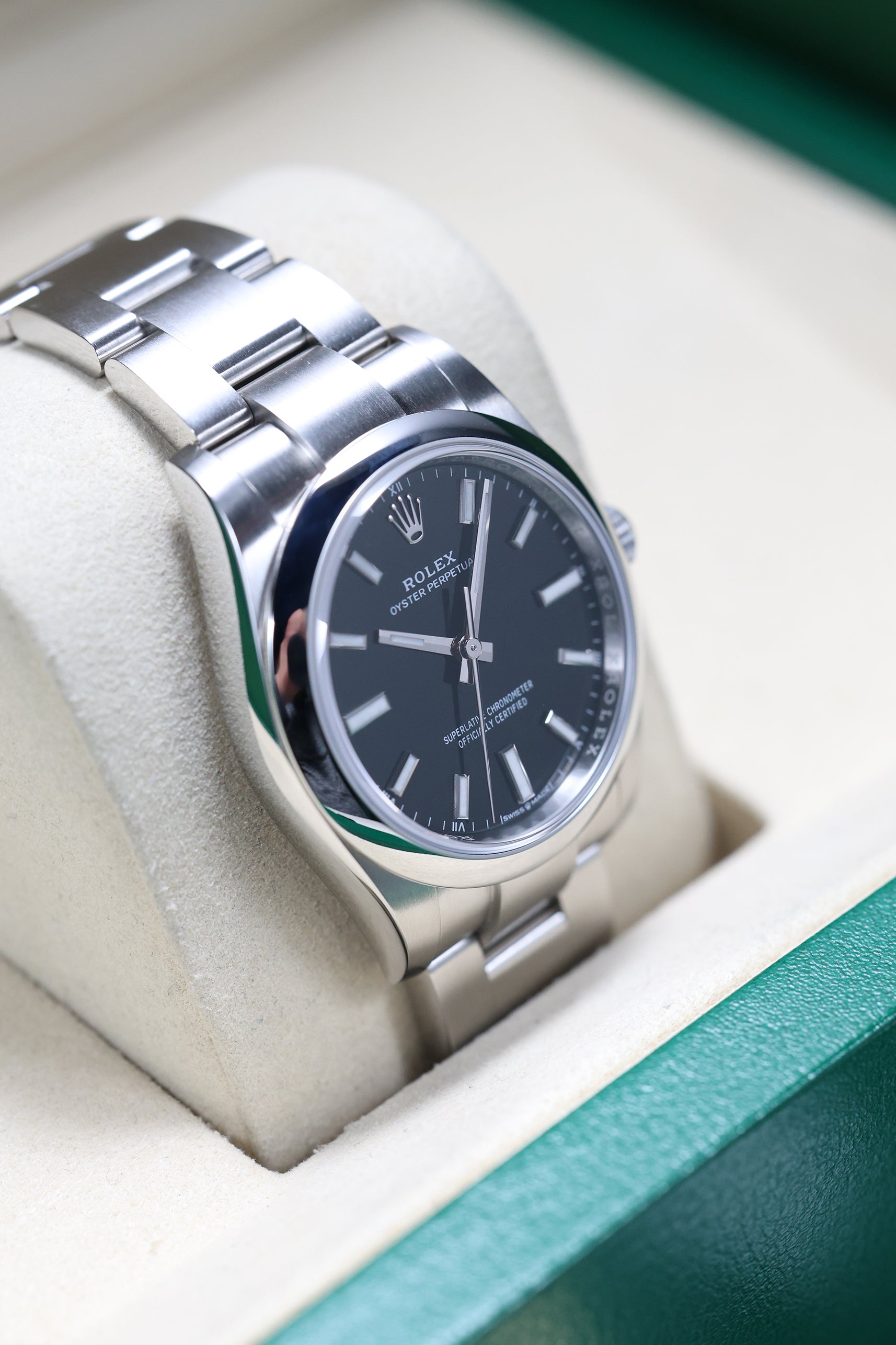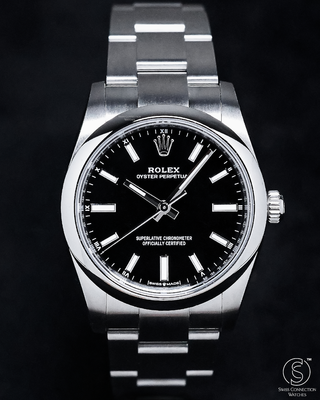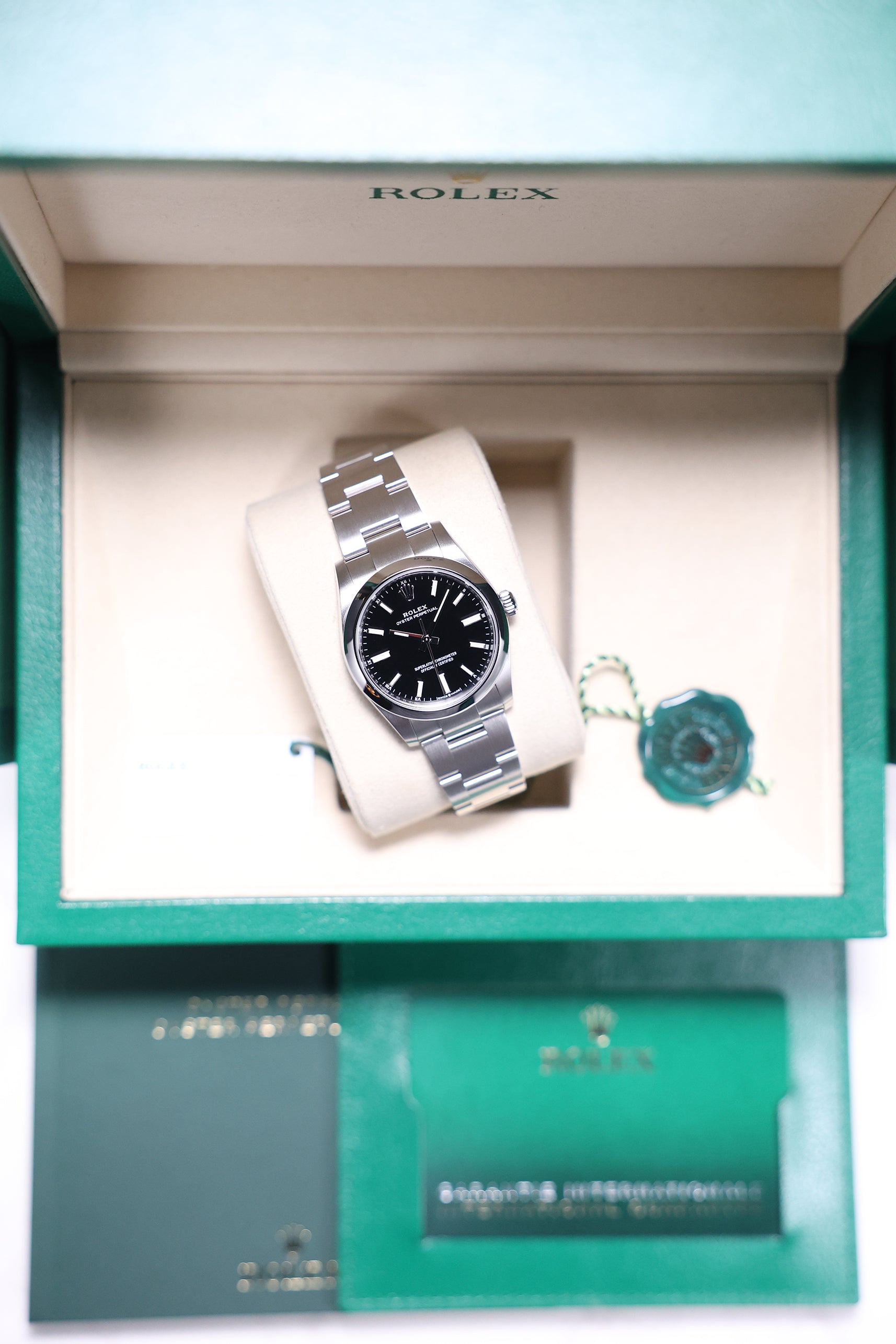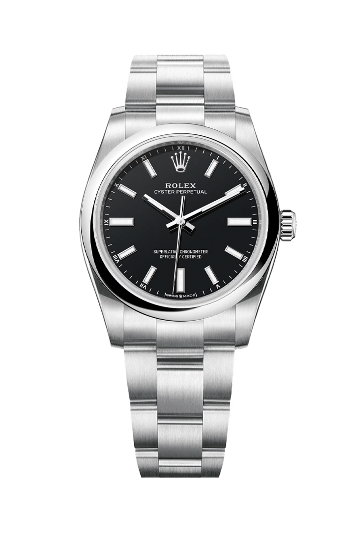 The watch is paired seamlessly with the iconic three-link Oyster bracelet, which provides a comfortable and secure fit for daily wear while maintaining an effortlessly refined aesthetic. The Rolex Oyster Perpetual 34mm with its gloss black dial offers a perfect fusion of heritage and minimalist modern style, making it a highly desirable timepiece for those seeking a watch that is both a symbol of enduring quality and a reflection of sophisticated, understated taste.