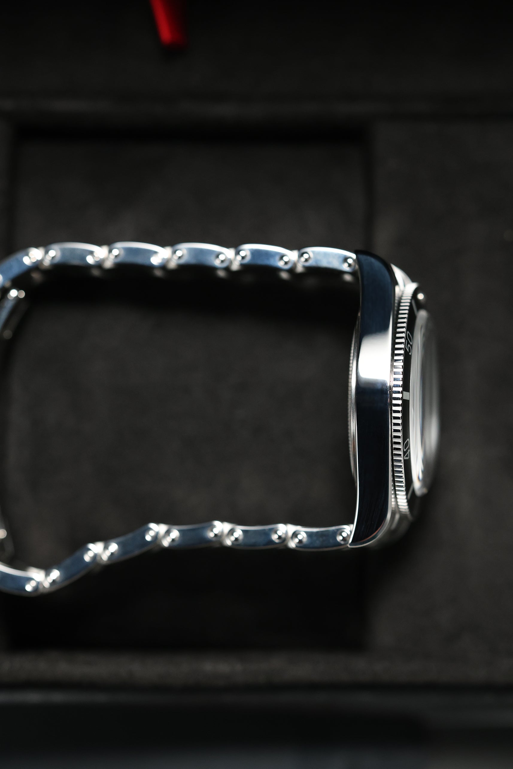 The watch is defined by its compact and historically accurate 37mm stainless steel case. This size offers superb versatility and an understated wrist presence. The polished and satin-brushed case is paired with a unidirectional rotating bezel that features a matte black anodized aluminum insert and no minute markings, staying true to its minimalist, mid-century tool-watch aesthetic.