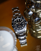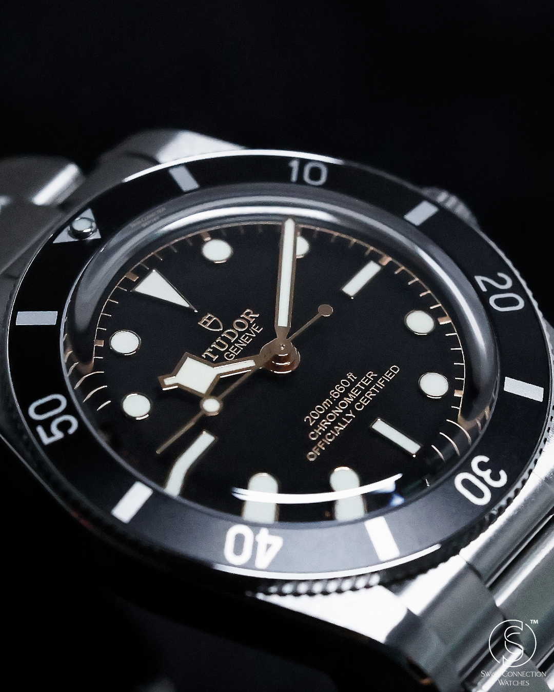 The dial is quintessentially Tudor: a clean black surface featuring applied markers and the iconic "snowflake" hands. A subtle gilt finish on the hands and minute track creates a warm vintage vibe, contrasting beautifully with the bright white Super-LumiNova for maximum legibility. The purposeful omission of a date window keeps the dial symmetrical and faithful to its pure dive-watch inspiration.