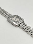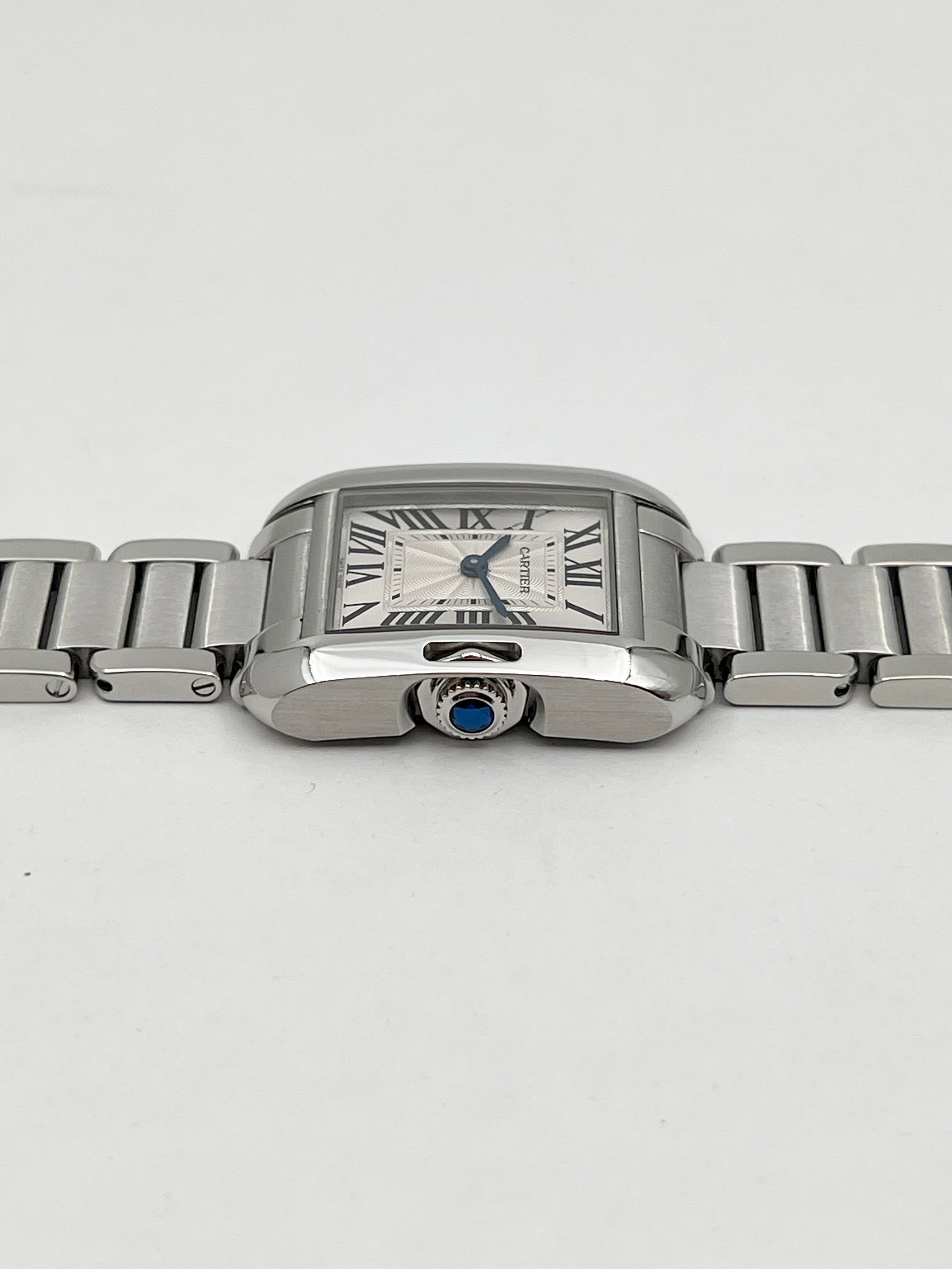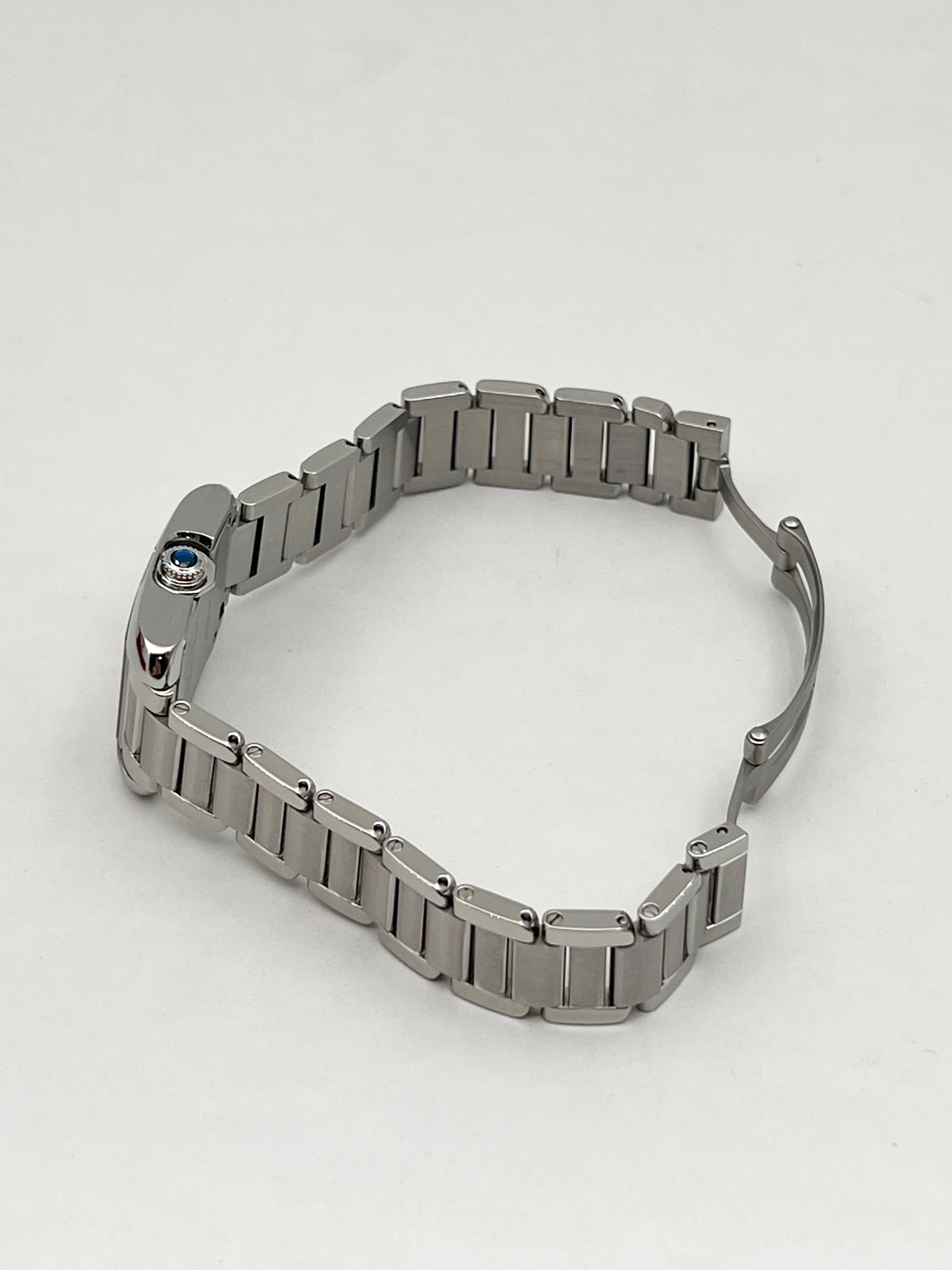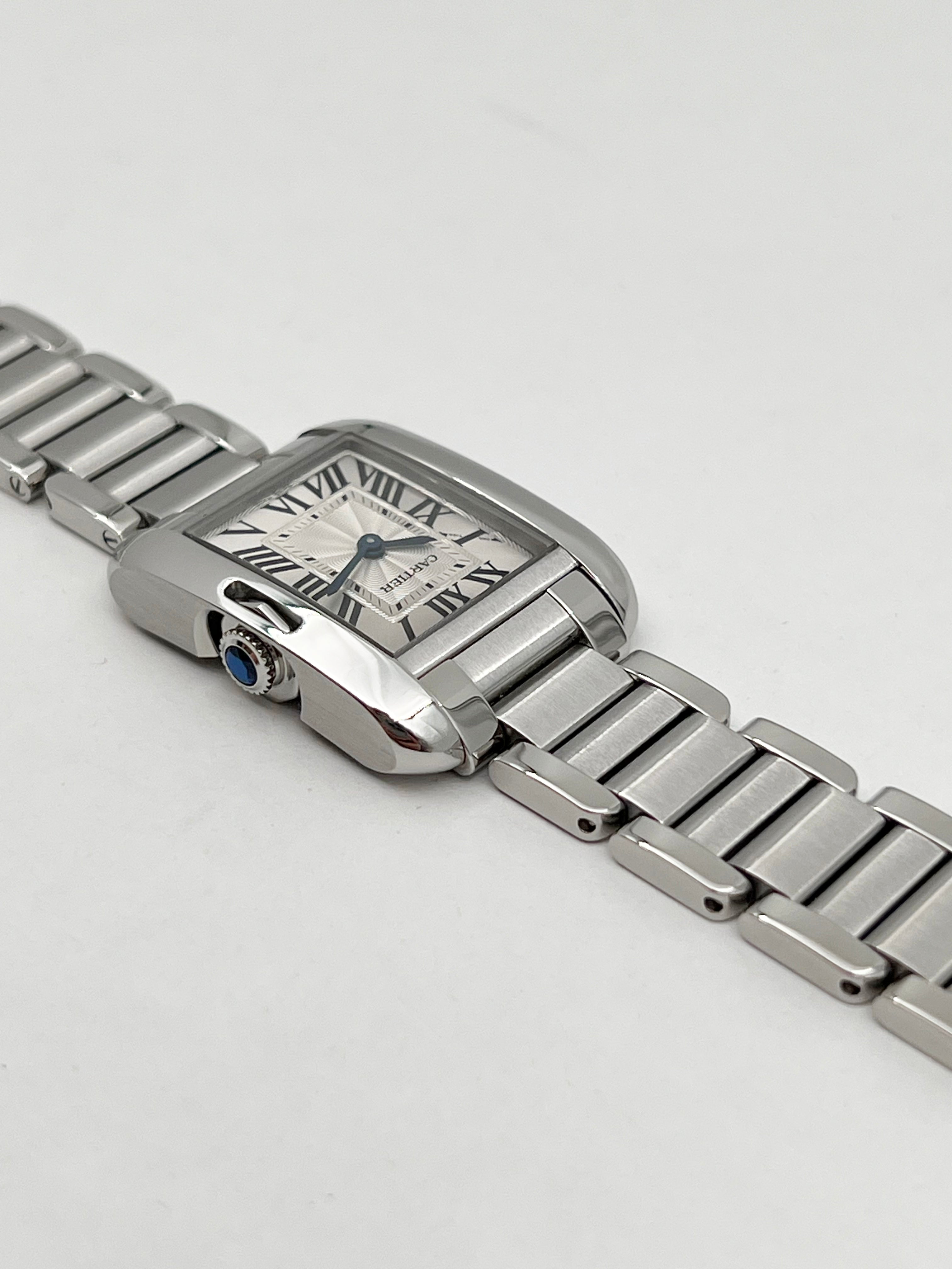 The defining characteristic of the Tank Anglaise is its integrated winding crown. Unlike the traditional Tank where the crown sits prominently on the side, Cartier’s designers recessed the crown directly into the right brancard (side bar). This feat of engineering results in a perfectly symmetrical and streamlined profile, protected by a polished sapphire cabochon. The stainless steel case is notably more rounded and sculptural than its predecessors, featuring gently curved brancards that flow seamlessly into the bracelet, allowing the watch to wrap around the wrist with exceptional comfort and fluidity.