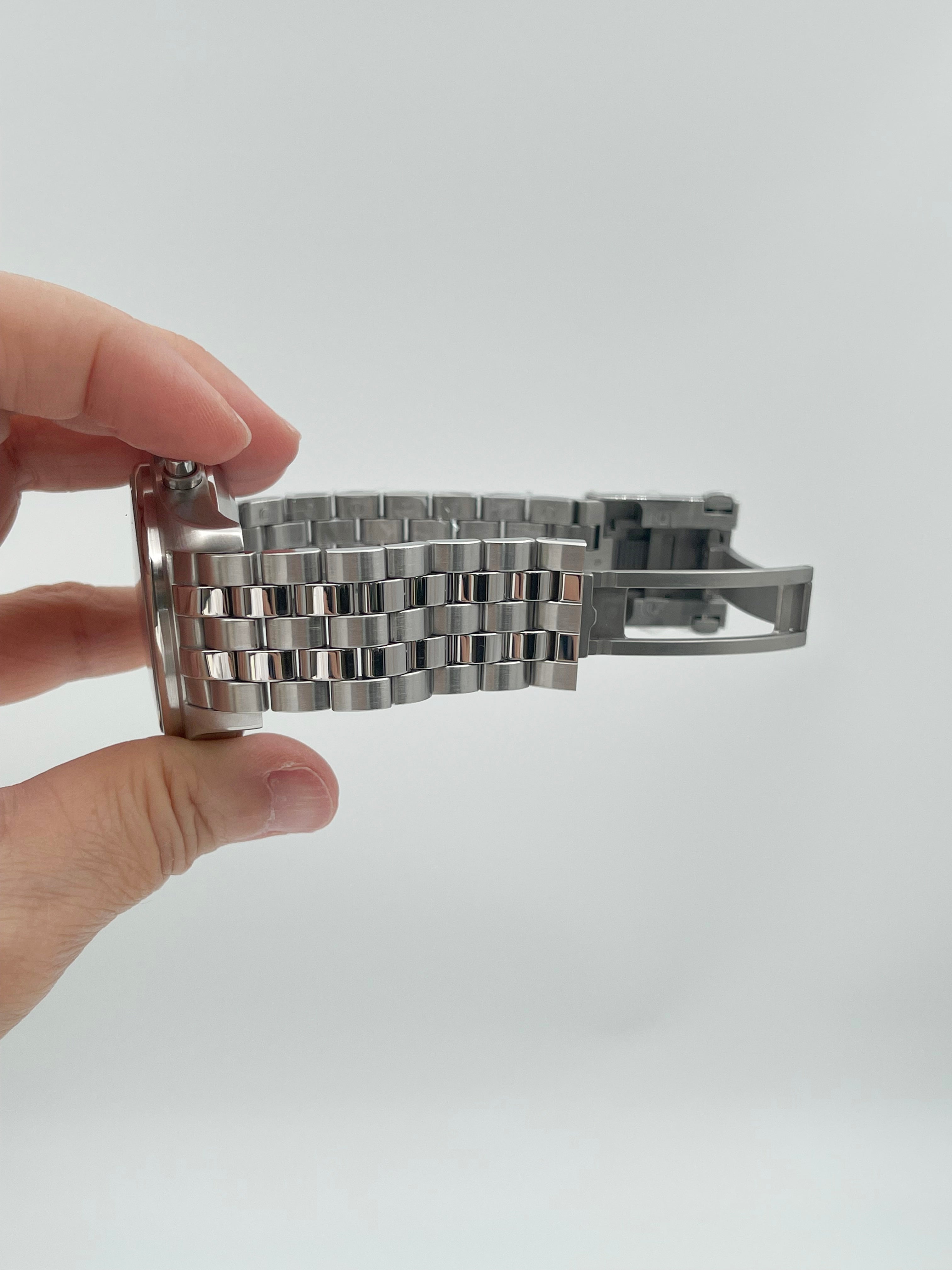 At first glance, the 43mm stainless steel case exudes a powerful, purposeful presence, reflecting the instrument panels that inspired its design. The iconic black dial is a model of clarity, featuring bold white Arabic numerals and propeller-style hands, all treated with luminescence for optimal readability in any condition. The characteristic day and date displays are cleanly integrated at 3 o'clock, while the three sub-dials are thoughtfully arranged for intuitive chronograph timing, ensuring that vital information is always instantly accessible.