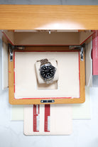 Housed in a classic 41mm stainless steel case with the signature scalloped bezel, the watch features a matte aluminium bezel insert. This detail gives the watch a softer, more traditional aesthetic compared to the sharper sheen of ceramic, and allows for the development of a unique patina over time. The professional identity is reinforced by the functional helium escape valve at 10 o’clock.