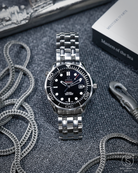 Crucially, the black dial is characterized by its smooth, clean lacquer finish, deliberately omitting the iconic wave motif. This choice results in a highly legible and uncluttered aesthetic, appealing to those who prefer a more traditional, symmetrical tool-watch look. The dial features applied hour markers filled with bright Super-LumiNova, and skeletonized hands, with a practical date window at 3 o’clock. Paired with the distinctive Seamaster five-link bracelet, the watch wears comfortably and confidently.
