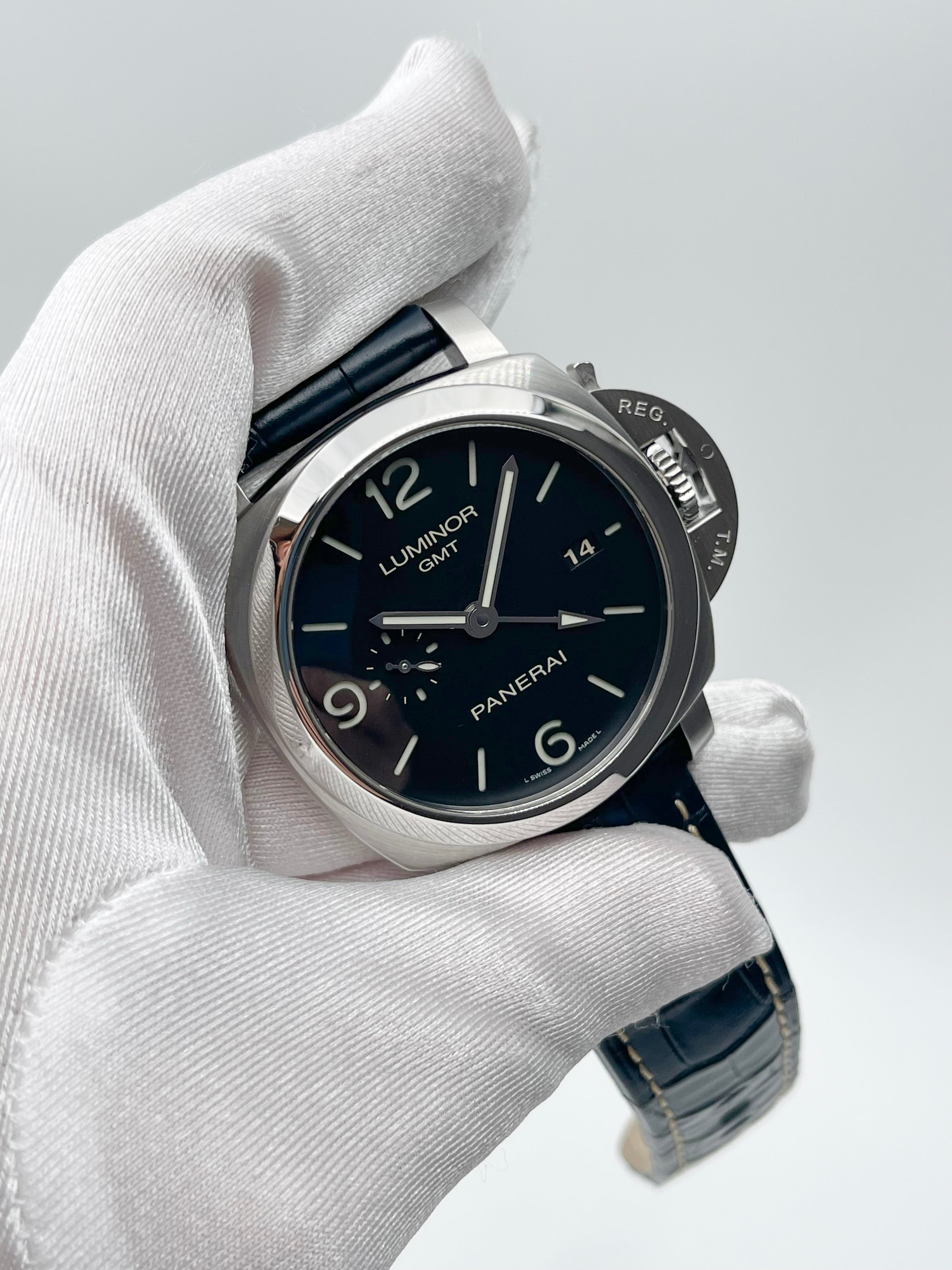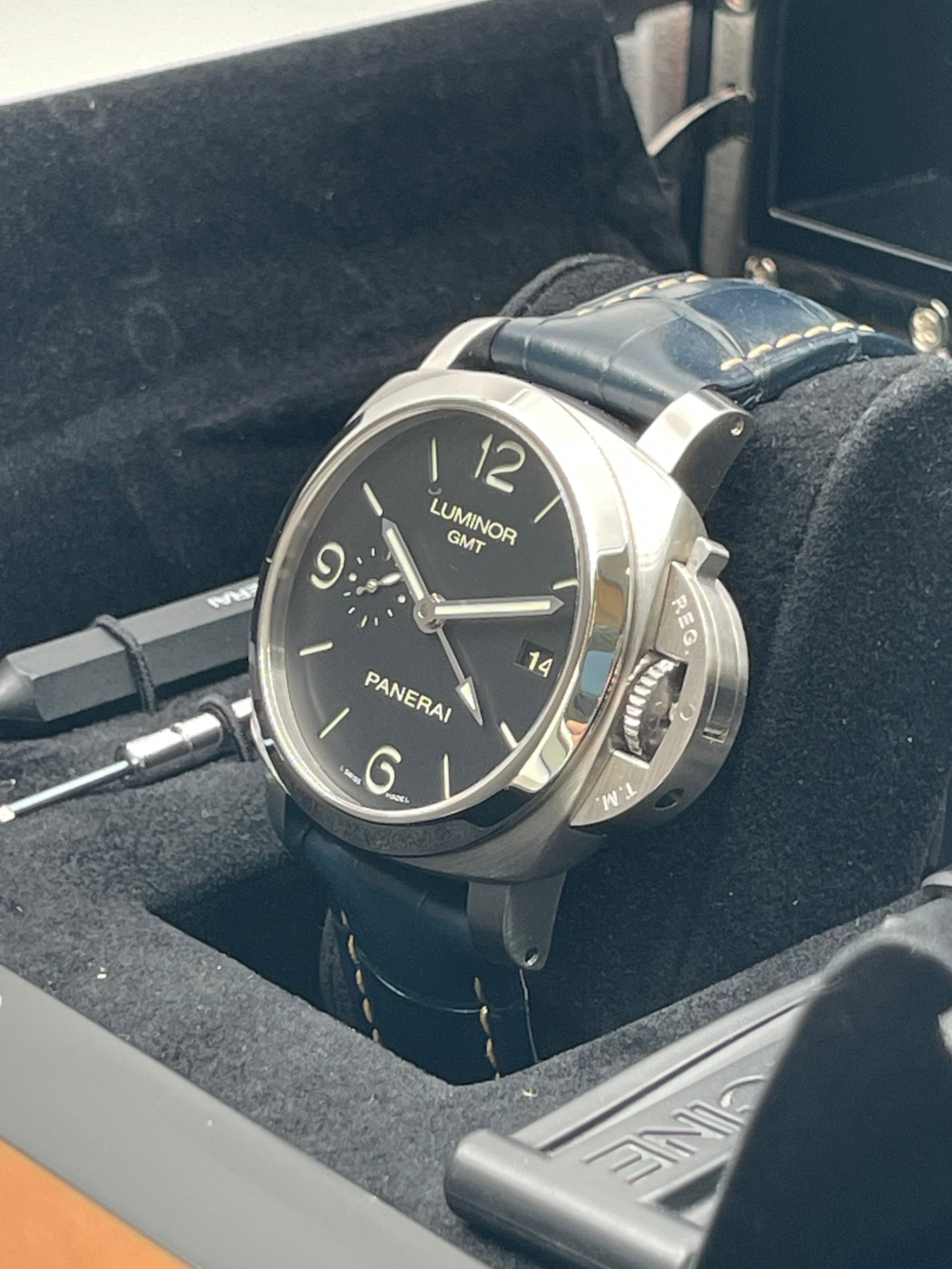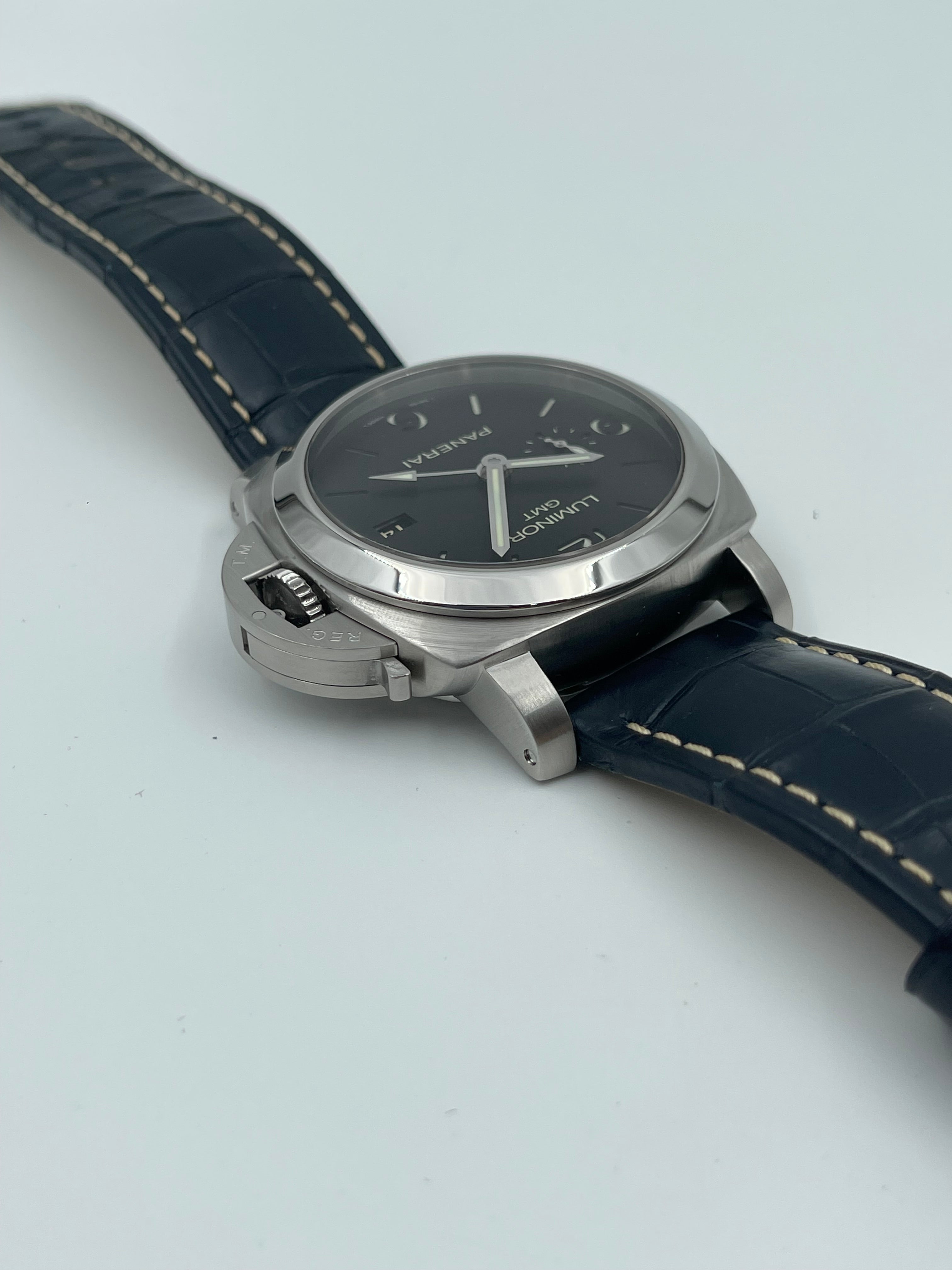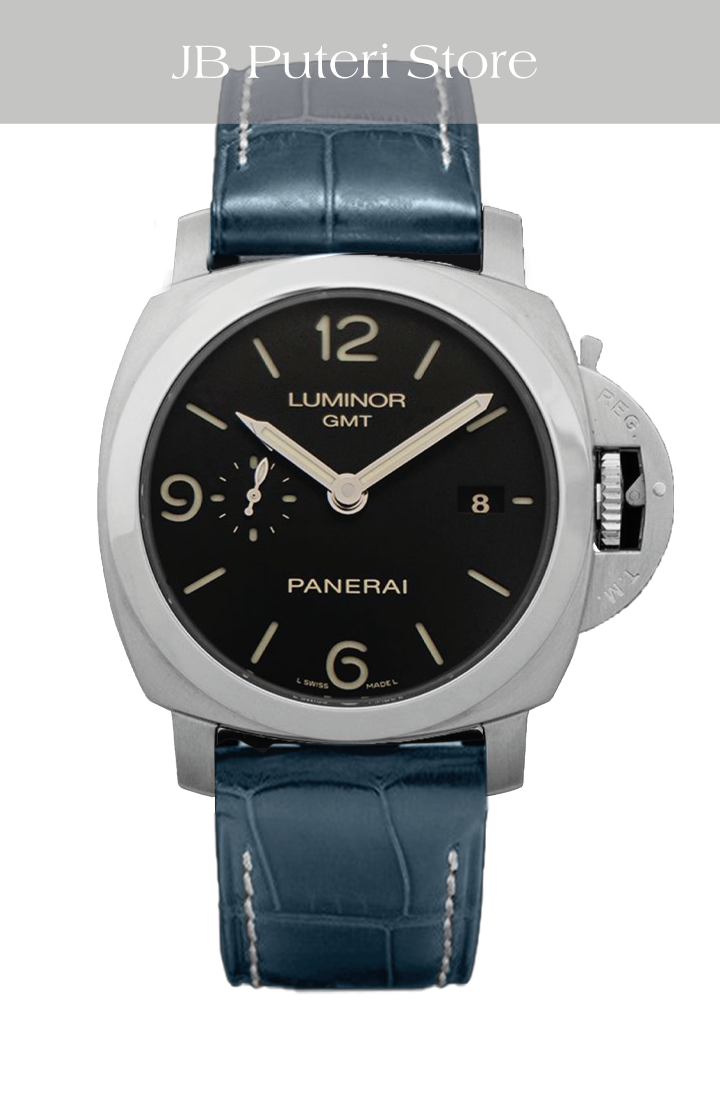 The Panerai Luminor 1950 3 Days GMT PAM00320 is a distinctive timepiece that blends Panerai's rich history with modern functionality. The watch’s design is rooted in the iconic Luminor 1950 case, with its signature cushion shape and robust crown guard, which provides both water resistance and a rugged look. At 44mm, it has the bold, oversized presence typical of Panerai, making it a standout on the wrist. The black sandwich dial, with luminous cutouts, ensures excellent legibility, a hallmark of Panerai's tool-watch heritage.