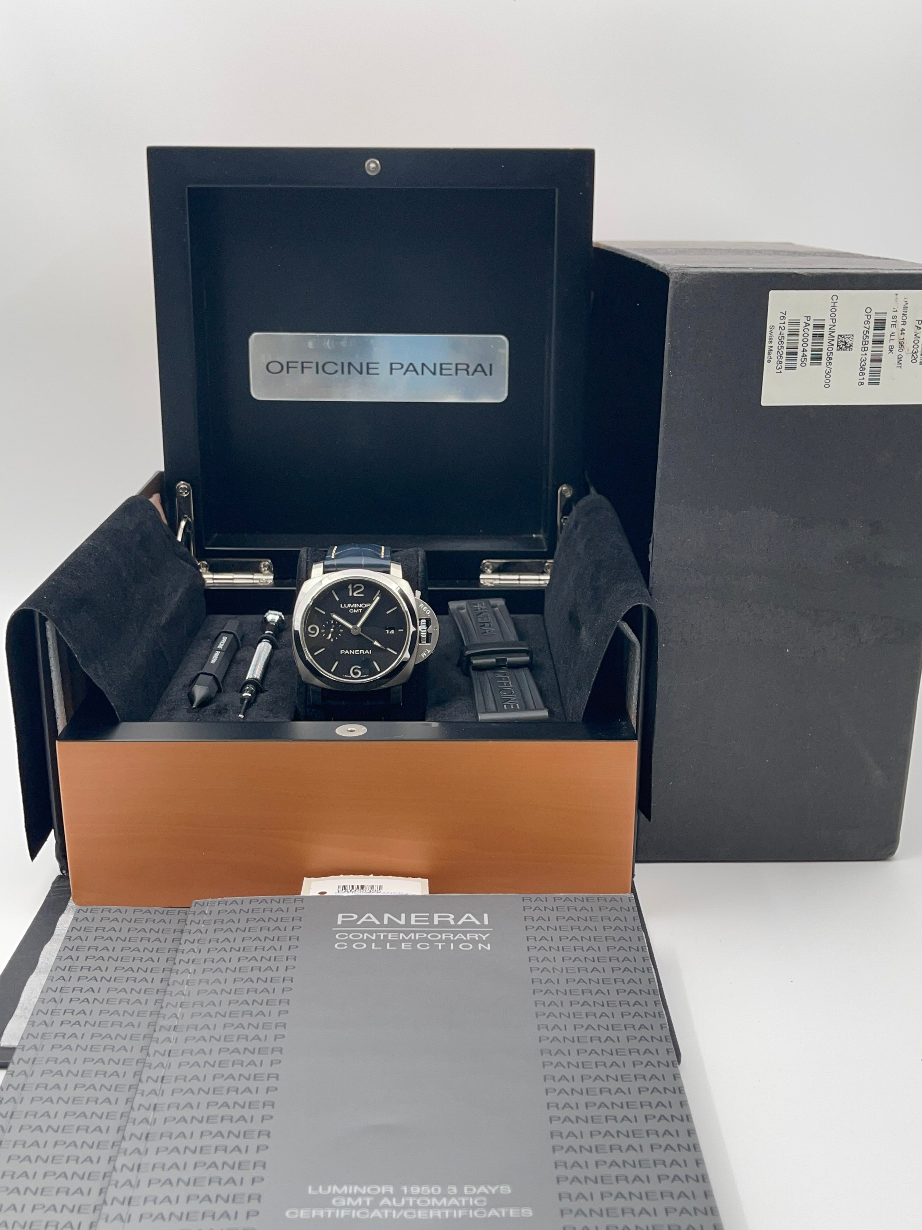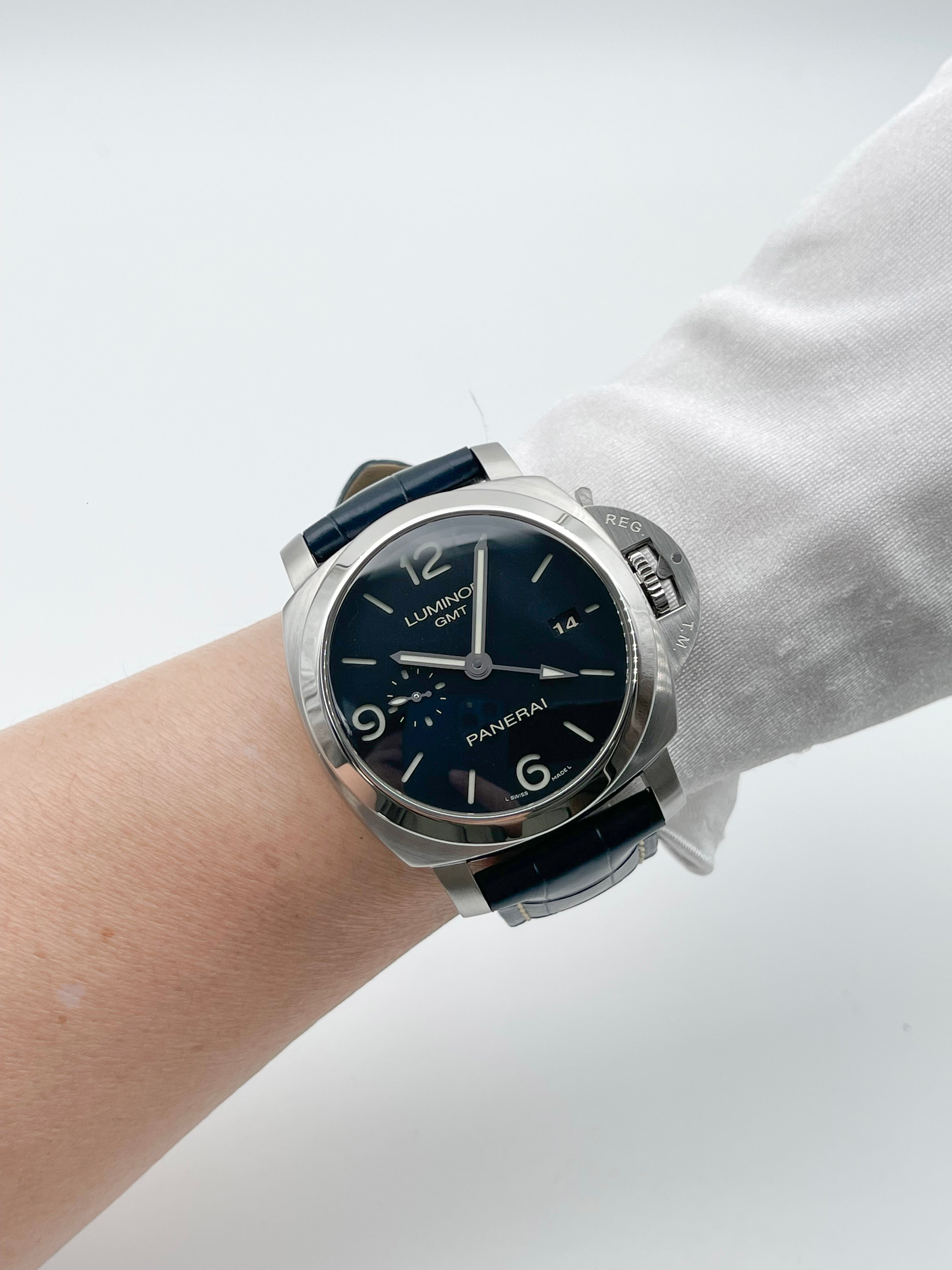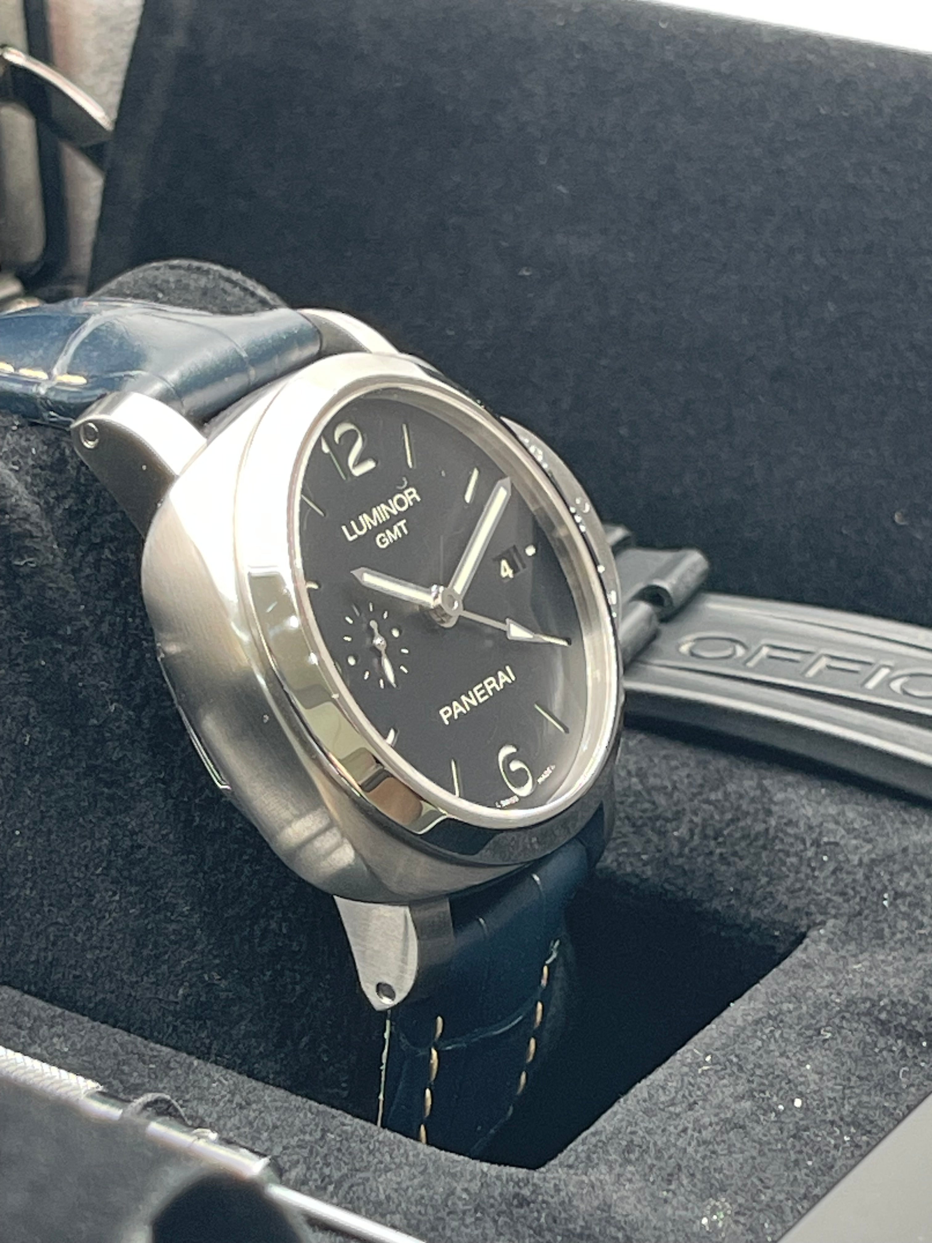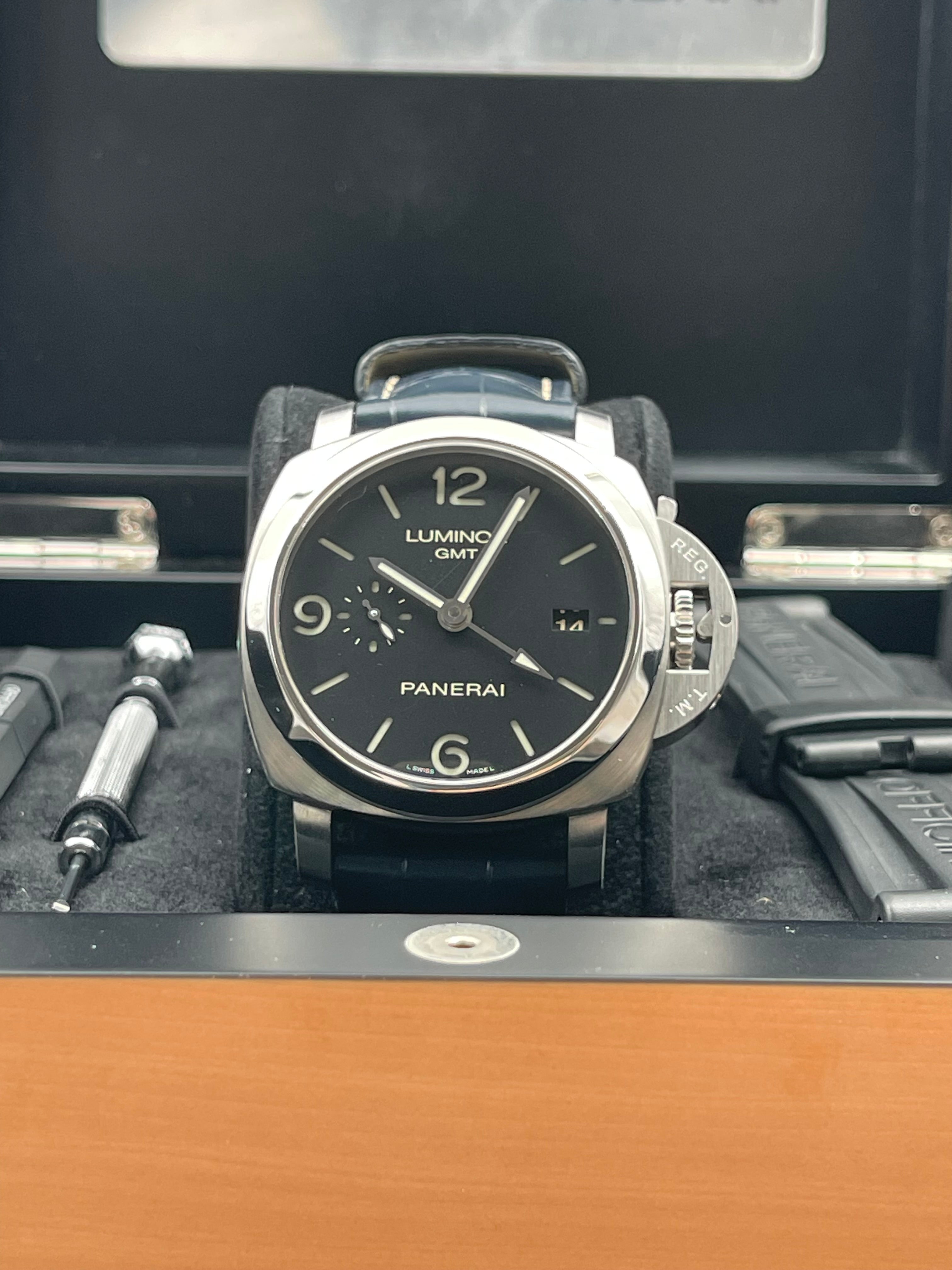 The Panerai Luminor 1950 3 Days GMT PAM00320 is a distinctive timepiece that blends Panerai's rich history with modern functionality. The watch’s design is rooted in the iconic Luminor 1950 case, with its signature cushion shape and robust crown guard, which provides both water resistance and a rugged look. At 44mm, it has the bold, oversized presence typical of Panerai, making it a standout on the wrist. The black sandwich dial, with luminous cutouts, ensures excellent legibility, a hallmark of Panerai's tool-watch heritage.
