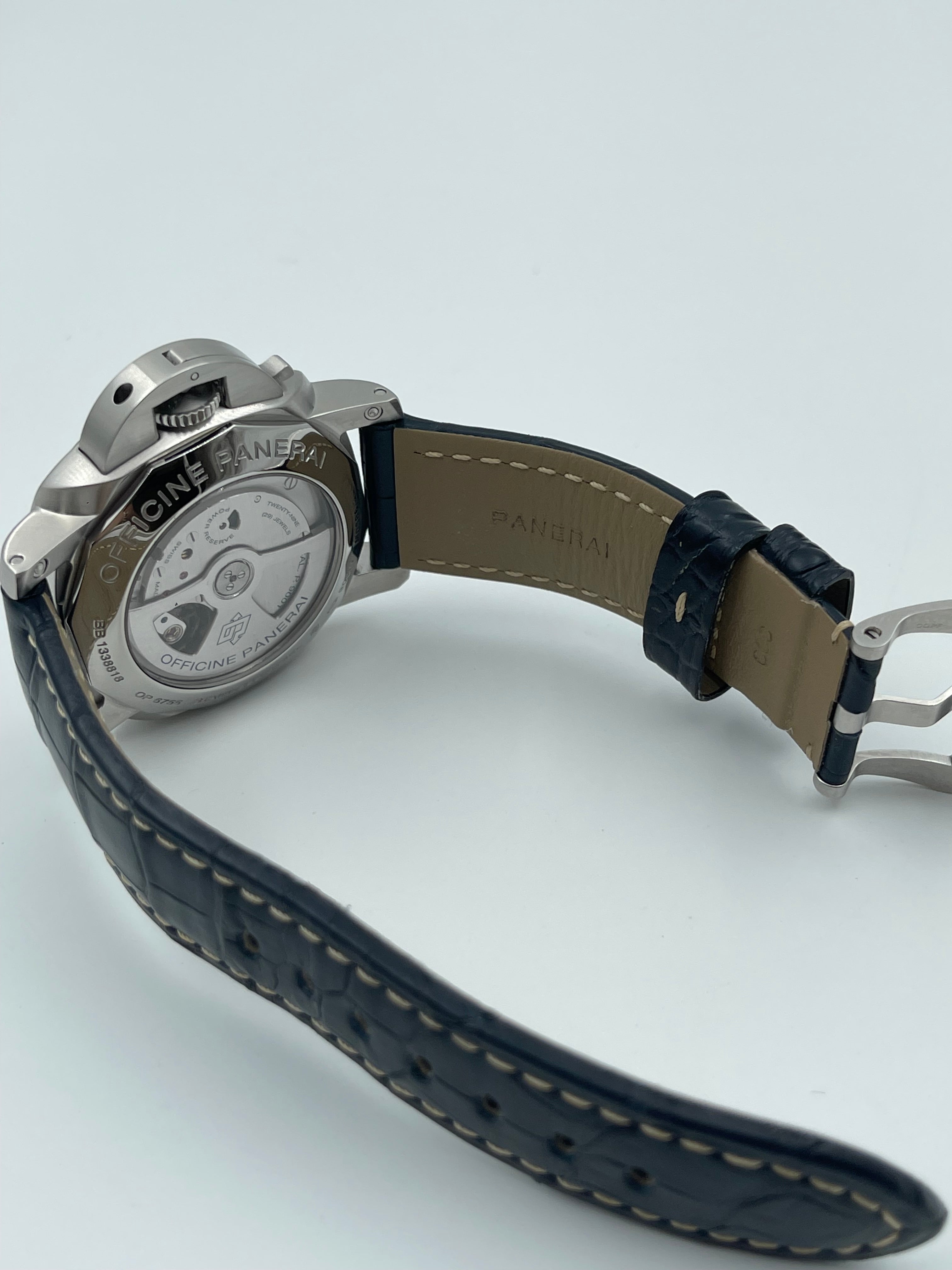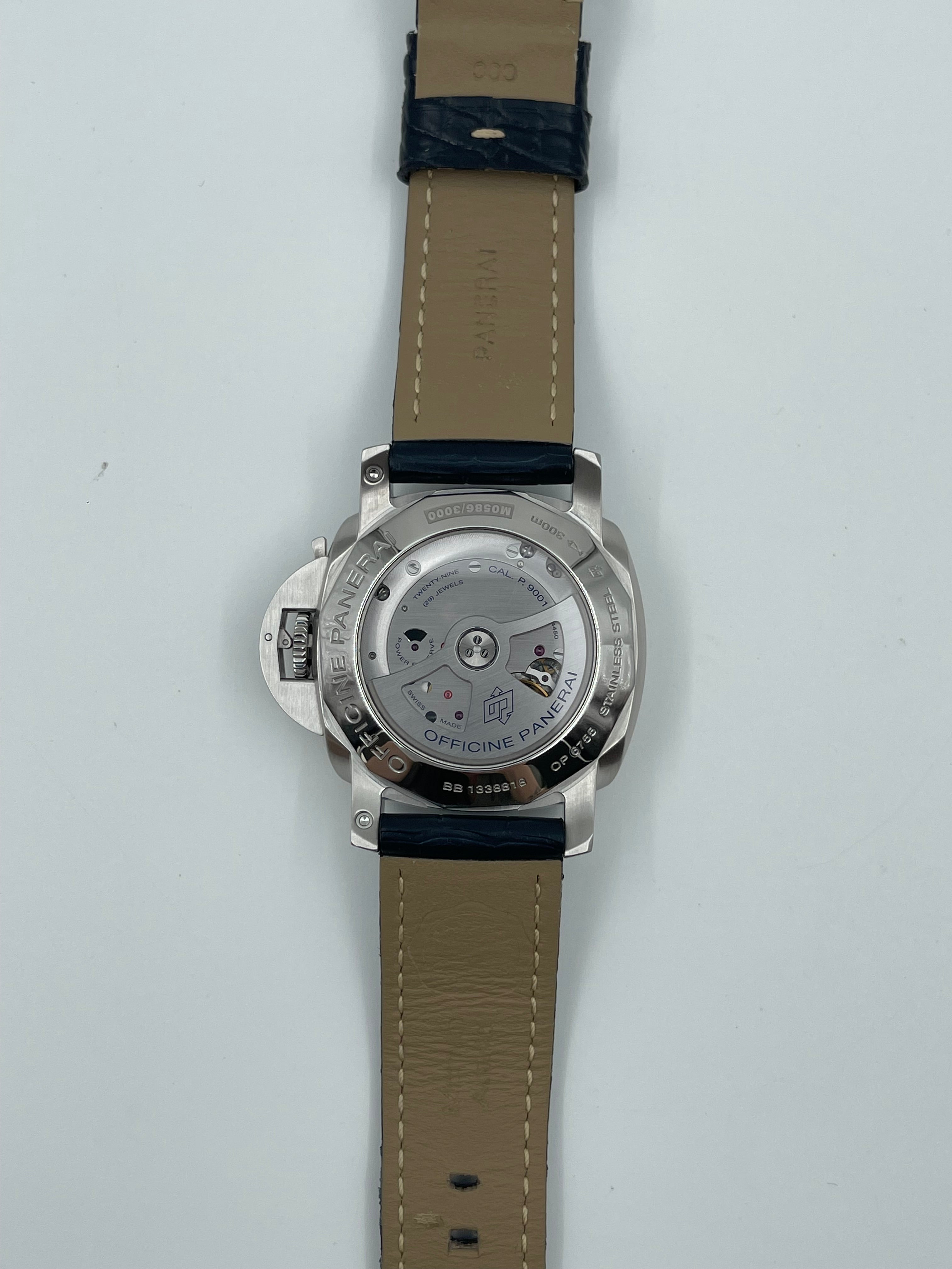 Functionally, the PAM00320 adds modern sophistication with its GMT complication, allowing for the tracking of a second time zone. The discreet 24-hour hand enhances the dial's clean aesthetic without overwhelming the classic layout. It also features a power reserve indicator on the caseback, showcasing the in-house P.9001 movement with a 3-day power reserve, visible through the sapphire crystal. This combination of traditional design with contemporary features makes it a versatile watch for both daily wear and travel.