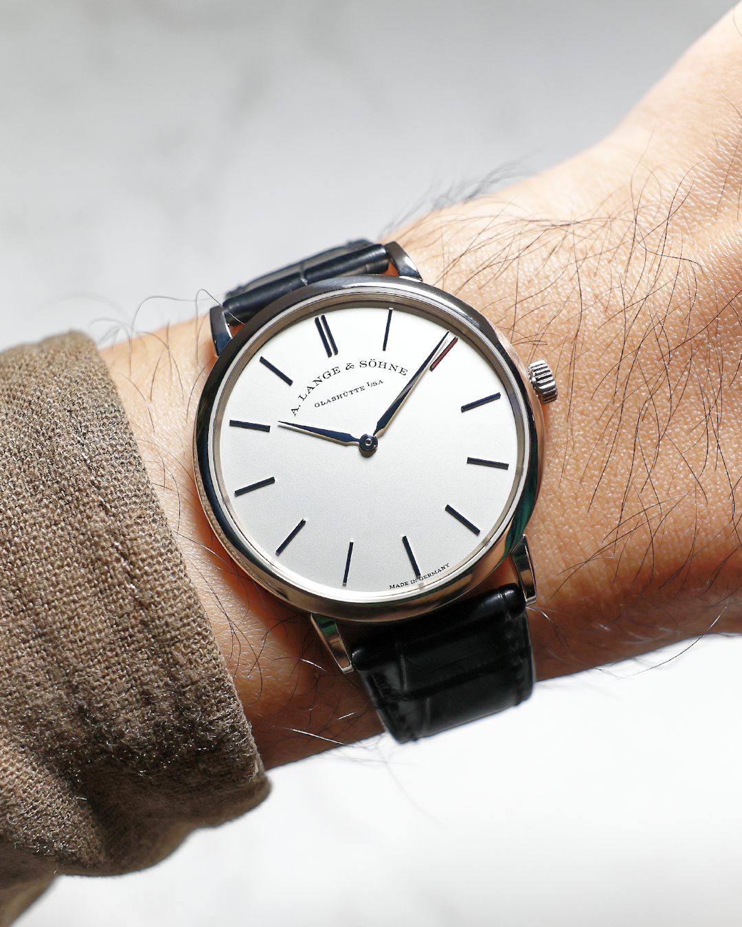 Powering the Saxonia Thin 37mm is the Lange calibre L093.1, a hand-wound movement measuring only 2.9mm thick. Despite its svelte profile, it offers an impressive 72-hour power reserve. Visible through the sapphire caseback, the movement is an artistic and mechanical marvel: German silver bridges, a hand-engraved balance cock, thermally blued screws, and exquisite striping are all hallmarks of Lange’s unmatched finishing. This movement doesn’t just perform to the highest standards; it also represents one of the most beautiful manual-wind calibres in haute horlogerie.