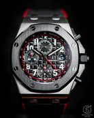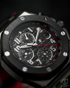 Its 42mm stainless steel case is fitted with a matching black ceramic bezel, black ceramic chronograph pushers, and a screw-down crown. The dial features AP’s iconic "Méga Tapisserie" pattern in black, with luminescent white gold hour markers and vivid red accents on the chronograph hands and sub-dial tracks. This aggressive, high-contrast design is beautifully echoed by the black rubber strap, which features distinct red inlays along the sides, enhancing the watch’s sporty tone while tying the entire aesthetic together.