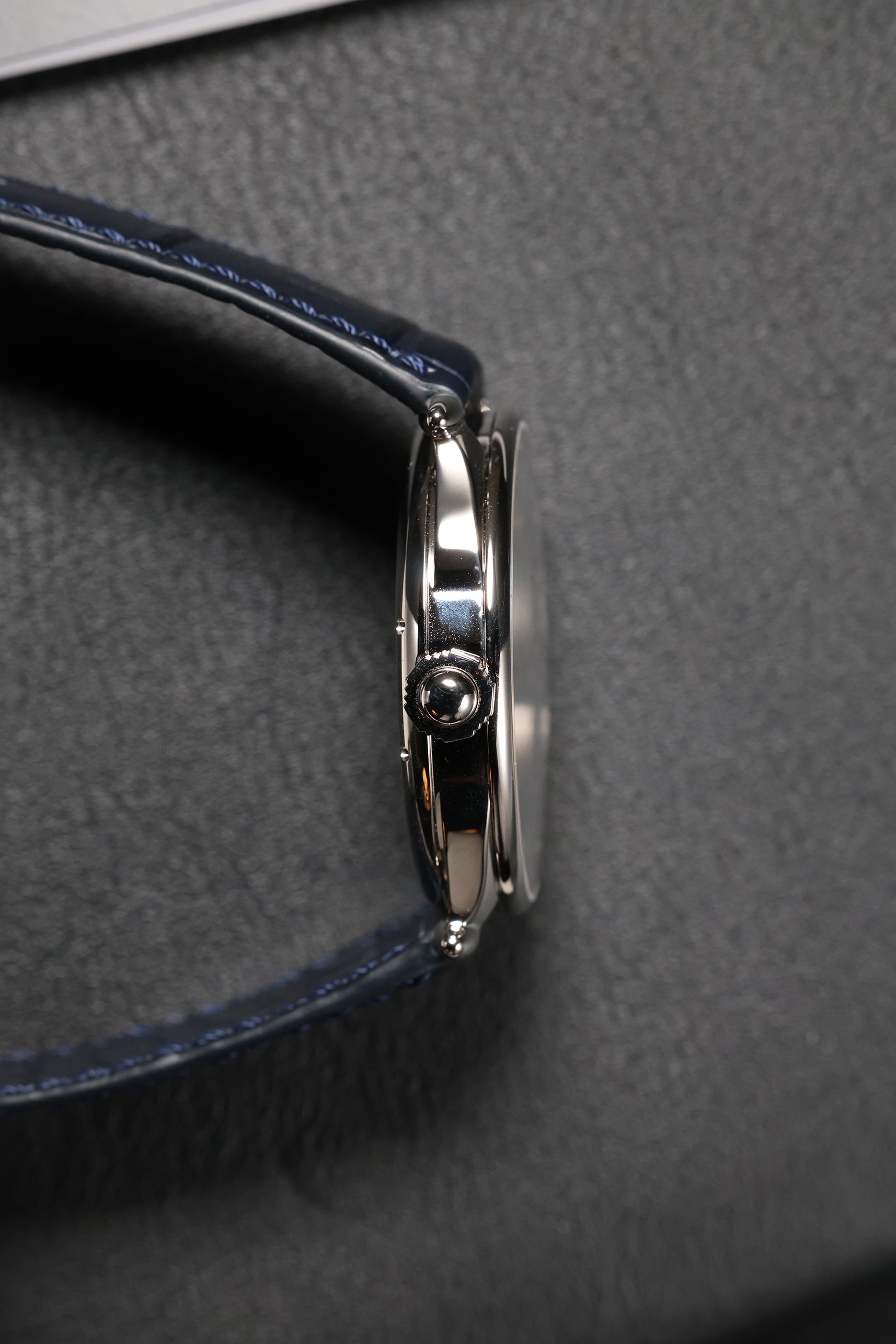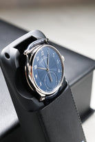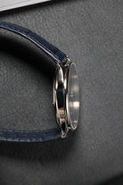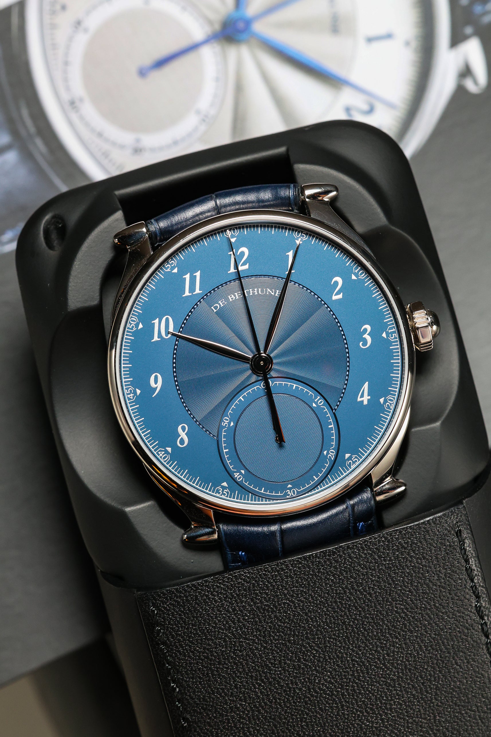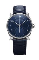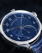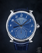 The dial is a breathtaking showcase of artistic craft, finished in a vibrant royal blue with a 12-sector guilloché pattern. This intricate engine-turning radiates from the center, creating a dynamic interplay of light that shifts from deep navy to brilliant azure with every movement of the wrist. Standing in refined contrast are the applied silver Arabic numerals and the elongated, leaf-shaped hands. At 6 o’clock, a dedicated sub-dial serves as an instantaneous 60-minute counter, featuring a barleycorn (grain d'orge) guilloché finish—a rare and functional detail that allows for precise, at-a-glance elapsed time tracking.