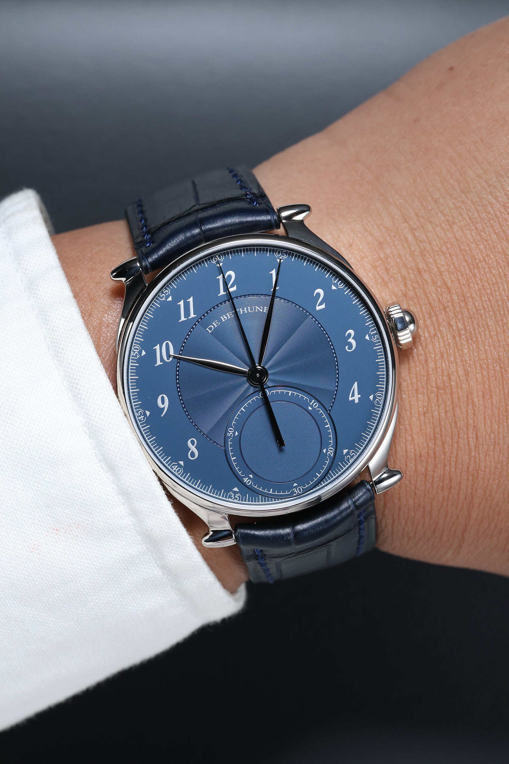 The case is crafted from polished Grade 5 titanium, measuring 42.4mm but wearing with surprising lightness and grace. It features De Bethune’s signature ogival (bullet-shaped) lugs, which provide an architectural frame that flows seamlessly into the strap. By utilizing titanium, De Bethune achieves a mirror-like luster that rivals precious metals while offering superior durability and comfort. The DB8REWS3 is more than a chronograph; it is a kinetic sculpture that proves high-complication watchmaking can be both incredibly sophisticated and remarkably clean in its execution.