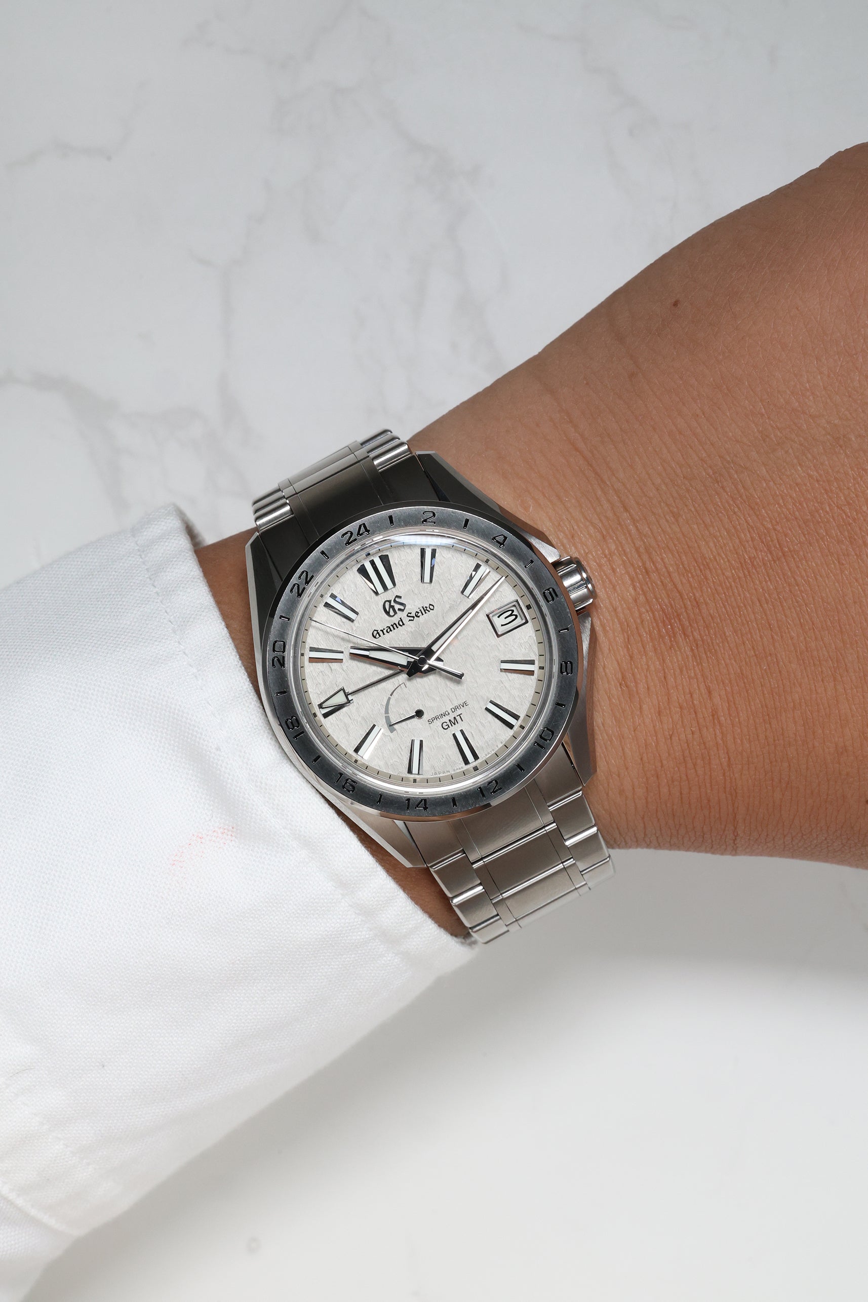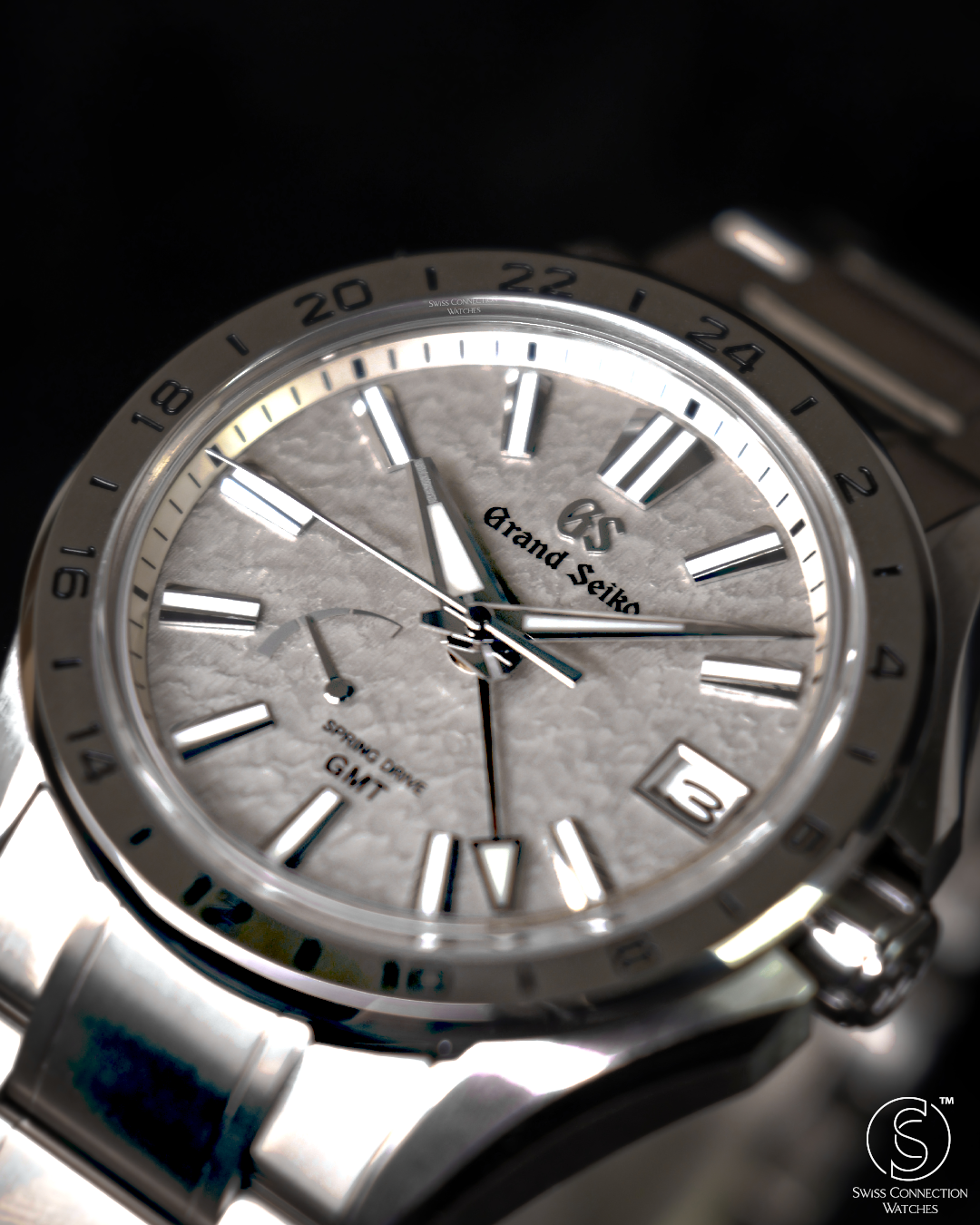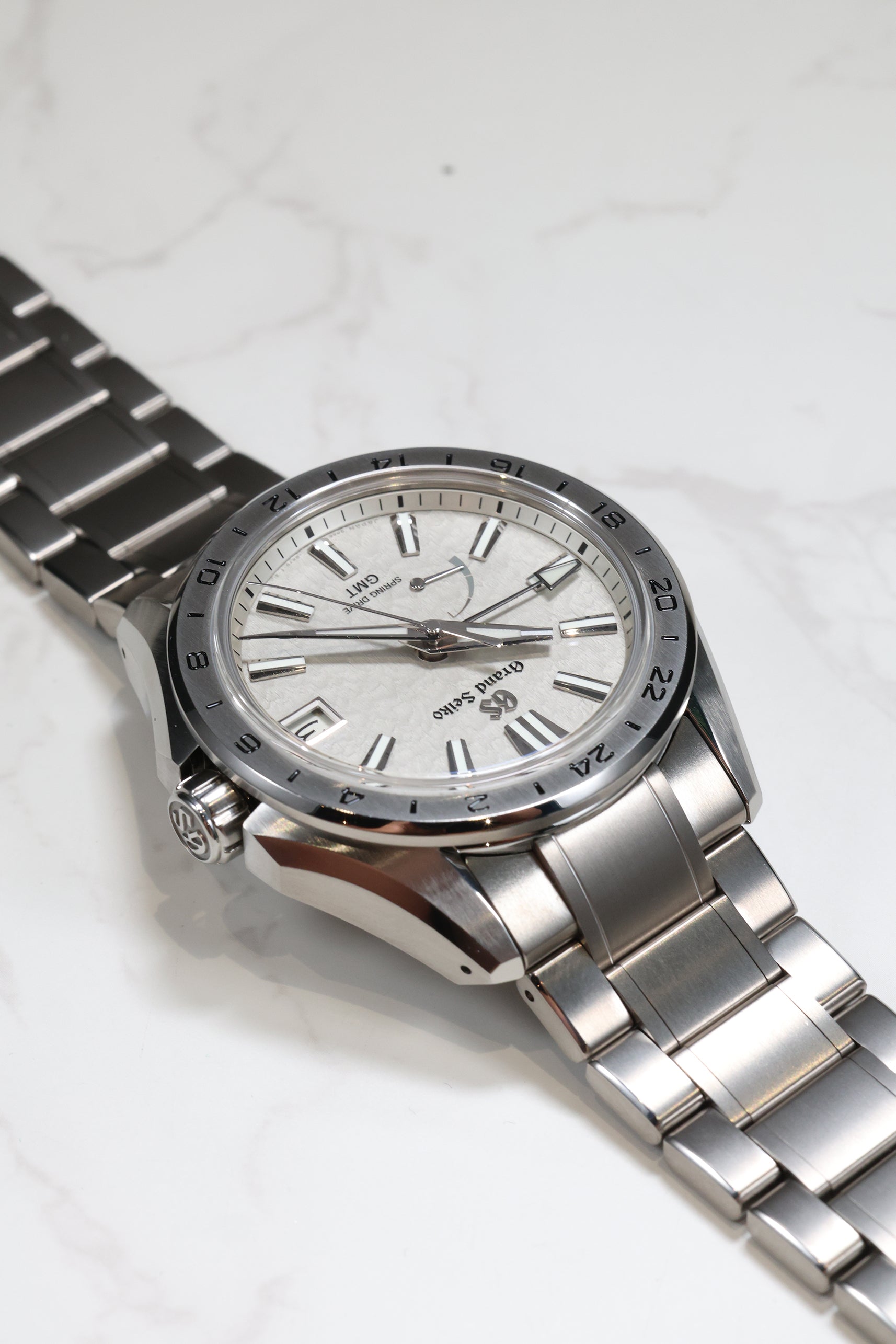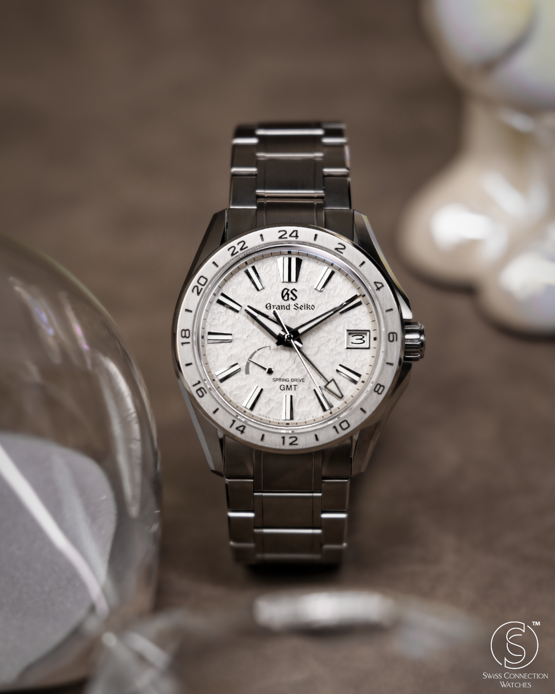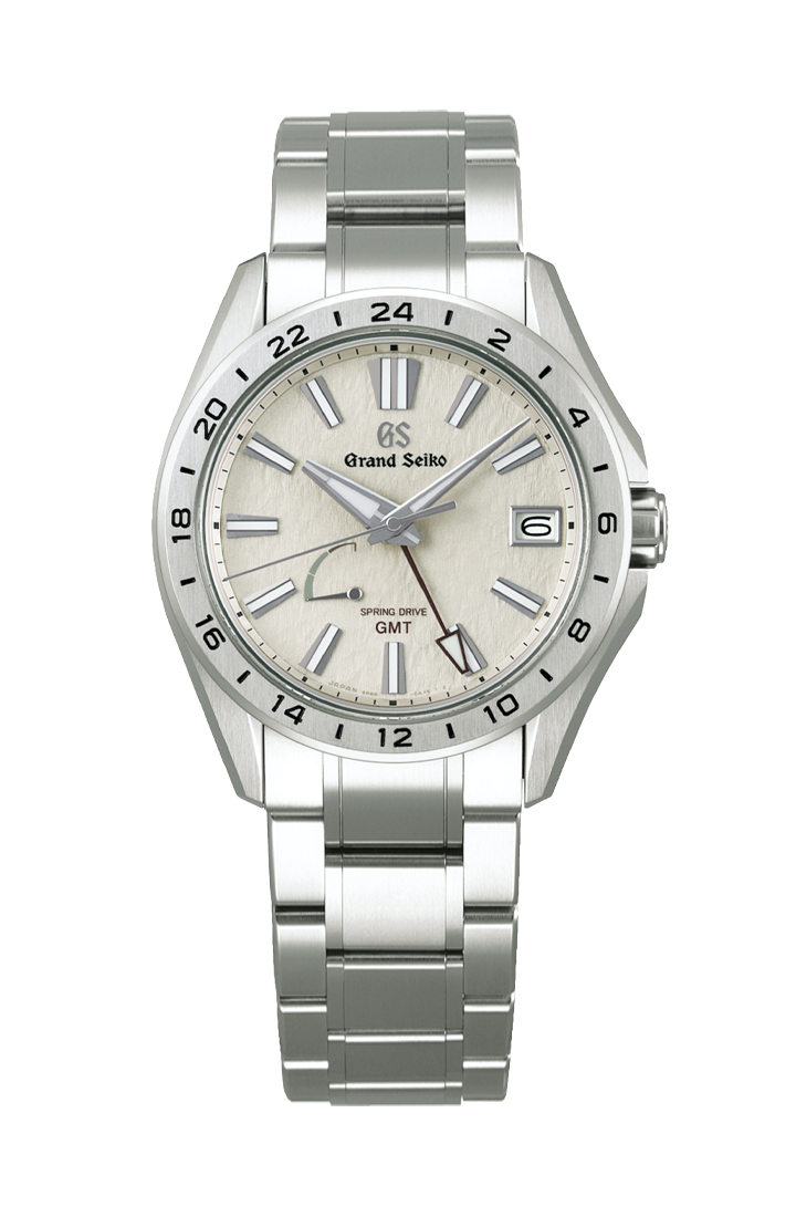 At the heart of its identity is the exquisite textured white dial, affectionately nicknamed the “Mist Flake” for its captivating resemblance to the soft, ephemeral haze that often blankets the Shinshu highlands in the early morning. Subtle yet rich in detail, this dial perfectly captures the fleeting stillness of Japanese landscapes, elevated by Zaratsu-polished hands and markers that catch and reflect light with crystalline clarity. A contrasting black GMT hand provides intuitive second time zone functionality, complemented by a discreet 24-hour inner ring and a power reserve indicator at 9 o’clock—all laid out with Grand Seiko’s signature precision and impeccable balance.