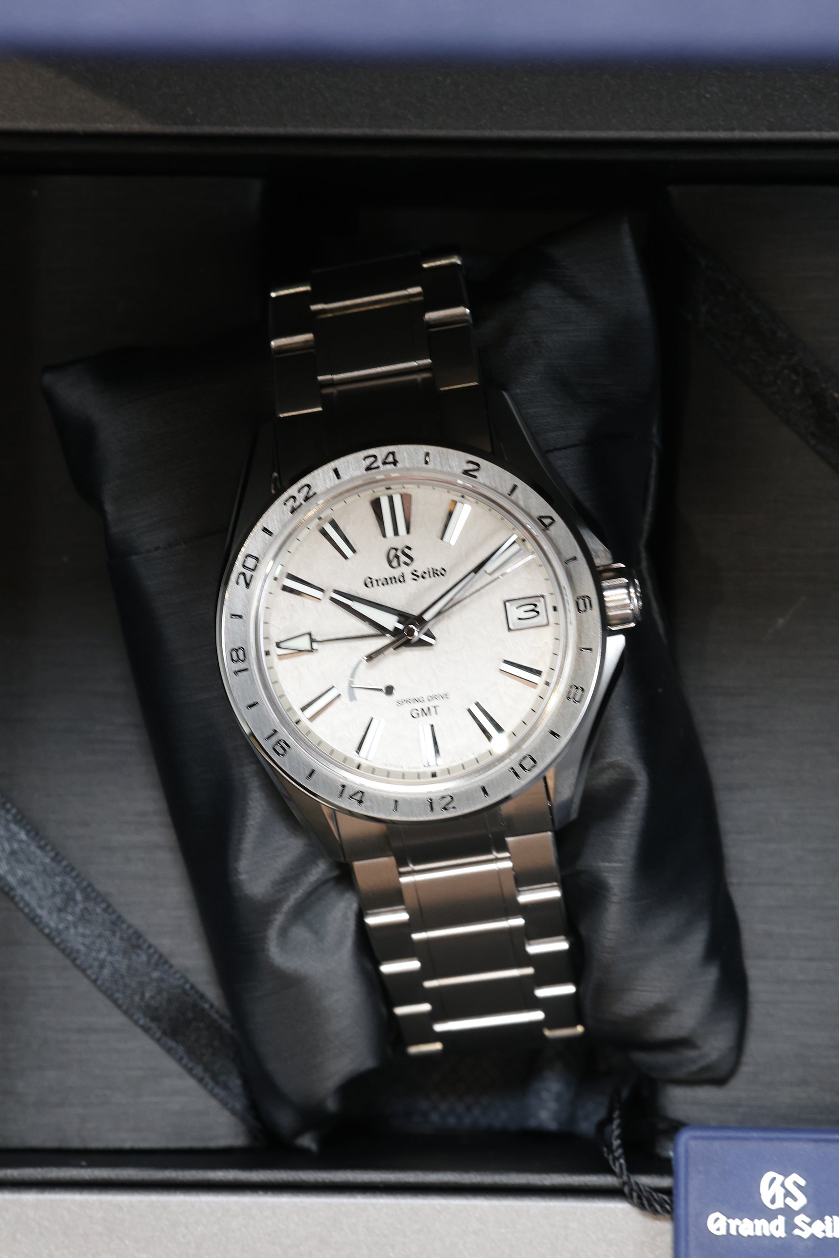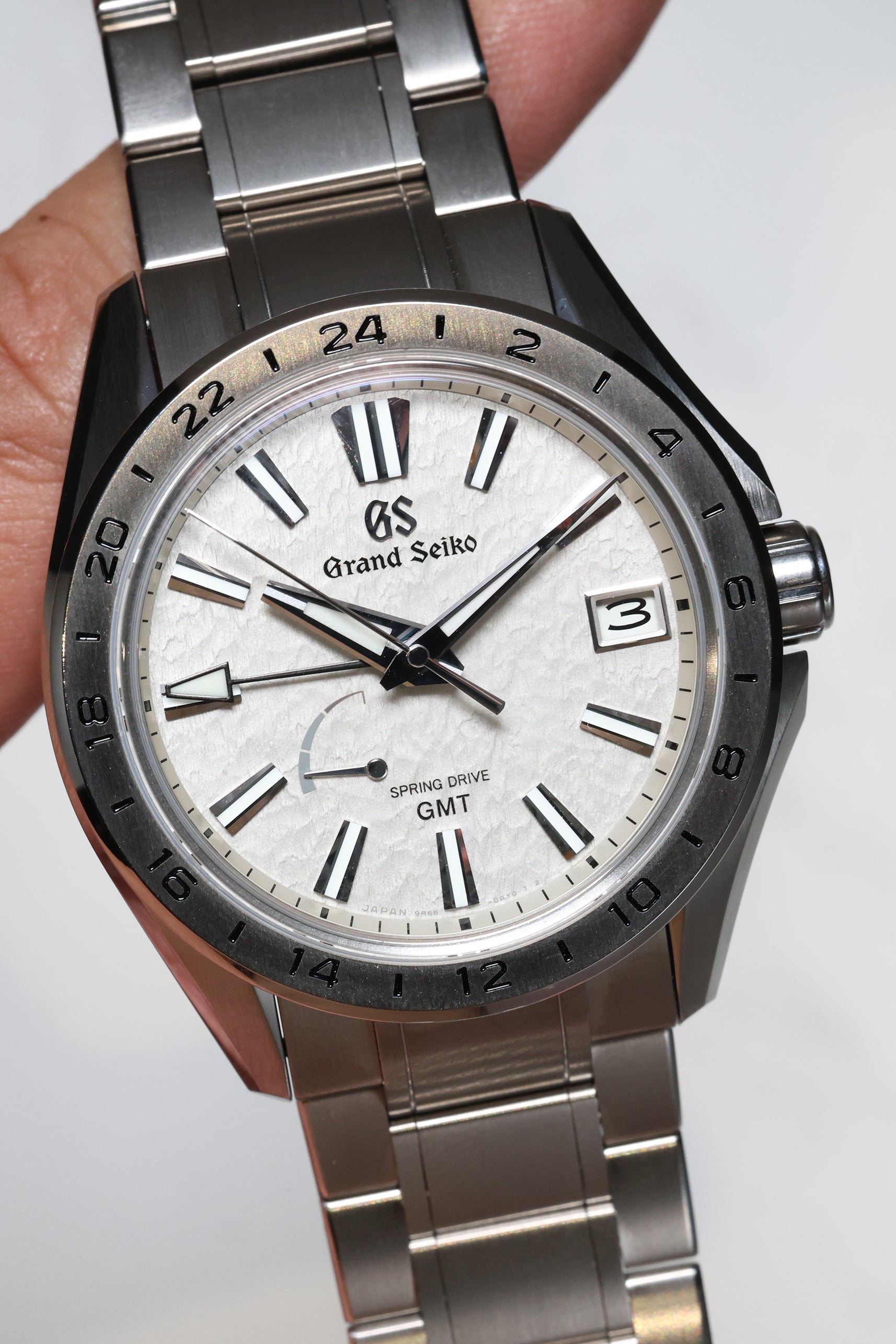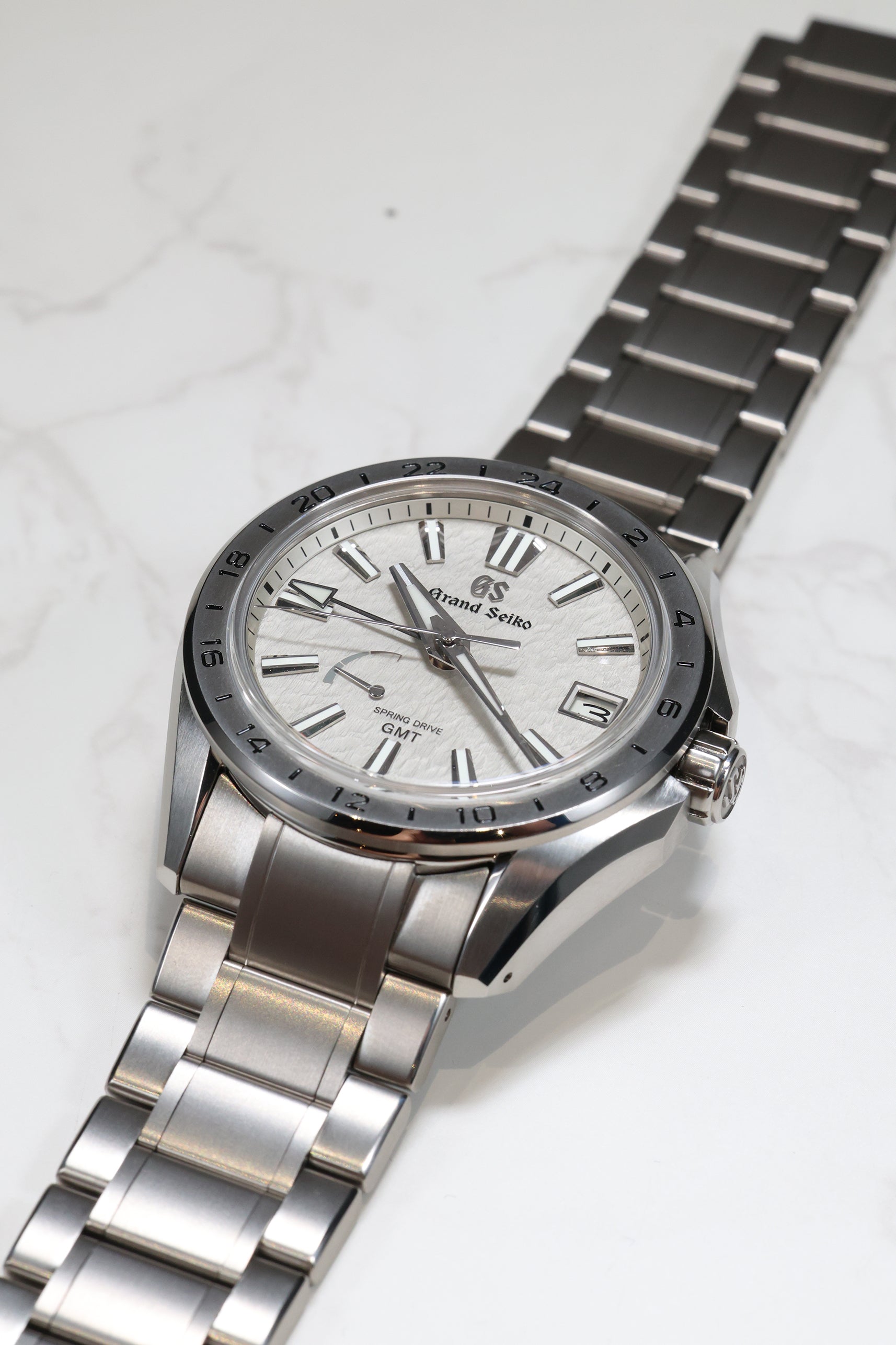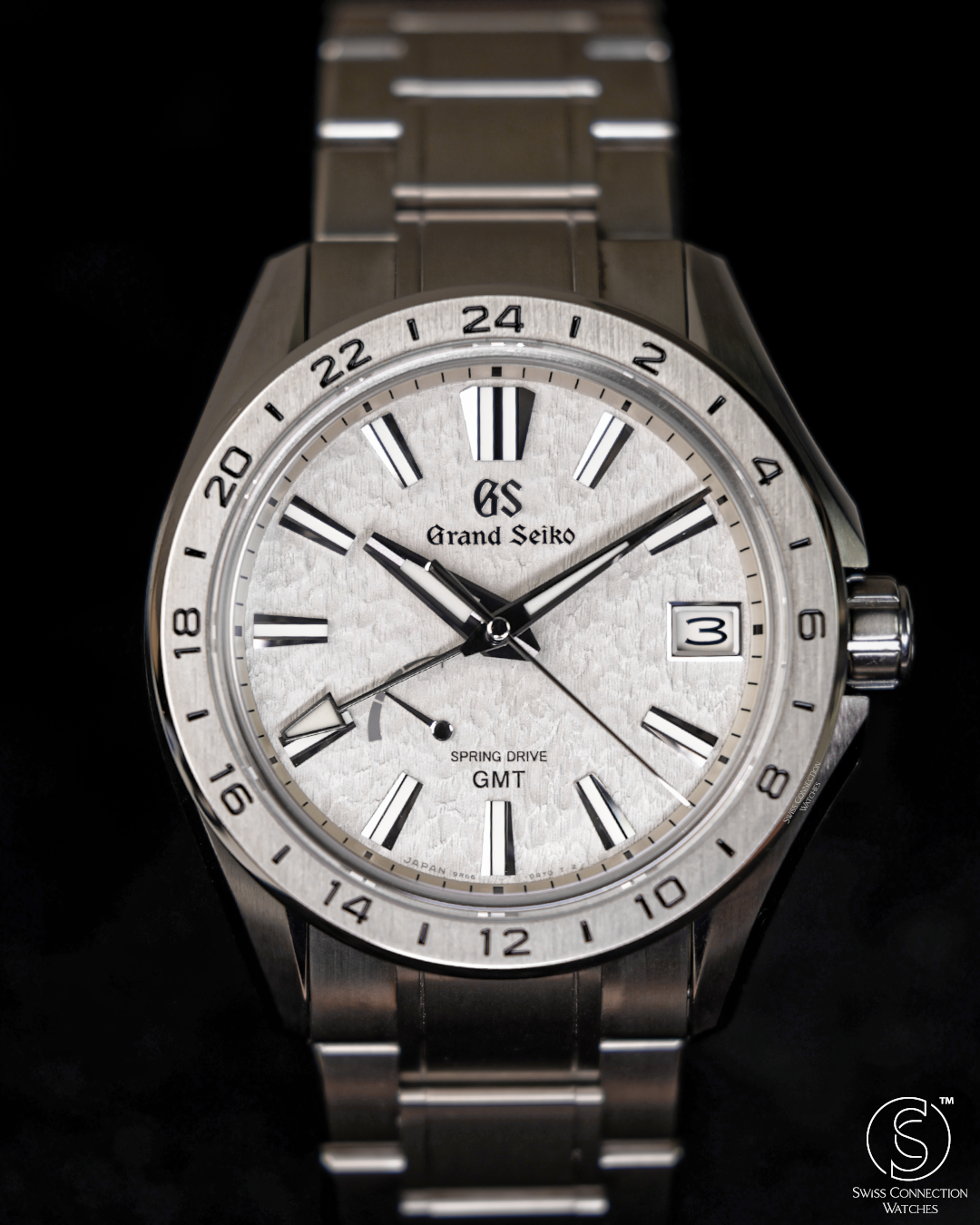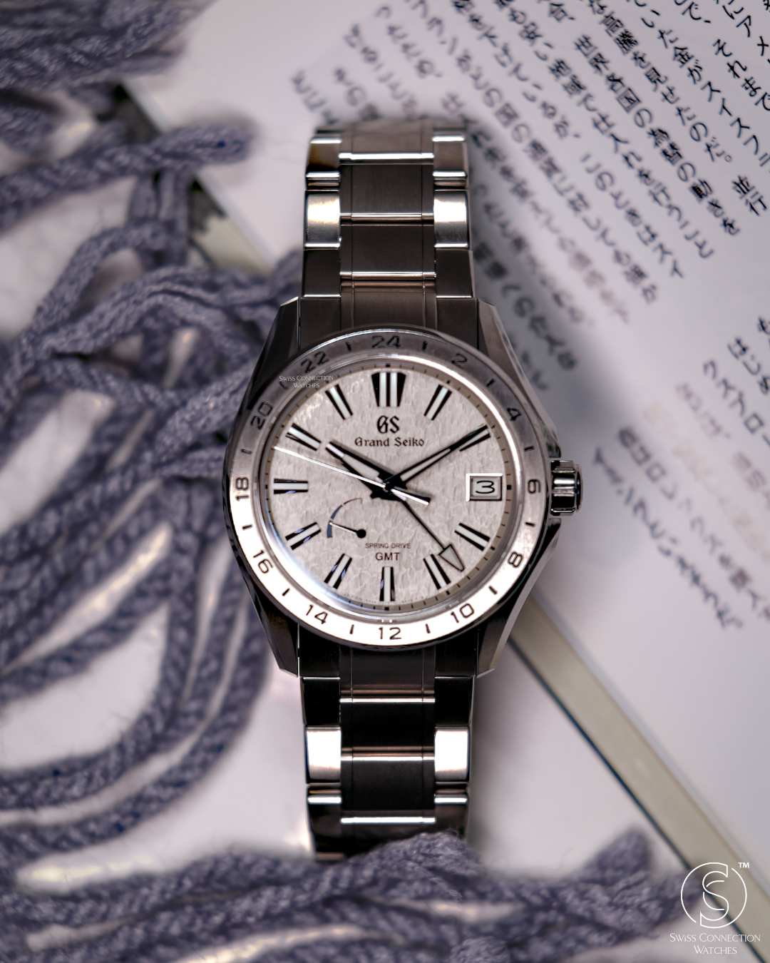 At the heart of its identity is the exquisite textured white dial, affectionately nicknamed the “Mist Flake” for its captivating resemblance to the soft, ephemeral haze that often blankets the Shinshu highlands in the early morning. Subtle yet rich in detail, this dial perfectly captures the fleeting stillness of Japanese landscapes, elevated by Zaratsu-polished hands and markers that catch and reflect light with crystalline clarity. A contrasting black GMT hand provides intuitive second time zone functionality, complemented by a discreet 24-hour inner ring and a power reserve indicator at 9 o’clock—all laid out with Grand Seiko’s signature precision and impeccable balance.