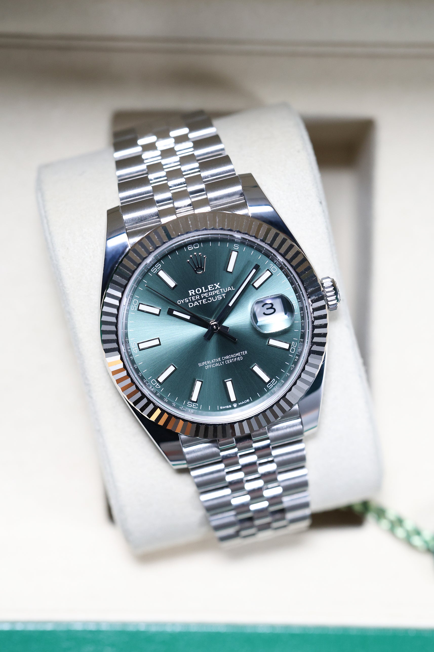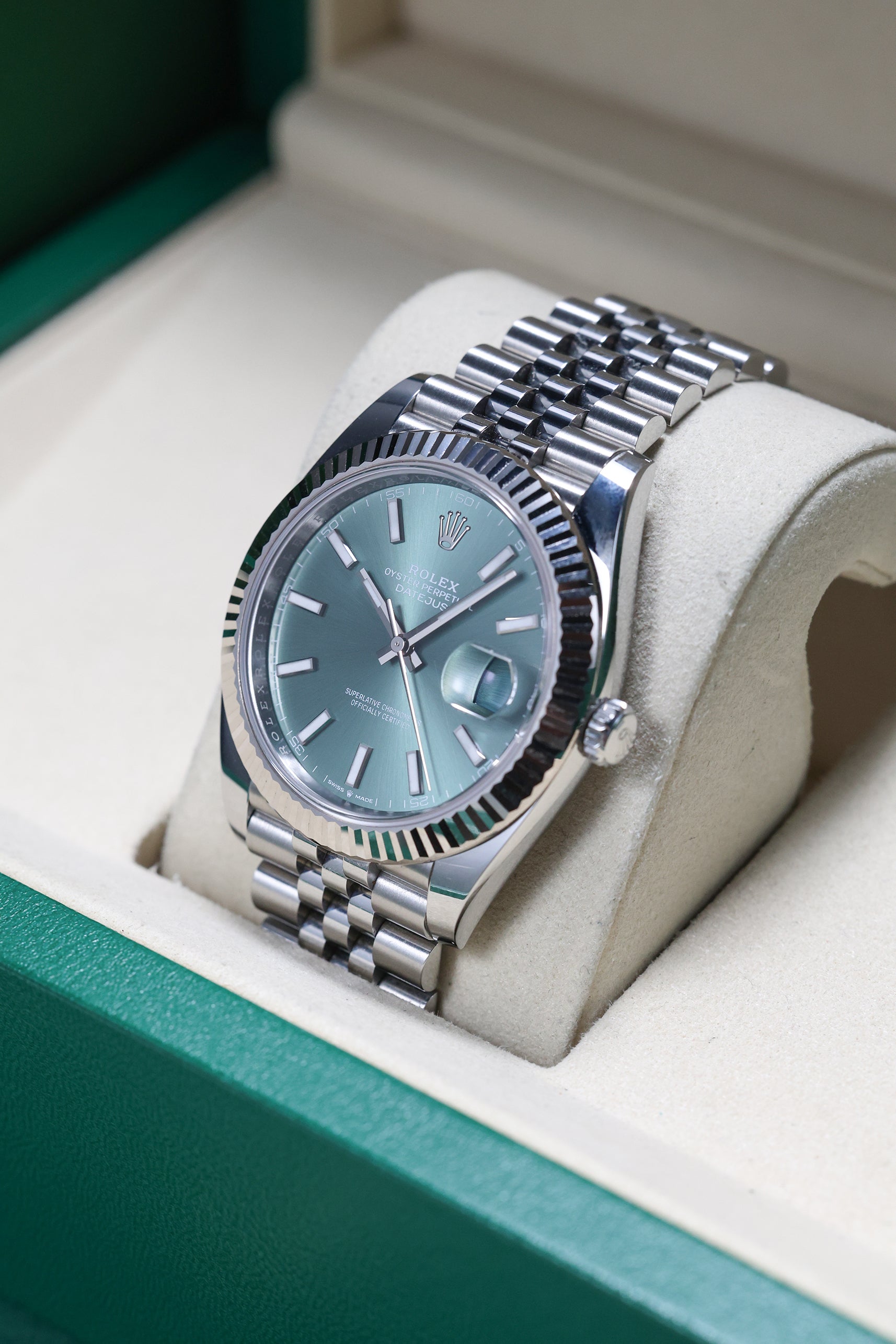 Powering this exquisite timepiece is Rolex's latest generation in-house automatic movement, the Calibre 3235. This mechanism ensures superior precision, durability, and reliability, all rigorously certified as a Superlative Chronometer. It boasts an impressive 70-hour power reserve and robust 100-meter water resistance. The Datejust 41mm in Mint Green is a dependable and versatile companion,